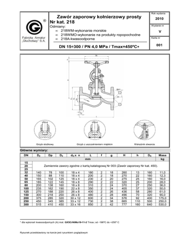 Rok wydania Zawór zaporowy kołnierzowy prosty Nr kat. 218 Odmiany: • 218WM-wykonanie morskie • 218WMO-wykonanie na produkty ropopochodne • 218A-kwasoodporne 2010 Wydanie nr V Karta nr 001 DN 15÷300 / PN 4,0 MPa / Tmax=450ºC∗ ∗ Grzyb stożkowy Grzyb z uszczelnieniem miękkim Wskaźnik otwarcia Główne wymiary: DN 15 20 25 32 40 50 65 80 100 125 150 200 250 300 DZ Dp D0 dO x n L mm f g H h DK Masa kg Zamiennie zawory zgodne z kartą katalogową Nr 003 (Zawór zaporowy Nr kat. 450). 140 150 165 185 200 235 270 300 375 450 515 78 88 102 122 138 162 188 218 285 345 410 100 110 125 145 160 190 220 250 320 385 450 18 x 4 18 x 4 18 x 4 18 x 8 18 x 8 22 x 8 26 x 8 26 x 8 30 x 12 33 x 12 33 x 16 180 200 230 290 310 350 400 480 600 730 850 2 2 2 2 2 2 2 2 2 2 2 18 18 20 22 24 24 26 28 34 38 42 * dla wykonań kwasoodpornych (A) mat. GX5CrNiMo19-11-2 Tmax; od -196ºC do +250º C Rysunek przedstawiony na karcie jest rysunkiem poglądowym 260 270 275 320 370 405 436 496 576 665 777 13 22 25 25 27 37 58 70 92 110 160 160 160 160 200 250 320 280 320 400 500 640 11,0 12,3 16,0 28,0 36,0 50,0 61,0 95,0 175,0 250,0 530,0 Zastosowanie: Zawory zaporowe kołnierzowe można montować w dowolnym położeniu na rurociągach, zwracając jedynie uwagę na prawidłowy kierunek przepływu czynnika, który powinien być zgodny z oznaczeniem na kadłubie. Zawory przeznaczone są do odcinania przepływu czynnika roboczego. Czynnik roboczy : Zawory przeznaczone są do wody, pary, oleju oraz innych neutralnych czynników ciekłych i gazowych w przedziale temperatur od –10 ºC do 450 ºC, w wykonaniu morskim „WM”- do pracy w warunkach morskich i do wody morskiej, w wykonaniu kwasoodpornym do czynników aktywnych chemicznie takich jak kwasy, zasady roztwory soli itp. w zakresie stężeń uwarunkowanych odpornością chemiczną materiałów użytych do budowy zaworów. Zakres stosowania : Ciśnienie nominalne PN [bar] GP240GH Największe ciśnienie robocze[w bar] przy temp. czynnika (ºC) - 10 do 120 ºC 40 200 ºC 35 250 ºC 32 GX5CrNiMo19-11-2 40 26 24 300 ºC 28 350 ºC 24 400 ºC 21 450 ºC 13 Szczegółowe informacje zawiera wykres „Dopuszczalne parametry robocze armatury dla stosowanych materiałów” (Układ p/t) w części IV katalogu. Materiały podstawowe: Nazwa części Kadłub Siedlisko kadłuba Pokrywa - DN 32-50 - DN 65-300 Trzpień Siedlisko grzyba -DN 32-50 -DN 65-80 -DN 100-300 Uszczelnienia standard GP240GH Materiał wykonanie WM i WMO GP240GH kwasoodporne GX5CrNiMo19-11-2 18-8 Cr-Ni 18-8 Cr-Ni GX5CrNiMo19-11-2 P250GH GP240GH X30Cr13 P250GH GP240GH X17CrNi16-2 X6CrNiMoTi17-12-2 ( X6CrNiTi18-10 ) GX5CrNiMo19-11-2 X6CrNiTi18-10 X30Cr13 X30Cr13 18-8 C r-Ni Grafit X17CrNi16-2 18-8 Cr-Ni 18-8 Cr-Ni Grafit 18-8 Cr-Ni 18-8 Cr-Ni 18-8 Cr-Ni Grafit Uwagi : 1. 2. 3. 4. 5. 6. 7. 8. Kołnierze zaworów wykonanie standard: z przylgą-„B1” i owiercenie wg PN-EN 1092-1.Na życzenie wykonujemy inne rodzaje przylgi zgodnie z: ANSI, BS, DIN lub też wg indywidualnych potrzeb klienta. Wykonujemy również zawory z kołnierzami na ciśnienia PN (0,6 ÷2,5) [MPa ]. Wymagania i badania techniczne zaworów wg PN-EN 12266-1. Klasa szczelności A wg PN-EN 12266-1. Długość budowy wg PN-EN 558. Świadectwo odbioru wg życzenia Klienta-wg PN-EN 10204. Kierunek przepływu czynnika: dla DN 32÷100 → pod grzyb, dla DN od 125 → na grzyb. Zawory w wykonaniu morskim- WM wykonujemy zgodnie z normą PN-W-74017. Na życzenie Klienta zawory mogą podlegać odbiorowi Towarzystw Klasyfikacyjnych: GL, LRS, BV, DNV, PMPC (RMRS), ABS, RINA. UWAGA – W zapytaniu / zamówieniu prosimy o podanie norm i typu przyłącza oraz medium i parametry pracy. Producent i dostawca: Fabryka Armatur „Głuchołazy” S.A. Adres: 48-340 Głuchołazy ul. Wrocławska 1A tel.: 077 / 439 19 44 fax: 077 / 439 19 46 e-mail: [email protected] http: www.fagsa.com.pl Producent zastrzega możliwość wprowadzenia zmian w wyrobach bez powiadamiania.
