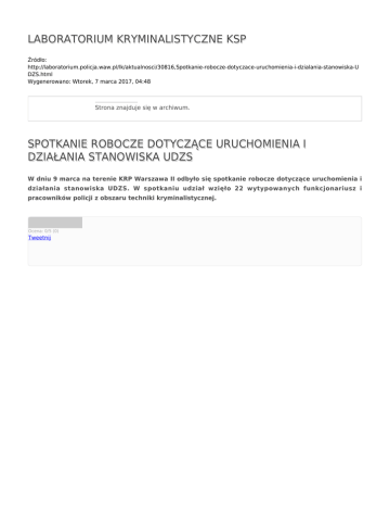 LABORATORIUM KRYMINALISTYCZNE KSP Źródło: http://laboratorium.policja.waw.pl/lk/aktualnosci/30816,Spotkanie-robocze-dotyczace-uruchomienia-i-dzialania-stanowiska-U DZS.html Wygenerowano: Wtorek, 7 marca 2017, 04:48 Strona znajduje się w archiwum. SPOTKANIE ROBOCZE DOTYCZĄCE URUCHOMIENIA I DZIAŁANIA STANOWISKA UDZS W dniu 9 marca na terenie KRP Warszawa II odbyło się spotkanie robocze dotyczące uruchomienia i działania stanowiska UDZS. W spotkaniu udział wzięło 22 wytypowanych funkcjonariusz i pracowników policji z obszaru techniki kryminalistycznej. Ocena: 0/5 (0) Tweetnij