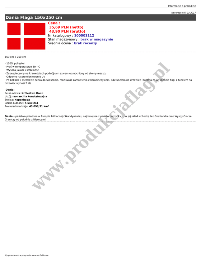 Informacje o produkcie Utworzono 07-03-2017 Dania Flaga 150x250 cm Cena : 35,69 PLN (netto) 43,90 PLN (brutto) Nr katalogowy : 100001112 Stan magazynowy : brak w magazynie Średnia ocena : brak recenzji 150 cm x 250 cm af la g .p l - 100% poliester - Prać w temperaturze 30 ° C - Wysoka jakość i stabilność - Zabezpieczony na krawedziach podwójnym szwem wzmocniony od strony masztu - Odporne na promieniowanie UV - Po bokach 3 metalowe oczka do wieszania, mozliwość zamówienia z karabinczykiem, lub tunelem na drzewiec (dopłata za wykonanie flagi z tunelem na drzewiec wynosi 2 zł) kc j -Dania: Pełna nazwa: Królestwo Danii Ustój: monarchia konstytucyjna Stolica: Kopenhaga Liczba ludności: 5 540 241 Powierzchnia kraju: 43 098,31 km² w w w .p ro du Dania – państwo położone w Europie Północnej (Skandynawia), najmniejsze z państw nordyckich. W jej skład wchodzą też Grenlandia oraz Wyspy Owcze. Graniczy od południa z Niemcami. Wygenerowano w programie www.oscGold.com