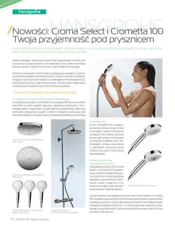 HANSGROHE / Nowości: Croma Select i Crometta 100 Twoja przyjemność pod prysznicem Nowa linia pryszniców Croma Select jest wyposażona w innowacyjną technologię Select zyskując intuicyjnie łatwy sposób wyboru strumienia za pomocą przycisku. Łatwa obsługa i atrakcyjne wzornictwo zapewniają komfort pod prysznicem w każdej łazience. W skład linii Croma Select wchodzą: głowice, główki, drążek prysznicowy oraz zestaw Showerpipe. Główki prysznicowe Croma Select występują w wersjach z jednym lub trzema rodzajami strumienia oraz w dwóch różnych kształtach; okrągłym (S) oraz czworokątnym z zaokrąglonymi krawędziami (E). Wszystkie produkty mają dwukolorowe wykończenia: białą tarczę prysznicową z dyszami oraz chromowaną obudowę. //Wszystkie elementy w jednym systemie: Komplet prysznicowy Croma Select Showerpipe Komplet prysznicowy Croma Select Showerpipe 180 łączy wszystkie elementy w jeden system: głowicę i główkę prysznicową z technologią Select, regulowany suwak główki prysznicowej, wąż oraz termostat Hansgrohe Ecostat Comfort. Komplet prysznicowy jest również dostępny w wersji z jednouchwytową baterią prysznicową. Crometta 100 W linii Crometta 100 występują również główki prysznicowe w wersjach z jednym lub trzema rodzajami strumienia, głowica górna oraz zestaw Showerpipe w wariancie z baterią oraz z termostatem. Zmiana strumienia w główkach prysznicowych odbywa się przez obrót tarczy strumieniowej. Głowica prysznicowa Croma Select E biały/chrom Łatwe czyszczenie i oszczędność wody Wszystkie produkty z linii Croma Select i Crometta 100 wyposażone są w technologię Hansgrohe QuickClean, która zapobiega osadzaniu się kamienia. Ewentualne osady mogą być z łatwością usunięte z silikonowych dysz poprzez potarcie palcem. Głowica prysznicowa Croma Select S biały/chrom Główki prysznicowe Croma Select S (Basic, Vario, Multi) 18 / tadmar partner Komplet prysznicowy Croma Select S 180 Showerpipe Główki prysznicowe Crometta 100 Zarówno główki jak i głowice prysznicowe Croma Select i Crometta 100 dostępne są w wersji EcoSmart. Połączenie systemu ograniczenia przepływu wody ze zoptymalizowaną tarczą strumieniową pozwala zmniejszyć przepływ do 6 l/min. To z kolei zapewnia mniejsze zużycie energii na ogrzanie wody czyli oszczędność finansową oraz ochronę zasobów naturalnych.