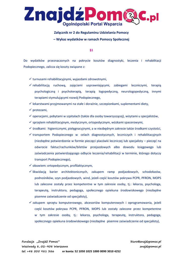 Załącznik nr 2 do Regulaminu Udzielania Pomocy – Wykaz wydatków w ramach Pomocy Społecznej §1 Do wydatków przeznaczonych na pokrycie kosztów diagnostyki, leczenia i rehabilitacji Podopiecznego, zalicza się koszty związane z: turnusami rehabilitacyjnymi, wyjazdami zdrowotnymi, rehabilitacją ruchową, zajęciami psychologiczną i psychoterapią, usprawniającymi, terapią zabiegami leczniczymi, terapią logopedyczną, neurologopedyczną, innymi terapiami stymulującymi rozwój Podopiecznego, lekarstwami przyjmowanymi na stałe i doraźnie, szczepionkami, suplementami diety, protezami, operacjami, pobytami w szpitalach (także dla osoby towarzyszącej), wizytami u specjalistów, sprzętem rehabilitacyjnym, medycznym, ortopedycznym, wózkami spacerowymi, środkami: higienicznymi, pielęgnacyjnymi, a w niezbędnym zakresie także środkami czystości, transportem Podopiecznego w celach diagnostycznych, leczniczych i rehabilitacyjnych (niezbędne potwierdzenie w formie pieczęci placówki leczniczej lub specjalisty – pieczęć na odwrocie faktur/rachunków/biletów przejazdowych albo dowodu księgowego lub zaświadczenia potwierdzającego odbycie leczenia/rehabilitacji w terminie, którego dotyczy transport Podopiecznego), obuwiem: ortopedycznym, profilaktycznym, likwidacją barier architektonicznych, zakupem ramp podjazdowych, schodołazów, podnośników, szyn podjazdowych, wind, jeżeli część kosztów pokrywa PCPR, PFRON, MOPS lub zalecone zostały przez kompetentne w tym zakresie osoby, tj.: lekarza, psychologa, terapeutę, instruktora, pedagoga, społecznego opiekuna środowiskowego (niezbędne pisemne zaświadczenie od specjalisty), zakupem sprzętu komputerowego, akcesoriów komputerowych i oprogramowania, jeżeli część kosztów pokrywa PCPR, PFRON, MOPS lub zostały zalecone przez kompetentne w tym zakresie osoby, tj.: lekarza, psychologa, terapeutę, instruktora, pedagoga, społecznego opiekuna środowiskowego (niezbędne pisemne zaświadczenie od specjalisty), Fundacja „Znajdź Pomoc” [email protected] Woziwody 8, 02-908 Warszawa tel. +48 505 981 386 nr konta: 52 1050 1025 1000 0090 3010 4252 znajdzpomoc.pl sprzętem sportowym typu bieżnia, rower, trampolina itp., zalecanym przez kompetentne w tym zakresie osoby, tj.: lekarza, psychologa, terapeutę, instruktora, pedagoga, społecznego opiekuna środowiskowego (niezbędne pisemne zaświadczenie od specjalisty), zakupem zwierząt do terapii, a także ich utrzymaniem i szkoleniami, zaleconym przez kompetentne, w tym zakresie osoby, tj.: lekarza, psychologa, terapeutę, instruktora, pedagoga, społecznego opiekuna środowiskowego (niezbędne pisemne zaświadczenie od specjalisty), specjalistycznymi dietami (np. bezglutenową, bezmleczną), pomocami dydaktycznymi, edukacją Podopiecznego (w tym opłatami za przedszkole, studia, kursy podnoszące kwalifikacje Podopiecznego), usługami opiekuńczymi. §2 Do wydatków przeznaczonych na pokrycie kosztów poprawy warunków socjalno-bytowych Podopiecznego zalicza się koszty związane z poprawą bytu materialnego, zdrowia i higieny Podopiecznego, o ile związane są z zaspokajaniem indywidualnych potrzeb Podopiecznego, o których mowa w ustawie z dnia 12 marca 2004 roku o pomocy społecznej (t. j. Dz. U. z 2013r. poz.182 ze zm.). Zgodnie z w/w ustawą o pomocy społecznej, pomoc społeczna jest instytucją polityki społecznej państwa, mającą na celu umożliwienie osobom i rodzinom przezwyciężanie trudnych sytuacji życiowych, których nie są one w stanie pokonać, wykorzystując własne uprawnienia, zasoby i możliwości. Pomoc społeczna wspiera osoby i rodziny w wysiłkach zmierzających do zaspokojenia niezbędnych potrzeb i umożliwia im życie w warunkach odpowiadających godności człowieka. Pomocy społecznej udziela się osobom i rodzinom w szczególności z powodu: ubóstwa, sieroctwa, bezdomności, bezrobocia, niepełnosprawności, długotrwałej lub ciężkiej choroby, przemocy w rodzinie, (…) potrzeby ochrony macierzyństwa lub wielodzietności, bezradności w sprawach opiekuńczo-wychowawczych i prowadzenia gospodarstwa domowego, zwłaszcza w rodzinach niepełnych lub wielodzietnych (…). Wydatki, o których mowa powyżej , których kwota przekracza jednorazowo 500zł, należy zgłaszać do Fundacji „Znajdź Pomoc” w formie pisemnego podania o refundację, w celu uzyskania akceptacji Zarządu Fundacji na całościowy bądź częściowy zwrot kosztów. Dopiero po uzyskaniu akceptacji Zarządu Fundacji, można przesyłać odpowiednie dokumenty potwierdzające dokonanie zgłoszonego wydatku. Fundacja „Znajdź Pomoc” [email protected] Woziwody 8, 02-908 Warszawa tel. +48 505 981 386 nr konta: 52 1050 1025 1000 0090 3010 4252 znajdzpomoc.pl Akceptuję zasady opisane w Załączniku nr 2 do Regulaminu Udzielania Pomocy ……………………………………………………………………………. (data i podpis Podopiecznego/prawnego Opiekuna) Fundacja „Znajdź Pomoc” [email protected] Woziwody 8, 02-908 Warszawa tel. +48 505 981 386 nr konta: 52 1050 1025 1000 0090 3010 4252 znajdzpomoc.pl