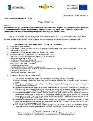 Kędzierzyn - Koźle, dnia 10.10.2011r. Znak sprawy: MOPS/341/RC/2/2011 Rozeznanie cenowe Dotyczy: Świadczenie usług z zakresu trenera kompetencji dla uczestników projektu Program aktywizacji społeczno – zawodowej bezrobotnych „Nowe Szanse” współfinansowanego przez Unię Europejską ze środków Europejskiego Funduszu Społecznego Programu Operacyjnego Kapitał Ludzki Zgodnie z wnioskiem projektu oraz planem zamówień publicznych MOPS w trybie rozeznania cenowego Miejski Ośrodek Pomocy Społecznej zleci przeprowadzenie warsztatów zakresu kompetencji i umiejętności społecznych. I. Określenie przedmiotu oraz wielkości lub zakresu zamówienia: 1. Liczba uczestników: 40 osób. 2. Liczba godzin dydaktycznych wynosi: min. 72 godziny spotkań grupowych w grupach po 20 osób; każda grupa 6 treningów po 6 godzin 3. Miejsce realizacji: sala w obiekcie DDP 5 w Kędzierzynie - Koźlu. 4. Termin realizacji: od 17 październik 2011 do 30 listopada 2011r. 5. Zakres merytoryczny treningów musi obejmować w szczególności: - komunikacja interpersonalna - zachowania alternatywne do agresji - świadomość swoich słabych i mocnych stron - świadomość swoich emocji, empatia - rozwiązywanie konfliktów - umiejętności niezbędne w codziennej egzystencji: np. planowanie, gospodarka wydatkami, współżycie z sąsiadami, higiena, szukanie pracy, itp. - umiejętność pracy w grupie - umiejętność organizacji czasu pracy 6. Obowiązki wykonawcy do wszystkich zadań: 1) Zamawiający nie dopuszcza możliwości prowadzenia konsultacji metodą e- learningu. 2) Miejsce realizacji zamówienia: zaleca się, aby konsultacje odbywały się na terenie miasta Kędzierzyn Koźle. 3) Wykonawca zobowiązany jest załączyć do oferty wstępne: Programy merytoryczne treningów z uwzględnieniem czasu trwania. 4) Wykonawca zobowiązany jest do prowadzenia dokumentacji (w tym również fotograficznej): dzienna lista obecności dla uczestników. Dokumenty powinny być opatrzone podpisem osoby prowadzącej oraz wykonawcy. Wzór w/w listy Zamawiający udostępni Wykonawcy przed rozpoczęciem konsultacji. 5) Wykonawca przekaże Zamawiającemu oryginały całości dokumentacji konsultacji w terminie 7 dni od ich zakończenia. Dokumentacja powinna być oznakowana zgodnie z wytycznymi dotyczącymi oznaczania projektów w ramach Programu Operacyjnego Kapitał Ludzki 2007 – 2013 zamieszczonymi na stronie www.efs.gov.pl, zakładka Zasady promocji. 6) Wykonawca zobowiązany jest do sprawowania nadzoru nad frekwencją uczestników konsultacji, a także bieżącego informowania Zamawiającego (pracownika socjalnego) o każdej nieobecności osoby, która planowo powinna uczestniczyć w zajęciach. 7) Wykonawca umożliwić pracownikom Zamawiającego przeprowadzenie kontroli prawidłowości realizacji zajęć oraz poddać się ewentualnej kontroli Instytucji Wdrażającej (Wojewódzki Urząd Pracy w Opolu), a „Człowiek – najlepsza inwestycja” Projekt p.n. Program aktywizacji społeczno – zawodowej bezrobotnych „Nowe Szanse” współfinansowany przez Unię Europejską w ramach Europejskiego Funduszu Społecznego także udzielać stosownych wyjaśnień w obszarze związanym z przedmiotem zamówienia, na każde jej żądanie. 8) Zamawiający zapłaci za faktyczną (zrealizowaną) liczbę godzin (zegarowych) konsultacji z uczestnikami projektu. II. Wspólny Słownik Zamówień (CPV): 85320000-8-Usługi społeczne 80510000-2 Usługi szkolenia specjalistycznego III. Termin wykonania zamówienia. Wymagany termin wykonania zamówienia: usługi objętej przedmiotem zamówienia realizowane będą w terminie od dnia zawarcia umowy do 30.11.2011 r. Dokładny harmonogram konsultacji - usług ustalony zostanie z wykonawcą, który złoży najkorzystniejszą ofertę. IV. Osoby upoważnione do porozumiewania się z wykonawcami. Osobami uprawnionymi do porozumiewania się z wykonawcami będą: Katarzyna Weklicz – Koordynator projektu – tel. 77 483-20-63 wew. 31 V. Termin składania wniosków o dopuszczenie do udziału w postępowaniu lub ofert. Oferty należy składać w sekretariacie MOPS K – Koźle do dnia 14.10.2011r do godz. 9:00 VI. Sposób realizacji usługi. Z realizatorem usługi zostanie podpisana umowa zlecenie. „Człowiek – najlepsza inwestycja” Projekt p.n. Program aktywizacji społeczno – zawodowej bezrobotnych „Nowe Szanse” współfinansowany przez Unię Europejską w ramach Europejskiego Funduszu Społecznego