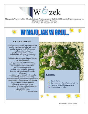 W zek Miesięcznik Wychowanków Ośrodka Szkolno-Wychowawczego dla Dzieci i Młodzieży Niepełnosprawnej im. Zbigniewa Tylewicza w Poznaniu, nr 56-57 (66-67) maj-czerwiec 2013 SPRAWIEDLIWOŚĆ Gdyby wszyscy mieli po cztery jabłka gdyby wszyscy byli silni jak konie gdyby wszyscy byli jednakowo bezbronni w miłości gdyby każdy miał to samo nikt nikomu nie byłby potrzebny Dziękuję Ci że sprawiedliwość Twoja jest nierównością to co mam i to czego nie mam nawet to czego nie mam komu dać zawsze jest komuś potrzebne jest noc żeby był dzień ciemno żeby świeciła gwiazda jest ostatnie spotkanie i rozłąka pierwsza modlimy się bo inni się nie modlą wierzymy bo inni nie wierzą umieramy za tych co nie chcą umierać kochamy bo innym serce wychłódło list przybliża bo inny oddala nierówni potrzebują siebie im najłatwiej zrozumieć że każdy jest dla wszystkich i odczytywać całość W numerze: Dzień Matki Zakończenie roku szkolnego tuż, tuż Humor z zeszytów uczniowskich Z bibliotecznej półki… Jan Twardowski Projekt okładki – Sylwester Warański Dzień Matki – wyjątkowy dzień w roku... Święto obchodzone corocznie jako wyraz szacunku dla wszystkich matek. Dokładna data przypadania Dnia Matki zależy od kraju, w którym jest świętowany. W Polsce święto to przypada na 26 maja. Początki święta sięgają czasów starożytnych Greków i Rzymian. Kultem otaczano wtedy matki-boginie, symbole płodności i urodzaju. Zwyczaj powrócił w siedemnastowiecznej Anglii pod nazwą niedziela u matki i początkowo oznaczał wizytę w katedrze. Dzień, w którym obchodzono to święto, był wolny od pracy. Do tradycji należało składanie matce podarunków, głównie kwiatów i słodyczy, w zamian za otrzymane błogosławieństwo. Zwyczaj przetrwał do ok. XIX wieku. Ponownie zaczęto go obchodzić po zakończeniu II wojny światowej. Inaczej historia tego święta przedstawia się w Stanach Zjednoczonych. W 1858 amerykańska nauczycielka Ann Maria Reeves Jarvis ogłosiła Dni Matczynej Pracy, zaś od 1872 Dzień Matek dla Pokoju promowała Julia Ward Howe. Ann Marie Jarvis, córce Ann Jarvis, w 1905 udało się ustanowić Dzień Matki. Z czasem zwyczaj ten rozpowszechnił się na niemal wszystkie stany, zaś w 1914 Kongres USA uznał przypadający na drugą niedzielę maja Dzień Matki za święto narodowe. W tym dniu matki są zwykle obdarowywane laurkami, kwiatami oraz różnego rodzaju prezentami przez własne dzieci, rzadziej inne osoby. To święto ma na celu okazanie matkom szacunku, miłości, podziękowania za trud włożony w wychowanie. W Polsce Dzień Matki obchodzono po raz pierwszy w 1914 roku w Krakowie. Źródło: Wikipedia - Mateusz Lisiecki Zakończenie roku szkolnego tuż, tuż… Jak zawsze w czerwcu uczniowie, rodzice i nauczyciele oczekują przysłowiowego, ostatniego dzwonka. Wielu z nas planuje fascynujące podróże, spotkania z rodziną i znajomymi, co nie jest w zasadzie możliwe w trakcie trwania roku szkolnego. Szczególne emocje towarzyszą z całą pewnością absolwentom, którzy po raz ostatni w dniu zakończenia roku zasiądą do szkolnej ławy, porozmawiają z wychowawcą, nauczycielami, koleżankami i kolegami… Może warto zanucić hymn absolwenta, który rokrocznie śpiewają absolwenci naszego Ośrodka: Hymn absolwenta Ośrodek da się kochać. Ośrodek da się lubić. Tutaj szczęście można znaleźć. Tutaj serce można zgubić. Wiadoma rzecz Ośrodek! I wszystkie słowa zbędne. I w ogóle, i w szczególe, I pod każdym innym względem… A może teraz łatwiej będzie wszystkim – i tym, którzy właśnie w tym roku szkolnym rozpoczęli naukę, i absolwentom opuścić szkolne mury i z optymizmem spojrzeć na rzeczywistość. Żegnamy się zatem z hymnem na ustach z absolwentami Ośrodka, a do zobaczenia mówimy wszystkim, którzy po wakacjach wracają do szkoły. Sylwester Warański HUMOR Z ZESZYTÓW UCZNIOWSKICH Była to wyspa położona z dala od morza. Radek miał trudne dzieciństwo, bo musiał chodzić pod górę i do szkoły. Król Waza, jak sama nazwa wskazuje, lubił zupę. Królowa Kinga została święta, bo Bolesław był wstydliwy. Ludzie ginęli z mrozu i innych chorób zakaźnych. Ludzie pierwotni mieli wszystko z kamienia. Stolicą Polski przeważnie jest Warszawa. Znalezione w sieci – Izabela Czoszyk Z BIBLIOTECZNEJ PÓŁKI… Magia istnieje. To pewne. Odkrycie tego faktu to zawsze tylko kwestia czasu. Max Carter przekonał się o tym jeszcze jako dziecko, gdy wraz z rodzicami i dwiema siostrami przeprowadził się z ogarniętego wojną miasta do małej osady rybackiej nad Atlantykiem. Dlaczego posągi cyrkowców ze starego ogrodu poruszają się we mgle, co kryje wrak zatopionego pod koniec I wojny statku, a przede wszystkim kim jest Książę Mgły? Odpowiedzi na te pytania należy szukać w powieści Carlos’a Ruiz’a Zafon,a. (Carlom Ruiz Zafon: Książę Mgły). Barbara Nowak zek – Miesięcznik Wychowanków Ośrodka Szkolno-Wychowawczego dla Dzieci i Młodzieży Niepełnosprawnej im. Zbigniewa Tylewicza w Poznaniu. Gazetka ukazuje się od 2005r. Redaguje zespół w składzie: Aleksandra Tonder, Izabela Czoszyk, Mateusz Lisiecki. Opiekun: mgr Sylwester Warański (od 2007 roku, w latach 2005-2007 mgr Hanna Kaczmarek). Łączność z redakcją na spotkaniach zespołu redakcyjnego, bądź za pośrednictwem sekretariatu Ośrodka. Zapraszamy do współpracy! Druk i adres redakcji: Ośrodek Szkolno-Wychowawczy dla Dzieci i Młodzieży Niepełnosprawnej im. Zbigniewa Tylewicza w Poznaniu, ul. Szamarzewskiego 78/82, 60-569 Poznań, e-mail do sekretariatu szkoły [email protected] W