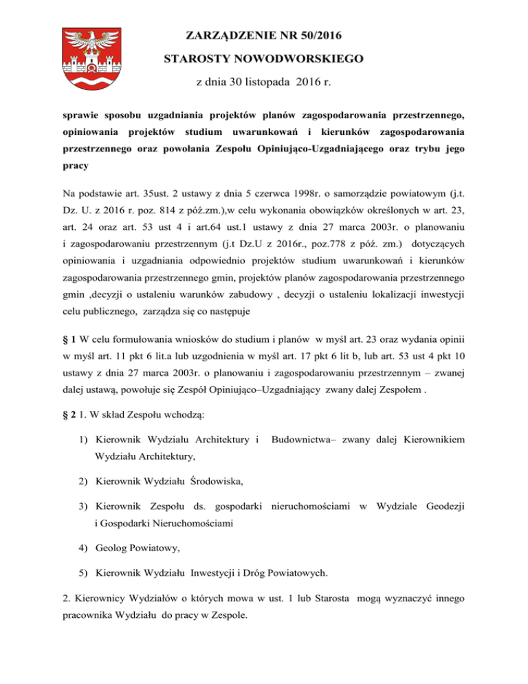 ZARZĄDZENIE NR 50/2016 STAROSTY NOWODWORSKIEGO z dnia 30 listopada 2016 r. sprawie sposobu uzgadniania projektów planów zagospodarowania przestrzennego, opiniowania projektów studium uwarunkowań i kierunków zagospodarowania przestrzennego oraz powołania Zespołu Opiniująco-Uzgadniającego oraz trybu jego pracy Na podstawie art. 35ust. 2 ustawy z dnia 5 czerwca 1998r. o samorządzie powiatowym (j.t. Dz. U. z 2016 r. poz. 814 z póź.zm.),w celu wykonania obowiązków określonych w art. 23, art. 24 oraz art. 53 ust 4 i art.64 ust.1 ustawy z dnia 27 marca 2003r. o planowaniu i zagospodarowaniu przestrzennym (j.t Dz.U z 2016r., poz.778 z póź. zm.) dotyczących opiniowania i uzgadniania odpowiednio projektów studium uwarunkowań i kierunków zagospodarowania przestrzennego gmin, projektów planów zagospodarowania przestrzennego gmin ,decyzji o ustaleniu warunków zabudowy , decyzji o ustaleniu lokalizacji inwestycji celu publicznego, zarządza się co następuje § 1 W celu formułowania wniosków do studium i planów w myśl art. 23 oraz wydania opinii w myśl art. 11 pkt 6 lit.a lub uzgodnienia w myśl art. 17 pkt 6 lit b, lub art. 53 ust 4 pkt 10 ustawy z dnia 27 marca 2003r. o planowaniu i zagospodarowaniu przestrzennym – zwanej dalej ustawą, powołuje się Zespół Opiniująco–Uzgadniający zwany dalej Zespołem . § 2 1. W skład Zespołu wchodzą: 1) Kierownik Wydziału Architektury i Budownictwa– zwany dalej Kierownikiem Wydziału Architektury, 2) Kierownik Wydziału Środowiska, 3) Kierownik Zespołu ds. gospodarki nieruchomościami w Wydziale Geodezji i Gospodarki Nieruchomościami 4) Geolog Powiatowy, 5) Kierownik Wydziału Inwestycji i Dróg Powiatowych. 2. Kierownicy Wydziałów o których mowa w ust. 1 lub Starosta mogą wyznaczyć innego pracownika Wydziału do pracy w Zespole. 3. Pracę Zespołu koordynuje Kierownik Wydziału Architektury. § 3 1. Do zadań Zespołu należy opracowywanie projektów: 1.1. wniosków do studium, na etapie zawiadomienia o podjęciu przez radę gminy uchwały o przystąpieniu do sporządzania studium uwarunkowań i kierunków zagospodarowania przestrzennego, w myśl art. 23 ustawy, 1.2. wniosków do planu , na etapie zawiadomienia o podjęciu przez radę gminy uchwały o przystąpieniu do sporządzania miejscowego planu zagospodarowania przestrzennego, w myśl art. 23 ustawy, 1.3. opinii dotyczących rozwiązań przyjętych w projekcie studium uwarunkowań i kierunków zagospodarowania przestrzennego, zgodnie z art. 11 pkt 6 lit. a ustawy, 1.4. uzgodnień projektu miejscowego planu zagospodarowania przestrzennego, zgodnie z art. 17 pkt 6 lit. b ustawy w części uzgodnień z zarządem powiatu w zakresie odpowiednich zadań rządowych i samorządowych 1.5 uzgodnień projektów decyzji o ustaleniu warunków zabudowy , zgodni e z art.53 ust. 4 pkt 10 ustawy w związku z art. 64 ust.1 1.6 uzgodnień projektów decyzji o ustaleniu lokalizacji inwestycji celu publicznego, zgodni e z art.53 ust. 4 pkt 10 , 2. W razie złożenia przez organy gminy zawiadomienia o przystąpienia do sporządzania studium lub planu, wniosku o opinię lub uzgodnienie, o których mowa w ust.1 Kierownik Wydziału Architektury zwraca się do poszczególnych Kierowników - Członków Zespołu, o przygotowanie stosownego pisemnego stanowiska w ramach merytorycznej działalności wydziałów wraz z uzasadnieniem. 3. Na podstawie przekazanych materiałów od poszczególnych Członków Zespołu, Kierownik Wydziału Architektury przygotowuje projekt wniosku, projekt opinii lub projekt uzgodnienia w formie postanowienia i przedkłada do podpisu według właściwości Staroście lub Zarządowi Powiatu. 4. W razie konieczności Starosta, Wicestarosta lub Kierownik Wydziału Architektury, jako koordynator, zwołuje posiedzenia Zespołu. § 4 1. Opiniowania i uzgadniania projektów studium i projektów planów miejscowych w zakresie wynikającym odpowiednio z art.11 pkt 6 lit. g , art. 17 pkt 6 lit. a i b w zakresie: lit.a-opiniowania z właściwymi organami administracji geologicznej w zakresie udokumentowanych złóż kopalin i wód podziemnych, lit. b uzgodnień z właściwym zarządcom drogi dokonują bezpośrednio Kierownicy poszczególnych Wydziałów odpowiedzialni za dany zakres merytoryczny, sporządzając stosowny projekt opinii lub projekt uzgodnienia w formie postanowienia i przedkładając go do podpisu według właściwości Staroście lub Zarządowi Powiatu. Kopie podpisanej opinii lub postanowienia przekazują do wiadomości Kierownikowi Wydziału Architektury, który przechowuje ten dokument wraz z innymi dotyczącymi danego planu lub studium. 2. Uzgodnienia projektów decyzji o warunkach zabudowy i projektów decyzji ustalenia lokalizacji celu publicznego wynikające z art. 53 ust ust. 4 pkt 5,6,9 dokonują bezpośrednio Kierownicy poszczególnych Wydziałów odpowiedzialnych za dany zakres merytoryczny, wydając i podpisując z upoważnienia Starosty stosowne postanowienia. Właściwi merytorycznie Kierownicy , to: a) w zakresie art. 53 ust.4 pkt 5 – Geolog Powiatowy b) w zakresie art. 53 ust. 4 pkt 9 – Kierownik Wydziały Inwestycji i Dróg Powiatowych, c) w zakresie art. 53 ust. 4 pkt 6 – Kierownik Wydziału Geodezji i Gospodarki Nieruchomościami. §5. Zarządzenie wchodzi w życie w dniu podpisania. Starosta Nowodworski /-/ Magdalena Biernacka