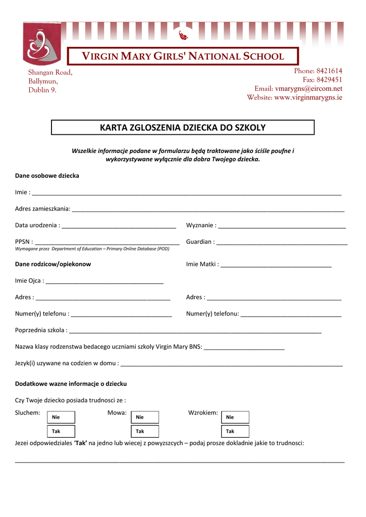 VIRGIN MARY GIRLS' NATIONAL SCHOOL Phone: 8421614 Fax: 8429451 Email: [email protected] Website: www.virginmarygns.ie Shangan Road, Ballymun, Dublin 9. KARTA ZGLOSZENIA DZIECKA DO SZKOLY Wszelkie informacje podane w formularzu będą traktowane jako ściśle poufne i wykorzystywane wyłącznie dla dobra Twojego dziecka. Dane osobowe dziecka Imie : ____________________________________________________________________________________________ Adres zamieszkania: _________________________________________________________________________________ Data urodzenia : __________________________________ Wyznanie : ______________________________________ PPSN : ___________________________________________ Guardian : _______________________________________ Wymagane przez Department of Education – Primary Online Database (POD) Dane rodzicow/opiekonow Imie Matki : _________________________________ Imie Ojca : ___________________________________ Adres : ________________________________________ Adres : ________________________________________ Numer(y) telefonu : ______________________________ Numer(y) telefonu: ______________________________ Poprzednia szkola : ___________________________________________________________________________ Nazwa klasy rodzenstwa bedacego uczniami szkoly Virgin Mary BNS: ________________________ Jezyk(i) uzywane na codzien w domu : __________________________________________________________________ Dodatkowe wazne informacje o dziecku Czy Twoje dziecko posiada trudnosci ze : Sluchem: Nie Tak Mowa: Nie Tak Wzrokiem: Nie Tak Jezei odpowiedziales ‘Tak’ na jedno lub wiecej z powyzszcych – podaj prosze dokladnie jakie to trudnosci: __________________________________________________________________________________________________ Czy Twoje dziecko cierpi na chorobe/schorzenie? ________________________________________________________ Np; astma, wstrzas anafilaktyczny, zespol Aspergera, ADD, ADHD, autyzm, porazenie mozgowe, cukrzyca, dyspraksja, epilepsja, Jezeli ‘Tak’ podaj prosze szczegoly schorzenia: ___________________________________________________________ Czy Twoje dziecko cierpi na alergie: _________________________________________________________(podaj prosze szczegoly). Czy istnieje nakaz prawny w ramach prawa rodzinnego o ktorym powinna szkola?_____________________________ Jezeli ‘Tak’ – czy istnieje osoba(y) ktora ma zakaz widywania sie z dzieckiem. Prosze podac dane. byc poinformowana Oswiadczenie Informacje, ktore podalem(am) w formularzu sa zgodne z prawda. Zobowiazuje sie, ze uczenica zapisana do szkoly bedzie stosowac sie do przepisow i polityki szkoły. Zobowiazuje sie, ze bedzie w pełni przestrzegac postanowienia statutu szkoły Virgin Mary Girls’ National School. _________________________________________________________________________ Podpis Rodzica/Opiekuna: OFFICE USE ONLY : Date of admission : ________________________________ Class : ___________________________________________ Date of leaving : ___________________________________ Birth Certificate : Yes No Data : Registration Number : _____________________________ Teacher : ________________________________________ Destination : _____________________________________ Baptismal Certificate : Yes No