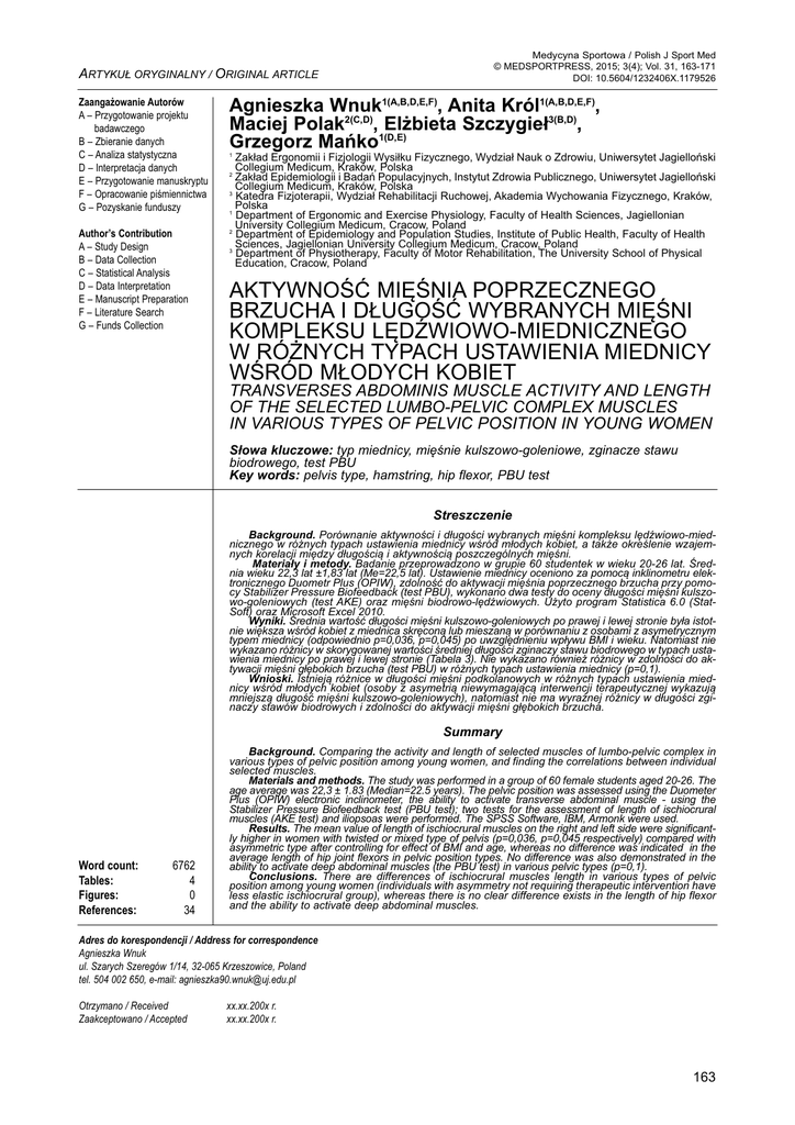 ARTYKUŁ ORYGINALNY / ORIGINAL ARTICLE Zaangażowanie Autorów A – Przygotowanie projektu badawczego B – Zbieranie danych C – Analiza statystyczna D – Interpretacja danych E – Przygotowanie manuskryptu F – Opracowanie piśmiennictwa G – Pozyskanie funduszy Author’s Contribution A – Study Design B – Data Collection C – Statistical Analysis D – Data Interpretation E – Manuscript Preparation F – Literature Search G – Funds Collection Medycyna Sportowa / Polish J Sport Med © MEDSPORTPRESS, 2015; 3(4); Vol. 31, 163-171 DOI: 10.5604/1232406X.1179526 Agnieszka Wnuk1(A,B,D,E,F), Anita Król1(A,B,D,E,F), Maciej Polak2(C,D), Elżbieta Szczygieł3(B,D), Grzegorz Mańko1(D,E) 1 Zakład Ergonomii i Fizjologii Wysiłku Fizycznego, Wydział Nauk o Zdrowiu, Uniwersytet Jagielloński Collegium Medicum, Kraków, Polska Zakład Epidemiologii i Badań Populacyjnych, Instytut Zdrowia Publicznego, Uniwersytet Jagielloński Collegium Medicum, Kraków, Polska 3 Katedra Fizjoterapii, Wydział Rehabilitacji Ruchowej, Akademia Wychowania Fizycznego, Kraków, Polska 1 Department of Ergonomic and Exercise Physiology, Faculty of Health Sciences, Jagiellonian University Collegium Medicum, Cracow, Poland 2 Department of Epidemiology and Population Studies, Institute of Public Health, Faculty of Health Sciences, Jagiellonian University Collegium Medicum, Cracow, Poland 3 Department of Physiotherapy, Faculty of Motor Rehabilitation, The University School of Physical Education, Cracow, Poland 2 AKTYWNOŚĆ MIĘŚNIA POPRZECZNEGO BRZUCHA I DŁUGOŚĆ WYBRANYCH MIĘŚNI KOMPLEKSU LĘDŹWIOWO-MIEDNICZNEGO W RÓŻNYCH TYPACH USTAWIENIA MIEDNICY WŚRÓD MŁODYCH KOBIET TRANSVERSES ABDOMINIS MUSCLE ACTIVITY AND LENGTH OF THE SELECTED LUMBO-PELVIC COMPLEX MUSCLES IN VARIOUS TYPES OF PELVIC POSITION IN YOUNG WOMEN Słowa kluczowe: typ miednicy, mięśnie kulszowo-goleniowe, zginacze stawu biodrowego, test PBU Key words: pelvis type, hamstring, hip flexor, PBU test Streszczenie Background. Porównanie aktywności i długości wybranych mięśni kompleksu lędźwiowo-miednicznego w różnych typach ustawienia miednicy wśród młodych kobiet, a także określenie wzajemnych korelacji między długością i aktywnością poszczególnych mięśni. Materiały i metody. Badanie przeprowadzono w grupie 60 studentek w wieku 20-26 lat. Średnia wieku 22,3 lat ±1,83 lat (Me=22,5 lat). Ustawienie miednicy oceniono za pomocą inklinometru elektronicznego Duometr Plus (OPIW), zdolność do aktywacji mięśnia poprzecznego brzucha przy pomocy Stabilizer Pressure Biofeedback (test PBU), wykonano dwa testy do oceny długości mięśni kulszowo-goleniowych (test AKE) oraz mięśni biodrowo-lędźwiowych. Użyto program Statistica 6.0 (StatSoft) oraz Microsoft Excel 2010. Wyniki. Średnia wartość długości mięśni kulszowo-goleniowych po prawej i lewej stronie była istotnie większa wśród kobiet z miednica skręconą lub mieszaną w porównaniu z osobami z asymetrycznym typem miednicy (odpowiednio p=0,036, p=0,045) po uwzględnieniu wpływu BMI i wieku. Natomiast nie wykazano różnicy w skorygowanej wartości średniej długości zginaczy stawu biodrowego w typach ustawienia miednicy po prawej i lewej stronie (Tabela 3). Nie wykazano również różnicy w zdolności do aktywacji mięśni głębokich brzucha (test PBU) w różnych typach ustawienia miednicy (p=0,1). Wnioski. Istnieją różnice w długości mięśni podkolanowych w różnych typach ustawienia miednicy wśród młodych kobiet (osoby z asymetrią niewymagającą interwencji terapeutycznej wykazują mniejszą długość mięśni kulszowo-goleniowych), natomiast nie ma wyraźnej różnicy w długości zginaczy stawów biodrowych i zdolności do aktywacji mięśni głębokich brzucha. Summary Word count: Tables: Figures: References: 6762 4 0 34 Background. Comparing the activity and length of selected muscles of lumbo-pelvic complex in various types of pelvic position among young women, and finding the correlations between individual selected muscles. Materials and methods. The study was performed in a group of 60 female students aged 20-26. The age average was 22,3 ± 1.83 (Median=22.5 years). The pelvic position was assessed using the Duometer Plus (OPIW) electronic inclinometer, the ability to activate transverse abdominal muscle - using the Stabilizer Pressure Biofeedback test (PBU test); two tests for the assessment of length of ischiocrural muscles (AKE test) and iliopsoas were performed. The SPSS Software, IBM, Armonk were used. Results. The mean value of length of ischiocrural muscles on the right and left side were significantly higher in women with twisted or mixed type of pelvis (p=0,036, p=0,045 respectively) compared with asymmetric type after controlling for effect of BMI and age, whereas no difference was indicated in the average length of hip joint flexors in pelvic position types. No difference was also demonstrated in the ability to activate deep abdominal muscles (the PBU test) in various pelvic types (p=0,1). Conclusions. There are differences of ischiocrural muscles length in various types of pelvic position among young women (individuals with asymmetry not requiring therapeutic intervention have less elastic ischiocrural group), whereas there is no clear difference exists in the length of hip flexor and the ability to activate deep abdominal muscles. Adres do korespondencji / Address for correspondence Agnieszka Wnuk ul. Szarych Szeregów 1/14, 32-065 Krzeszowice, Poland tel. 504 002 650, e-mail: [email protected] Otrzymano / Received Zaakceptowano / Accepted xx.xx.200x r. xx.xx.200x r. 163 Wnuk A. i wsp. Długość mięśni kompleksu lędźwiowo-miednicznego w różnych typach ustawienia miednicy Wstęp Background Kompleks lędźwiowo-miedniczny stanowi anatomiczne oraz funkcjonalne połączenie między kręgosłupem oraz obręczą miedniczną. Miednica uważana jest przez wielu autorów za kluczowy element postawy ciała [1
