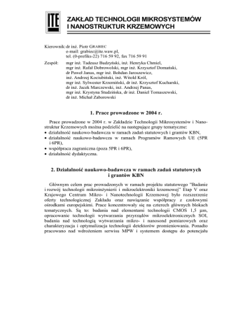 ZAKŁAD TECHNOLOGII MIKROSYSTEMÓW I NANOSTRUKTUR KRZEMOWYCH Kierownik:dr inż. Piotr GRABIEC e-mail: [email protected], tel. (0-prefiks-22) 716 59 92, fax 716 59 91 Zespół: mgr inż. Tadeusz Budzyński, inż. Henryka Chmiel, mgr inż. Rafał Dobrowolski, mgr inż. Krzysztof Domański, dr Paweł Janus, mgr inż. Bohdan Jaroszewicz, inż. Andrzej Kociubiński, inż. Witold Król, mgr inż. Sylwester Krzemiński, dr inż. Krzysztof Kucharski, dr inż. Jacek Marczewski, inż. Andrzej Panas, mgr inż. Krystyna Studzińska, dr inż. Daniel Tomaszewski, dr inż. Michał Zaborowski 1. Prace prowadzone w 2004 r. Prace prowadzone w 2004 r. w Zakładzie Technologii Mikrosystemów i Nanostruktur Krzemowych można podzielić na następujące grupy tematyczne: • działalność naukowo-badawcza w ramach zadań statutowych i grantów KBN, • działalność naukowo-badawcza w ramach Programów Ramowych UE (5PR i 6PR), • współpraca zagraniczna (poza 5PR i 6PR), • działalność dydaktyczna. 2. Działalność naukowo-badawcza w ramach zadań statutowych i grantów KBN Głównym celem prac prowadzonych w ramach projektu statutowego "Badanie i rozwój technologii mikroinżynierii i mikroelektroniki krzemowej” Etap V oraz Krajowego Centrum Mikro- i Nanotechnologii Krzemowej było rozszerzenie oferty technologicznej Zakładu oraz nawiązanie współpracy z czołowymi ośrodkami europejskimi. Prace koncentrowały się na czterech głównych blokach tematycznych. Są to: badania nad elementami technologii CMOS 1,5 µm, opracowanie technologii wytwarzania przyrządów mikroelektronicznych SOI, badania nad technologią wytwarzania mikro- i nanosond pomiarowych oraz charakteryzacja i optymalizacja technologii detektorów promieniowania. Ponadto pracowano nad wdrożeniem serwisu MPW i systemem dostępu do potencjału 2 Zakład Technologii Mikrosystemów i Nanostruktur Krzemowych technologicznego w ramach Krajowego Centrum Mikro- i Nanotechnologii Krzemowej oraz realizowano zadania kilku grantów indywidualnych. Prace nad technologią 1,5 µm prowadzono tak, aby każdy z realizowanych etapów pozwalał na wykorzystanie cząstkowych rezultatów opracowania w pracach zespołu. W 2004 r. podjęto realizację dwóch zadań: zaprojektowanie i wykonanie bezpieczników z polikrzemu o nominalnych wymiarach 1,5 µm oraz wykonanie i charakteryzacja tranzystorów MOS i MOS SOI o wymiarach W = 20 µm i L = 1,5 µm. W celu opanowania technologii cienkich ścieżek metalowych i polikrzemowych opracowano strukturę próbną SPF2, w której najmniejsza szerokość ścieżki i najmniejszy odstęp między ścieżkami wynoszą 1 µm. Tranzystory długości 1,5 µm wykonywano przy użyciu zmodyfikowanej struktury TSSOI zaprojektowanej na potrzeby projektu SUCIMA. Przy jej użyciu wytworzono trzy partie technologiczne na płytkach typu "bulk" oraz dwie partie na podłożach SOI. Przykład charakterystyk wyjściowych tranzystora wykonanego na podłożu SOI o grubości 1 µm z kanałem typu n o długości nominalnej 1,5 µm przedstawia rys. 1. Na rysunku umieszczono także aproksymacje charakterystyk (SPICE, level 2,3) otrzymane w wyniku użycia parametrów wyekstrahowanych programem MOSTXX (autor D. Tomaszewski). SA-09/1/B6/E22A_20x1.5; VBS=0 V; VGS=0,1,2,3,4,5 V 3.5E-3 LEV=2,VMAX>0 3.0E-3 LEV=3,VMAX>0 2.5E-3 ID 2.0E-3 [A] 1.5E-3 1.0E-3 5.0E-4 0.0E+0 0 1 2 3 4 5 VDS [V] Rys. 1. Charakterystyki wyjściowe tranzystora MOS z kanałem typu n o wymiarach (w projekcie) W = 20 µm, L = 1,5 µm wytworzonego na podłożu SOI W 2004 r. kontynuowano różnorodne działania mające na celu opracowanie technologii wytwarzania przyrządów mikroelektronicznych na podłożach SOI. Opracowano technologię wytwarzania prostych układów scalonych na podłożu SOI o grubości warstwy czynnej krzemu 1,5 µm. W celu weryfikacji procesów zmierzono statyczne charakterystyki przejściowe komórek cyfrowych CMOS. Otrzymano założone wyniki, których przykładem jest charakterystyka przejściowa bufora CMOS o zwiększonej obciążalności pokazana na rys. 2. Wykonano także tranzystory działające na podłożu SOI o grubości czynnej warstwy krzemu wynoszącej 0,34 µm. Rozpoczęto prace eksperymentalne nad realizacją koncepcji integrowania mikrosystemów opracowywanych w ITE z układami elektronicznymi wytwa- Zakład Technologii Mikrosystemów i Nanostruktur Krzemowych 3 rzanymi przez dostawców zewnętrznych. W pierwszej kolejności przeprowadzono rozpoznanie możliwości pocieniania płytek SOI pod kątem ich zastosowania w procesie integracji oraz sprawdzono przydatność niskotemperaturowej technologii wytwarzania złączy Schottky'ego do stosowania na gotowych wyrobach ASIC. Otrzymane wyniki wykazują, że praktyczne zrealizowanie przyjętych koncepcji wymaga rozwiązania wielu istotnych problemów związanych głównie z ekstrakcją i łączeniem struktur. 5.0 4.0E-4 4.0 3.2E-4 3.0 2.4E-4 2.0 1.6E-4 1.0 8.0E-5 0.0 Idd [A] Vout [V] Vout(Vin), Idd(Vin) char. of CMOS buffer 0.0E+0 0.0 1.0 2.0 3.0 4.0 5.0 Vin [V] Rys. 2. Charakterystyki Vout(Vin) oraz Idd(Vin) bufora CMOS SOI o zwiększonej obciążalności Prace dotyczące projektowania i wytwarzania struktur krzemowych dla mikroskopii sił atomowych (AFM) objęły eksperymenty technologiczne oraz wykonanie struktur mikrosond AFM z ostrzami pomiarowymi. Celem przeprowadzonych eksperymentów było udoskonalenie sekwencji technologicznej wycinania kształtu elementów mikromechanicznych poprzez trawienie membran krzemowych, opracowanie procesów plazmowego trawienia krzemu oraz zaprojektowanie nowej wersji sekwencji technologicznej. Uzyskano wyższe szybkości trawienia przy mniejszych podtrawieniach. Na rys. 3 pokazano zdjęcie belki o grubości nieosiągalnej w dotychczasowej technologii. Rys. 3. Zdjęcie SEM struktury belki o grubości 75 µm wyciętej za pomocą trawienia plazmowego 4 Zakład Technologii Mikrosystemów i Nanostruktur Krzemowych Nowe rozwiązania technologiczne umożliwiaj