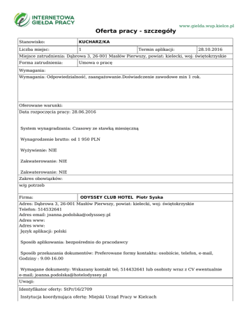Oferta pracy - szczegóły Stanowisko: KUCHARZ/KA Liczba miejsc: 1 www.gielda.wup.kielce.pl Termin aplikacji: 28.10.2016 Miejsce zatrudnienia: Dąbrowa 3, 26-001 Masłów Pierwszy, powiat: kielecki, woj: świętokrzyskie Forma zatrudnienia: Umowa o pracę Wymagania: Wymagania: Odpowiedzialność, zaangażowanie.Doświadczenie zawodowe min 1 rok. Oferowane warunki: Data rozpoczęcia pracy: 28.06.2016 System wynagradzania: Czasowy ze stawką miesięczną Wynagrodzenie brutto: od 1 950 PLN Wyżywienie: NIE Zakwaterowanie: NIE Zakwaterowanie: NIE Zakres obowiązków: w/g potrzeb Firma: ODYSSEY CLUB HOTEL Piotr Syska Adres: Dąbrowa 3, 26-001 Masłów Pierwszy, powiat: kielecki, woj: świętokrzyskie Telefon: 514532641 Adres email: [email protected] Adres www: Adres www: Język aplikacji: polski Sposób aplikowania: bezpośrednio do pracodawcy Sposób przekazania dokumentów: Preferowane formy kontaktu: osobiście, telefon, e-mail, Godziny : 9.00-16.00 Wymagane dokumenty: Wskazany kontakt tel; 514432641 lub osobisty wraz z CV ewentualnie e-mail; [email protected] Uwagi: Identyfikator oferty: StPr/16/2709 Instytucja koordynująca ofertę: Miejski Urząd Pracy w Kielcach Urząd Pracy dokłada wszelkich starań, aby oferty pracy będące w zasobach urzędu, były rzetelne i wiarygodne. Ponieważ wszystkie oferty pracy pochodzą od osób trzecich Urząd Pracy zastrzega, że odpowiedzialność za ewentualne rozbieżności pomiędzy warunkami pracy zaprezentowanymi w niniejszej ofercie a warunkami zaproponowanymi przez potencjalnego pracodawcę ponosi pracodawca.