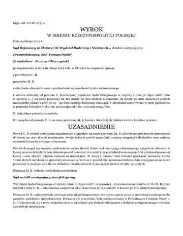 Sygn. akt: III RC 213/14 WYROK W IMIENIU RZECZYPOSPOLITEJ POLSKIEJ Dnia 23 lutego 2015 r. Sąd Rejonowy w Złotoryi III Wydział Rodzinny i Nieletnich w składzie następującym: Przewodniczący: SSR Tomasz Popiel Protokolant : Bartosz Główczyński po rozpoznaniu w dniu 16 lutego 2015 roku w Złotoryi na rozprawie sprawy z powództwa C. B. przeciwko M. B. o obniżenie alimentów oraz o pozbawienie wykonalności tytułu wykonawczego I. obniża alimenty od powoda C. B.orzeczone wyrokiem Sądu Okręgowego w Legnicy z dnia 30 lipca 2007 roku w sprawie (...) na rzecz pozwanej M. B.z kwoty po 500 złotych miesięcznie do kwoty po 200 (dwieście) złotych miesięcznie, płatne z góry do 15 – go dnia każdego kolejnego miesiąca, z odsetkami ustawowymi w razie opóźnienia w płatności którejkolwiek z rat, poczynając od dnia 1 stycznia 2015 roku, II. dalej idące powództwo oddala, III. zasądza od powoda C. B. na rzecz pozwanej M. B. kwotę 1 860 złotych tytułem zwrotu kosztów procesu. UZASADNIENIE Powód C. B. wniósł o obniżenie zasądzonych alimentów na rzecz pozwanej M. B. z kwoty po 500 złotych miesięcznie do kwoty po 200 złotych miesięcznie. Swoje żądanie powód uzasadniał zmianą osiąganych dochodów oraz zmianą wysokości kosztów swojego utrzymania. Powód domagał się również pozbawienia wykonalności tytułu wykonawczego obejmującego zasądzone alimenty o kwotę 20.000 złotych. W tym zakresie powód twierdził, iż w 2007 r. za pośrednictwem swojej córki przekazał pozwanej kwotę 1.000 złotych tytułem czynszu za mieszkanie. W 2003 r. powód miał również przekazać pozwanej kwotę 7.000 złotych uzyskaną ze sprzedaży mieszkania. W 2011 r. powód miał natomiast dobrowolnie zrezygnować na rzecz pozwanej ze swojego udziału we wkładzie mieszkaniowym wynoszącym łącznie 27.580, 50 złotych. Pozwana M. B. wniosła o oddalenie powództwa. Sąd ustalił następujący stan faktyczny: Wyrokiem Sądu Okręgowego w Legnicy z dnia 30 lipca 2007 r. w sprawie (...) rozwiązano małżeństwo C. B.i M. B.przez rozwód z winy C. B.. Jednocześnie zasądzono od C. B.na rzecz M. B.alimenty w kwocie po 500 złotych miesięcznie. Pozwana M. B. zamieszkiwała wówczas wraz niepełnosprawnym dorosłym synem stron w mieszkaniu należącym do zasobów spółdzielni mieszkaniowej. Pozwana nie pracowała. Była zarejestrowana w Powiatowym Urzędzie Pracy w Z.. Utrzymywała się z renty socjalnej syna w wysokości 475 złotych miesięcznie i dodatku pielęgnacyjnego w kwocie 153 złotych miesięcznie. Dowód: akta Sądu Okręgowego w Legnicy, sygn. akt (...) W dniu 16 sierpnia 2011 r. strony dokonały zgodnego podziału majątku wspólnego, w wyniku którego jedyny składnik majątku wspólnego w postaci spółdzielczego lokatorskiego prawa do lokalu mieszkalnego położonego w Z. przy ul. (...) wraz z związanym z nim wkładem wysokości 27.580,50 złotych, przypadł M. B. bez obowiązku spłat na rzecz C. B.. Dowód: - umowa o podział majątku wspólnego k. 24-25 - umowa o ustanowieniu spółdzielczego lokatorskiego prawa do lokalu mieszkalnego k. 26-27 Obecnie powód C. B. zamieszkuje w Wielkiej Brytanii. W okresie od 1 października 2014 r. do 1 stycznia 2015 r. zarobił łącznie 3.500 funtów. Dowód: - zaświadczenie o dochodach powoda wraz z tłumaczeniem k. 118-119 Pozwana M. B. ma obecnie 57 lat. Po rozwodzie nie zawarła ponownie związku małżeńskiego. Nadal zamieszkuje z niepełnosprawnym dorosłym synem stron. Miesięczne koszty utrzymania mieszkania wynoszą około 500 złotych. Pozwana pracuje jako pracownik porządkowy i otrzymuje z tego tytułu wynagrodzenie w wysokości 1.191,20 złotych miesięcznie. Ponadto, otrzymuje rentę z tytułu częściowej niezdolności do pracy w wysokości 640 złotych miesięcznie. Na rzecz syna pozwana otrzymuje również rentę w wysokości 619 złotych miesięcznie. Pozwana na zakup wyżywienia wydaje około 300 złotych miesięcznie, na zakup odzieży 200 złotych miesięcznie oraz na zakup środków czystości i pielęgnacji kwotę 200 złotych miesięcznie. Na lekarstwa pozwana wydaje około 150 złotych miesięcznie. Na dojazdy do lekarzy pozwana przeznacza około 100 złotych miesięcznie, a za wizyty płaci około 50 złotych miesięcznie. Pozwana płaci również 100 złotych miesięcznie za telefon oraz 45 złotych miesięcznie za telewizję kablową. Za wywóz śmieci pozwana płaci 30 złotych miesięcznie. Dojazd do pracy kosztuje pozwaną 220 złotych miesięcznie. Od 2010 r. powód C. B. jest zobowiązany do łożenia alimentów na rzecz syna, który zamieszkuje z pozwaną w wysokości 350 złotych miesięcznie. Dowód: - decyzja ZUS w Z. k. 130 - zaświadczenie o zarobkach pozwanej k. 131 - zeznania pozwanej k. 134-135 Sąd zważył, co następuje: Powództwo C. B. zasługiwało na uwzględnienie jedynie w zakresie żądania obniżenia alimentów na rzecz pozwanej M. B.. Zgodnie z art. 138 kro, w razie zmiany stosunków można żądać zmiany orzeczenia lub umowy dotyczącej obowiązku alimentacyjnego. Wyrokiem Sądu Okręgowego w Legnicy z dnia z dnia 30 lipca 2007 r. w sprawie (...) rozwiązano małżeństwo C. B.i M. B.przez rozwód z winy C. B.. Jednocześnie zasądzono od C. B.na rzecz M. B.alimenty w kwocie po 500 złotych miesięcznie. Materialną podstawą zasądzenia powyższych alimentów był art. 60 § 2 kro. Zgodnie z nim jeżeli jeden z małżonków został uznany za wyłącznie winnego rozkładu pożycia, a rozwód pociąga za sobą istotne pogorszenie sytuacji materialnej małżonka niewinnego, sąd na żądanie małżonka niewinnego może orzec, że małżonek wyłącznie winny obowiązany jest przyczyniać się w odpowiednim zakresie do zaspokajania usprawiedliwionych potrzeb małżonka niewinnego, chociażby ten nie znajdował się w niedostatku. Jak wynikało z analizy akt rozwodowych orzeczony rozwód niewątpliwie pociągał za sobą istotne pogorszenie sytuacji materialnej pozwan