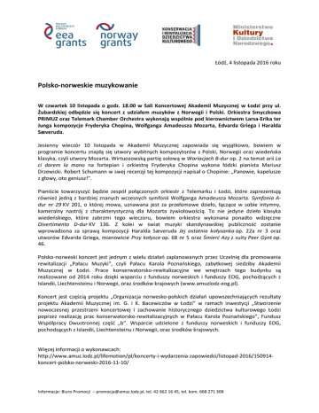 Łódź, 4 listopada 2016 roku Polsko-norweskie muzykowanie W czwartek 10 listopada o godz. 18.00 w Sali Koncertowej Akademii Muzycznej w Łodzi przy ul. Żubardzkiej odbędzie się koncert z udziałem muzyków z Norwegii i Polski. Orkiestra Smyczkowa PRIMUZ oraz Telemark Chamber Orchestra wykonają wspólnie pod kierownictwem Larsa-Erika ter Junga kompozycje Fryderyka Chopina, Wolfganga Amadeusza Mozarta, Edvarda Griega i Haralda Sæveruda. Jesienny wieczór 10 listopada w Akademii Muzycznej zapowiada się wyjątkowo, bowiem w programie koncertu znajdą się utwory wybitnych kompozytorów z Polski, Norwegii oraz wiedeńska klasyka, czyli utwory Mozarta. Wirtuozowską partię solową w Wariacjach B-dur op. 2 na temat arii La ci darem la mano na fortepian i orkiestrę Fryderyka Chopina wykona łódzki pianista Mariusz Drzewicki. Robert Schumann w swej recenzji tej kompozycji napisał o Chopinie: „Panowie, kapelusze z głowy, oto geniusz!”. Pianiście towarzyszyć będzie zespół połączonych orkiestr z Telemarku i Łodzi, które zaprezentują również jedną z bardziej znanych wczesnych symfonii Wolfganga Amadeusza Mozarta. Symfonia Adur nr 29 KV 201, o której mowa, uznawana jest za przełomowe dzieło, łączące w sobie intymny, kameralny nastrój z charakterystyczną dla Mozarta żywiołowością. To nie jedyne dzieło klasyka wiedeńskiego, które zabrzmi tego wieczoru, bowiem orkiestra wykonana ponadto wdzięczne Divertimento D-dur KV 136. Z kolei w świat muzyki skandynawskiej publiczność zostanie wprowadzona za sprawą kompozycji Haralda Sæveruda Jej ostatnia kołysanka op. 22a nr 3 oraz utworów Edvarda Griega, mianowicie Przy kołysce op. 68 nr 5 oraz Śmierć Azy z suity Peer Gynt op. 46. Polsko-norweski koncert jest jednym z wielu działań zaplanowanych przez Uczelnię dla promowania rewitalizacji „Pałacu Muzyki”, czyli Pałacu Karola Poznańskiego, zabytkowej siedziby Akademii Muzycznej w Łodzi. Prace konserwatorsko-rewitalizacyjne we wnętrzach tego budynku są realizowane od 2014 roku dzięki wsparciu z funduszy norweskich i funduszy EOG, pochodzących z Islandii, Liechtensteinu i Norwegii, oraz środków krajowych (www.amuzlodz-eog.pl). Koncert jest częścią projektu „Organizacja norwesko-polskich działań upowszechniających rezultaty projektu Akademii Muzycznej im. G. i K. Bacewiczów w Łodzi” w ramach inwestycji „Stworzenie nowoczesnej przestrzeni koncertowej i zachowanie historycznego dziedzictwa kulturowego Łodzi poprzez realizację prac konserwatorsko-rewitalizacyjnych w Pałacu Karola Poznańskiego”, Fundusz Współpracy Dwustronnej część „b”. Wsparcie udzielone z funduszy norweskich i funduszy EOG, pochodzących z Islandii, Liechtensteinu i Norwegii, oraz środków krajowych. Więcej informacji o wykonawcach: http://www.amuz.lodz.pl/lifemotion/pl/koncerty-i-wydarzenia-zapowiedzi/listopad-2016/150914koncert-polsko-norweski-2016-11-10/ Informacje: Biuro Promocji – [email protected], tel. 42 662 16 45, tel. kom. 668 271 308
