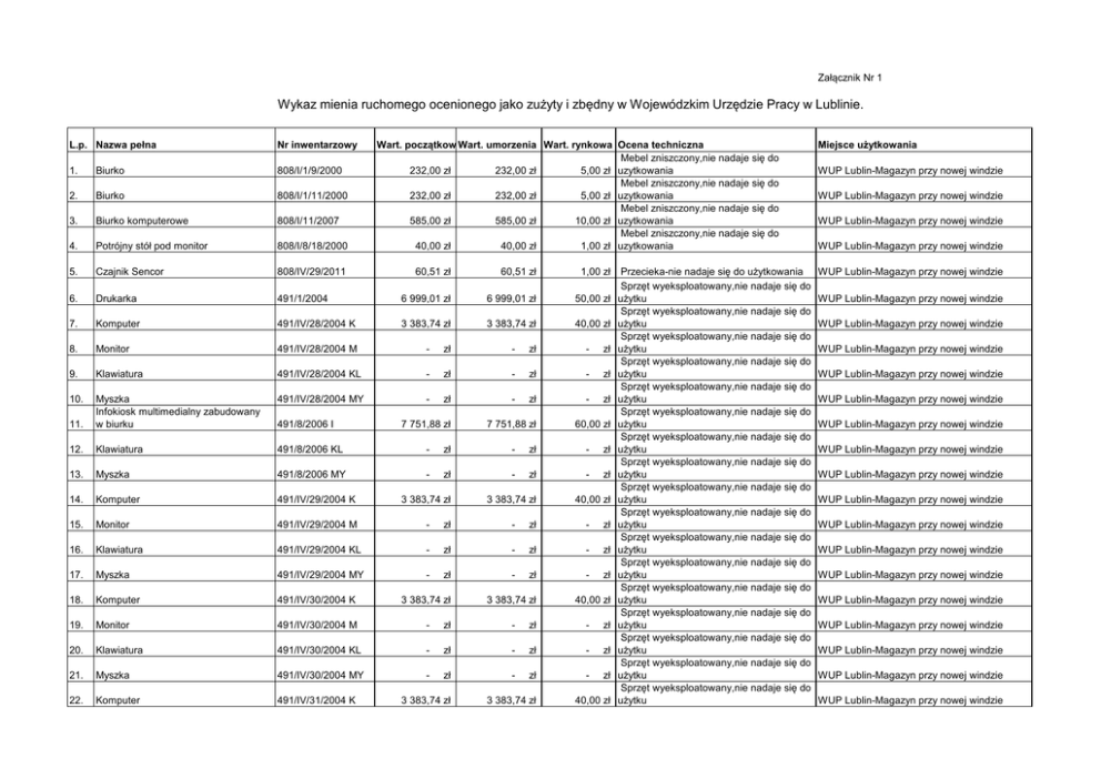 Załącznik Nr 1 Wykaz mienia ruchomego ocenionego jako zużyty i zbędny w Wojewódzkim Urzędzie Pracy w Lublinie. L.p. Nazwa pełna Nr inwentarzowy 1. Biurko 808/I/1/9/2000 2. Biurko 808/I/1/11/2000 3. Biurko komputerowe 808/I/11/2007 4. Potrójny stół pod monitor 808/I/8/18/2000 5. Czajnik Sencor 808/IV/29/2011 6. Drukarka 7. Wart. początkowaWart. umorzenia Wart. rynkowa Ocena techniczna Mebel zniszczony,nie nadaje się do 232,00 zł 232,00 zł 5,00 zł uzytkowania Mebel zniszczony,nie nadaje się do 232,00 zł 232,00 zł 5,00 zł uzytkowania Mebel zniszczony,nie nadaje się do 585,00 zł 585,00 zł 10,00 zł uzytkowania Mebel zniszczony,nie nadaje się do 40,00 zł 40,00 zł 1,00 zł uzytkowania 60,51 zł 60,51 zł 1,00 zł 491/1/2004 6 999,01 zł 6 999,01 zł 50,00 zł Komputer 491/IV/28/2004 K 3 383,74 zł 3 383,74 zł 40,00 zł 8. Monitor 491/IV/28/2004 M - zł - zł - zł 9. Klawiatura 491/IV/28/2004 KL - zł - zł - zł 10. 491/IV/28/2004 MY - zł - zł - zł 11. Myszka Infokiosk multimedialny zabudowany w biurku 12. Klawiatura 491/8/2006 KL - zł - zł - zł 13. Myszka 491/8/2006 MY - zł - zł - zł 14. Komputer 491/IV/29/2004 K 3 383,74 zł 15. Monitor 491/IV/29/2004 M - zł - zł - zł 16. Klawiatura 491/IV/29/2004 KL - zł - zł - zł 17. Myszka 491/IV/29/2004 MY - zł - zł - zł 18. Komputer 491/IV/30/2004 K 3 383,74 zł 19. Monitor 491/IV/30/2004 M - zł - zł - zł 20. Klawiatura 491/IV/30/2004 KL - zł - zł - zł 21. Myszka 491/IV/30/2004 MY - zł - zł - zł 22. Komputer 491/IV/31/2004 K 491/8/2006 I 7 751,88 zł 3 383,74 zł 7 751,88 zł 3 383,74 zł 3 383,74 zł 3 383,74 zł 60,00 zł 40,00 zł 40,00 zł 40,00 zł Przecieka-nie nadaje się do użytkowania Sprzęt wyeksploatowany,nie nadaje się do użytku Sprzęt wyeksploatowany,nie nadaje się do użytku Sprzęt wyeksploatowany,nie nadaje się do użytku Sprzęt wyeksploatowany,nie nadaje się do użytku Sprzęt wyeksploatowany,nie nadaje się do użytku Sprzęt wyeksploatowany,nie nadaje się do użytku Sprzęt wyeksploatowany,nie nadaje się do użytku Sprzęt wyeksploatowany,nie nadaje się do użytku Sprzęt wyeksploatowany,nie nadaje się do użytku Sprzęt wyeksploatowany,nie nadaje się do użytku Sprzęt wyeksploatowany,nie nadaje się do użytku Sprzęt wyeksploatowany,nie nadaje się do użytku Sprzęt wyeksploatowany,nie nadaje się do użytku Sprzęt wyeksploatowany,nie nadaje się do użytku Sprzęt wyeksploatowany,nie nadaje się do użytku Sprzęt wyeksploatowany,nie nadaje się do użytku Sprzęt wyeksploatowany,nie nadaje się do użytku Miejsce użytkowania WUP Lublin-Magazyn przy nowej windzie WUP Lublin-Magazyn przy nowej windzie WUP Lublin-Magazyn przy nowej windzie WUP Lublin-Magazyn przy nowej windzie WUP Lublin-Magazyn przy nowej windzie WUP Lublin-Magazyn przy nowej windzie WUP Lublin-Magazyn przy nowej windzie WUP Lublin-Magazyn przy nowej windzie WUP Lublin-Magazyn przy nowej windzie WUP Lublin-Magazyn przy nowej windzie WUP Lublin-Magazyn przy nowej windzie WUP Lublin-Magazyn przy nowej windzie WUP Lublin-Magazyn przy nowej windzie WUP Lublin-Magazyn przy nowej windzie WUP Lublin-Magazyn przy nowej windzie WUP Lublin-Magazyn przy nowej windzie WUP Lublin-Magazyn przy nowej windzie WUP Lublin-Magazyn przy nowej windzie WUP Lublin-Magazyn przy nowej windzie WUP Lublin-Magazyn przy nowej windzie WUP Lublin-Magazyn przy nowej windzie WUP Lublin-Magazyn przy nowej windzie 23. Monitor 491/IV/31/2004 M - zł - zł 24. Klawiatura 491/IV/31/2004 KL - zł - zł 25. Myszka 491/IV/31/2004 MY - zł - zł 26. Komputer 491/6/2007 K 3 635,33 zł 27. Monitor 491/6/2007 M - zł - zł 28. Klawiatura 491/6/2007 KL - zł - zł 29. Myszka 491/6/2007 MY - zł - zł 30. Komputer 491/IV/7/2004 K 3 498,59 zł 31. Monitor 491/IV/7/2004 M - zł - zł 32. Klawiatura 491/IV/7/2004 KL - zł - zł 33. Myszka 491/IV/7/2004 MY - zł - zł 34. Komputer 491/46/2007 K 3 495,30 zł 35. Monitor 491/46/2007 M - zł - zł 36. Klawiatura 491/46/2007 KL - zł - zł 37. Myszka 491/46/2007 MY - zł - zł 38. Komputer Megaline 491/47/2007 K 39. Klawiatura 491/47/2007 KL - zł - zł 40. Myszka 491/47/2007 MY - zł - zł 41. Komputer 491/IV/43/2003 K 3 495,30 zł 42. Monitor 491/IV/43/2003 M - zł - zł 43. Klawiatura 491/IV/43/2003 KL - zł - zł 44. Myszka 491/IV/43/2003 MY - zł - zł 45. Skaner 491/IV/1/2004 450,18 zł 450,18 zł 46. Skaner Plustek 491/IV/10/2005 399,43 zł 399,43 zł 47. Skaner 491/IV/11/2005 399,43 zł 399,43 zł 12 172,86 zł 3 635,33 zł 3 498,59 zł 3 495,30 zł 12 172,86 zł 3 495,30 zł Sprzęt wyeksploatowany,nie nadaje się do zł użytku Sprzęt wyeksploatowany,nie nadaje się do - zł użytku Sprzęt wyeksploatowany,nie nadaje się do - zł użytku Sprzęt wyeksploatowany,nie nadaje się do 40,00 zł użytku Sprzęt wyeksploatowany,nie nadaje się do - zł użytku Sprzęt wyeksploatowany,nie nadaje się do - zł użytku Sprzęt wyeksploatowany,nie nadaje się do - zł użytku Sprzęt wyeksploatowany,nie nadaje się do 40,00 zł użytku Sprzęt wyeksploatowany,nie nadaje się do - zł użytku Sprzęt wyeksploatowany,nie nadaje się do - zł użytku Sprzęt wyeksploatowany,nie nadaje się do - zł użytku Sprzęt wyeksploatowany,nie nadaje się do 40,00 zł użytku Sprzęt wyeksploatowany,nie nadaje się do - zł użytku Sprzęt wyeksploatowany,nie nadaje się do - zł użytku Sprzęt wyeksploatowany,nie nadaje się do - zł użytku Sprzęt wyeksploatowany,nie nadaje się do 100,00 zł użytku Sprzęt wyeksploatowany,nie nadaje się do - zł użytku Sprzęt wyeksploatowany,nie nadaje się do - zł użytku Sprzęt wyeksploatowany,nie nadaje się do 40,00 zł użytku Sprzęt wyeksploatowany,nie nadaje się do - zł użytku Sprzęt wyeksploatowany,nie nadaje się do - zł użytku Sprzęt wyeksploatowany,nie nadaje się do - zł użytku Sprzęt wyeksploatowany,nie nadaje się do 5,00 zł użytku Sprzęt wyeksploatowany,nie nadaje się do 5,00 zł użytku Sprzęt wyeksploatowany,nie nadaje się do 5,00 z