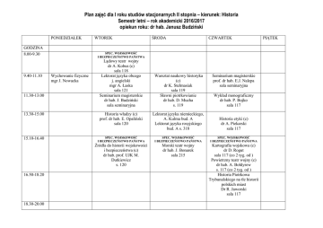 Plan zajęć dla I roku studiów stacjonarnych II stopnia – kierunek: Historia Semestr letni – rok akademicki 2016/2017 opiekun roku: dr hab. Janusz Budziński PONIEDZIAŁEK GODZINA 8.00-9.30 9.40-11.10 11.30-13.00 13.30-15.00 15.10-16.40 16.50-18.20 18.30-20.00 WTOREK ŚRODA CZWARTEK SPEC. WOJSKOWOŚĆ I BEZPIECZEŃSTWO PAŃSTWA Wychowanie fizyczne mgr J. Nowacka Lądowy teatr wojny dr A. Kobus (c) sala 118 Lektorat języka obcego j. angielski mgr A. Łaska sala 121 Seminarium magisterskie dr hab. J. Budziński sala seminaryjna Warsztat naukowy historyka (c) dr K. Stelmasiak sala 119 Sławni piotrkowianie dr hab. D. Mucha s. 119 Seminarium magisterskie prof. dr hab. E.J. Nalepa sala seminaryjna Wykład monograficzny dr hab. P. Bojko sala 117 Historia władzy (c) prof. dr hab. E. Opaliński sala 120 Lektorat języka niemieckiego, A. Kulma bud. A Lektorat języka rosyjskiego bud. A s. 318 Historia etyki (c) dr A. Piekarski sala 117 SPEC. WOJSKOWOŚĆ I BEZPIECZEŃSTWO PAŃSTWA SPEC. WOJSKOWOŚĆ I BEZPIECZEŃSTWO PAŃSTWA SPEC. WOJSKOWOŚĆ I BEZPIECZEŃSTWO PAŃSTWA Źródła do historii wojskowości i bezpieczeństwa (c) dr hab. prof. UJK M. Dutkiewicz s. 120 Morski teatr wojny dr hab. J. Bonarek sala 215 Kartografia wojskowa (c) dr D. Rogut sala 117 (co 2 tyg. od ) Powietrzny teatr wojny (c) dr hab. A. Bołdyrew s. 117 (co 2 tyg. od ) Historia Piotrkowa Trybunalskiego na tle historii polskich miast Dr R. Jaworski sala 117 PIĄTEK