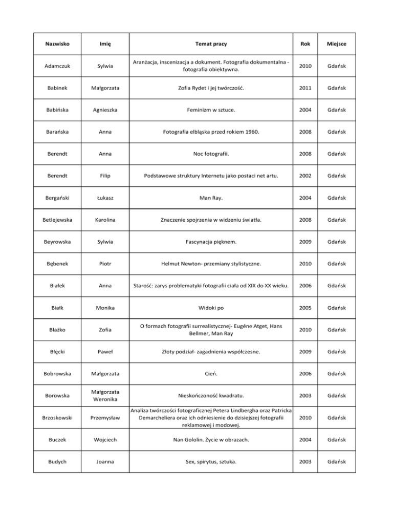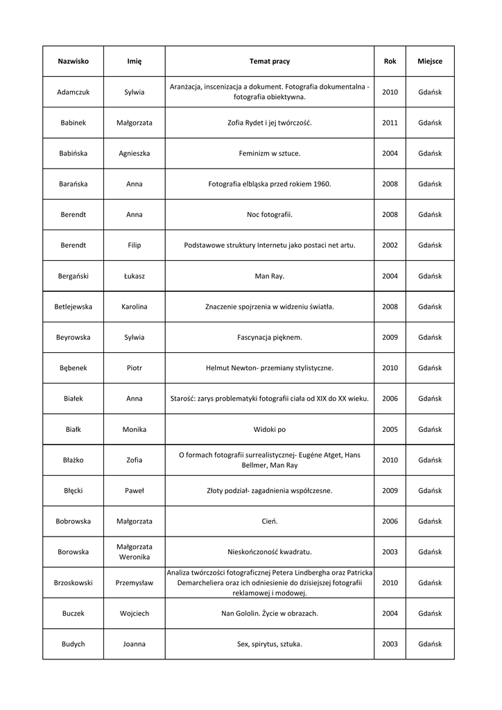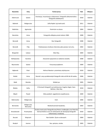 Nazwisko Imię Temat pracy Rok Miejsce Adamczuk Sylwia Aranżacja, inscenizacja a dokument. Fotografia dokumentalna fotografia obiektywna. 2010 Gdańsk Babinek Małgorzata Zofia Rydet i jej twórczość. 2011 Gdańsk Babińska Agnieszka Feminizm w sztuce. 2004 Gdańsk Barańska Anna Fotografia elbląska przed rokiem 1960. 2008 Gdańsk Berendt Anna Noc fotografii. 2008 Gdańsk Berendt Filip Podstawowe struktury Internetu jako postaci net artu. 2002 Gdańsk Bergański Łukasz Man Ray. 2004 Gdańsk Betlejewska Karolina Znaczenie spojrzenia w widzeniu światła. 2008 Gdańsk Beyrowska Sylwia Fascynacja pięknem. 2009 Gdańsk Bębenek Piotr Helmut Newton- przemiany stylistyczne. 2010 Gdańsk Białek Anna Starość: zarys problematyki fotografii ciała od XIX do XX wieku. 2006 Gdańsk Białk Monika Widoki po 2005 Gdańsk Błażko Zofia O formach fotografii surrealistycznej- Eugéne Atget, Hans Bellmer, Man Ray 2010 Gdańsk Błęcki Paweł Złoty podział- zagadnienia współczesne. 2009 Gdańsk Bobrowska Małgorzata Cień. 2006 Gdańsk Borowska Małgorzata Weronika Nieskończoność kwadratu. 2003 Gdańsk Brzoskowski Przemysław Analiza twórczości fotograficznej Petera Lindbergha oraz Patricka Demarcheliera oraz ich odniesienie do dzisiejszej fotografii reklamowej i modowej. 2010 Gdańsk Buczek Wojciech Nan Gololin. Życie w obrazach. 2004 Gdańsk Budych Joanna Sex, spirytus, sztuka. 2003 Gdańsk Burchardt Joanna Kondycja człowieka jako twórcy w wybranych kierunkach charakterystycznych dla sztuki XX wieku. 2003 Gdańsk Burdecka Iwona Wybrane zagadnienia fotografii cyfrowej. 2002 Gdańsk Burdyl Monika Laszlo Moholy-Nagy. Artysta i eksperymentator. 2007 Gdańsk Butowski Grzegorz Medialna projekcja manipulacji. 2003 Gdańsk Chytra Aleksandra Feminizm czy kobiecość. 2009 Gdańsk Cwaliński Grzegorz Antoni Śmierć 2005 Gdańsk Cyman Damian Fotografia jako instrument dokumentacji społecznej w świetle akcji F.S.A. 2010 Gdańsk Czapliński Marcin Uwodzenie niemożliwym. Dreszcz erotyczny na usługach manipulatorów. 2009 Gdańsk Ćwiek Maciej Ekspresjonizm w portrecie fotograficznym po 1945 roku. 2010 Gdańsk Ćwik Konrad Fotografowie Vogue'a. 2008 Gdańsk Danieluk Robert Fotoblog jako poszukiwanie nowej koncepcji dla fotografii. 2009 Gdańsk Dobosz Elżbieta Maria Fotoplastikon warszawski z Alei Jerozolimskich 51. 2005 Gdańsk Domurad Aleksandra Ciało jako pole walki w twórczości polskich artystek. 2006 Gdańsk Dras Piotr Badanie świadomości i odbioru znanych fotografii w społeczeństwie polskim. 2003 Gdańsk Drążkowski Mikołaj Manipulacja w najnowszej fotografii. 2010 Gdańsk Dulas Grzegorz Surrealizm/film/fotografia. Teorie ruchu w fotografii i kinie awangardowym. 2004 Gdańsk Durys Paulina Absurd w fotografii światowej na przełomie XX-XXI wieku. 2010 Gdańsk Dwórznik Robert Przestrzeń iluzoryczna- analiza twórczości Felice Variniego. 2005 Gdańsk Dytkowski Bernard Warsztaty fotograficzne w Gierałtowie "Uczestnictwo we wspólnocie". 2001 Gdańsk Dzienisz Adrianna Sztuka portretu fotograficznego w twórczości Zofii Rydet i Krzysztofa Gierałtowskiego. Porównanie. 2007 Gdańsk Garncarek Dawid Archeologia fotografii Jerzego Lewczyńskiego. 2010 Gdańsk Gąsiorowska Iwona Akt w fotografii czeskiej po II wojnie światowej. Charakterystyczne przykłady. 2010 Gdańsk Gąsiorowski Wojciech Estetyka fraktali. 2006 Gdańsk Getka Wojciech Problemy polskiej fotografii reklamowej w latach 90-tych. 2001 Gdańsk Gilewicz Agata Ciało w twórczości Zbigniewa Łagockiego. 2004 Gdańsk Glinka Anna Skrawki przestrzeni… 2005 Gdańsk Gorczyński Grzegorz Dylematy najnowszego piktorializmu polskiego. 2007 Gdańsk Grabowska Aneta Helmut Newton- Kreacje. 2009 Gdańsk Gramsa Dominika Zmiana tożsamości w autoportrecie. 2008 Gdańsk Gregorczyk Piotr Umysł, oko, otwór. 2002 Gdańsk Grys Katarzyna Przez wielkie A. 2003 Gdańsk Grzybowska Izabela Ciało jako ikona kultury współczesnej. 2004 Gdańsk Hebda Paulina Przestrzeń indywidualna. 2009 Gdańsk Heller Michał Epistemologiczny wymiar fotografii. 2004 Gdańsk Hoffmann Monika Jan Saudek. 2009 Gdańsk Huk Gabriela Fotografia a język. Studium z semiotyki fotografii. 2010 Gdańsk Hutel Tomasz Analiza porównawcza fotografii dokumentalnej Euene'a Atgeta i Augusta Sandera. 2006 Gdańsk Ilow Daria Kobieta jako artystka. 2005 Gdańsk Iwan Michał Araki. 2003 Gdańsk Iwański Adam Przypadek? 2004 Gdańsk Jabłońska Barbara Terapia sztuką fotografii osób niepełnosprawnych intelektualnie. 2004 Gdańsk Jabłoński Miszka Dzieło sztuki i autonomia w epoce cyfrowej archiwizacji danych. No chance of escape/ bez szansy na ucieczkę/. 2002 Gdańsk Jagodziński Dominik Antyfotografia. Pokaz zamknięty z 20 czerwca 1959 roku. 2002 Gdańsk Jakubiuk Karolina Próba odnalezienia sposobu wartościowania fotografiipamiętnik rozważań. 2008 Gdańsk Janowicz Paweł Twórczość Helmuta Newtona i Oliviera Toscaniego jako wzór dla współczesnego schockvertising'u. 2007 Gdańsk Janura Piotr Obecna sytuacja sztuki i fotografii artystycznej w dobie cyberkultury globalnej i społeczeństw sieciowych. 2009 Gdańsk Jarocki Robert Widzenie sugerowane. 2006 Gdańsk Jemielity Magdalena Fotografia jako medium ekspresji w polskich filmie animowanym. 2010 Gdańsk Jurek Agnieszka Współczesny zapis rzeczywistości. 2008 Gdańsk Kamiński Piotr Mario Giacomelli. Życie i twórczość. 2007 Gdańsk Kaniuka Jakub Twórczość Andrzeja Strumiłło. 2005 Gdańsk Karos-Bakun Anna Marian Schmidt - poszukiwanie transcendencji. 2006 Gdańsk Kawiecka Zuzanna Fotografia jako element konstrukcji filmu. 2003 Gdańsk Kiczorowski Grzegorz Zdzisław Beksiński. Fotografia z lat 1953-1959 2003 Gdańsk Klockowska Magdalena Sztuka dwóch decydujących momentów, czyli YING i YANG w fotografii. 2002 Gdańsk Knop Sylwia Karolina Kamień - materia wciąż żywa. 2005 Gdańsk Kołcon Agnieszka Skandal i prowokacja jako strategia artystyczna. 2003 Gdańsk Kołodziej Łukasz Artysta w weekend