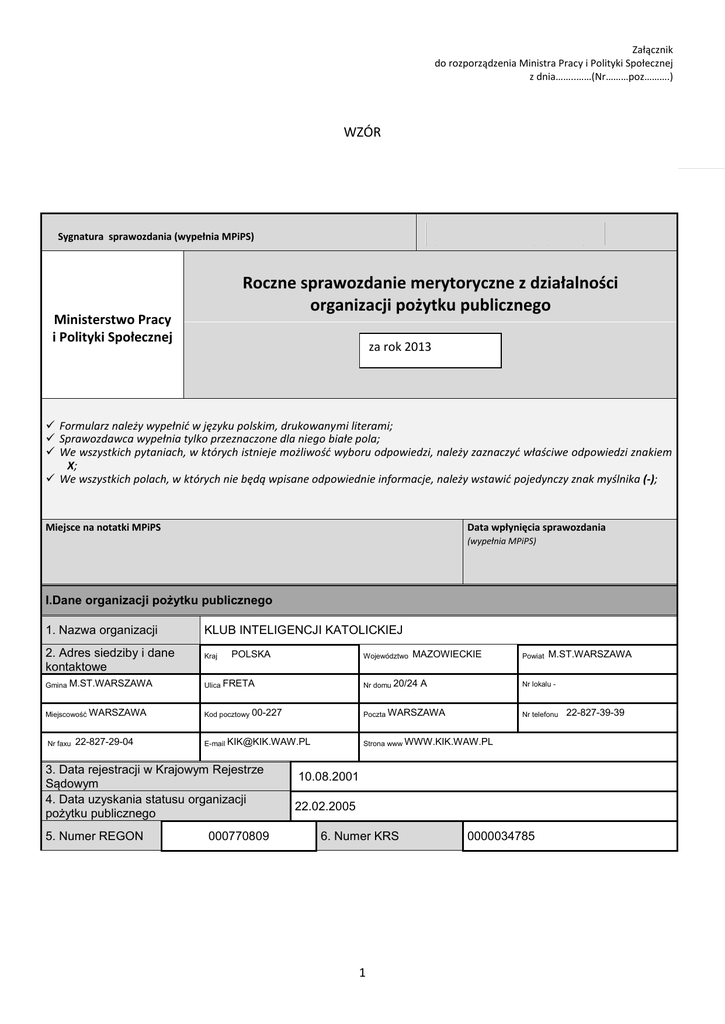 Sprawozdanie KIK jako OPP 2013 - Klub Inteligencji Katolickiej