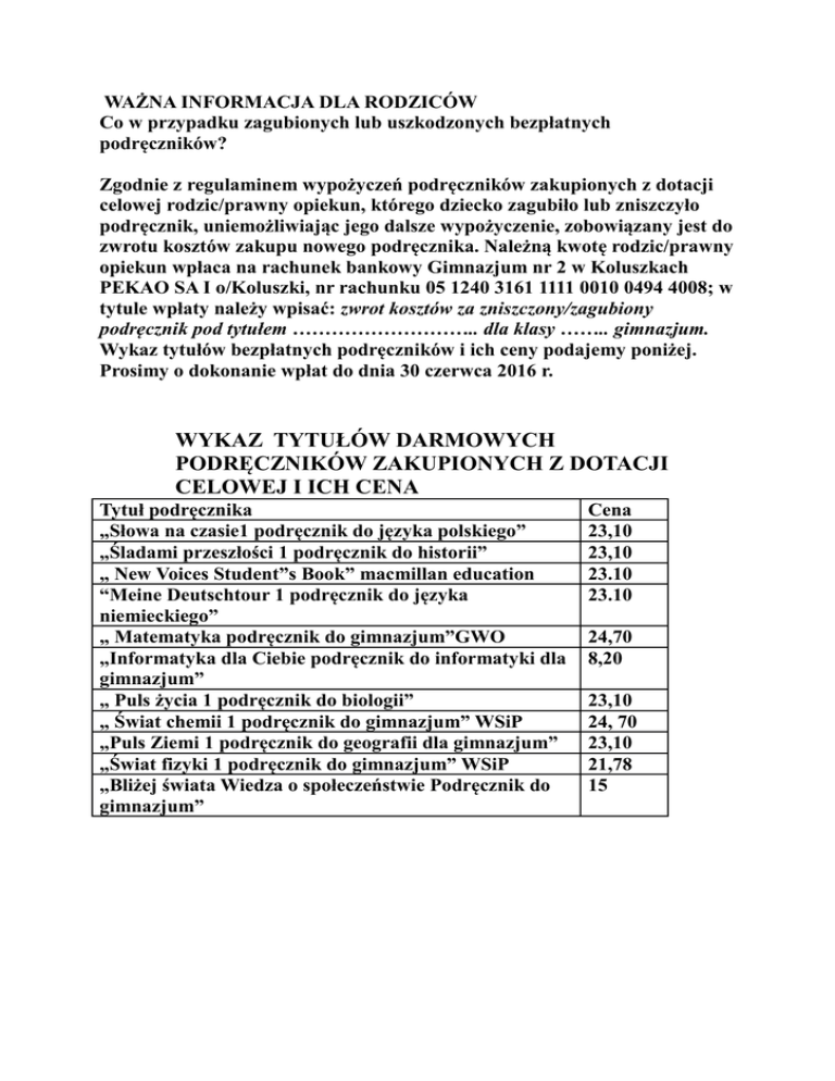 WAŻNA INFORMACJA DLA RODZICÓW Co w przypadku zagubionych lub uszkodzonych bezpłatnych podręczników? Zgodnie z regulaminem wypożyczeń podręczników zakupionych z dotacji celowej rodzic/prawny opiekun, którego dziecko zagubiło lub zniszczyło podręcznik, uniemożliwiając jego dalsze wypożyczenie, zobowiązany jest do zwrotu kosztów zakupu nowego podręcznika. Należną kwotę rodzic/prawny opiekun wpłaca na rachunek bankowy Gimnazjum nr 2 w Koluszkach PEKAO SA I o/Koluszki, nr rachunku 05 1240 3161 1111 0010 0494 4008; w tytule wpłaty należy wpisać: zwrot kosztów za zniszczony/zagubiony podręcznik pod tytułem ……………………….. dla klasy …….. gimnazjum. Wykaz tytułów bezpłatnych podręczników i ich ceny podajemy poniżej. Prosimy o dokonanie wpłat do dnia 30 czerwca 2016 r. WYKAZ TYTUŁÓW DARMOWYCH PODRĘCZNIKÓW ZAKUPIONYCH Z DOTACJI CELOWEJ I ICH CENA Tytuł podręcznika „Słowa na czasie1 podręcznik do języka polskiego” „Śladami przeszłości 1 podręcznik do historii” „ New Voices Student”s Book” macmillan education “Meine Deutschtour 1 podręcznik do języka niemieckiego” „ Matematyka podręcznik do gimnazjum”GWO „Informatyka dla Ciebie podręcznik do informatyki dla gimnazjum” „ Puls życia 1 podręcznik do biologii” „ Świat chemii 1 podręcznik do gimnazjum” WSiP „Puls Ziemi 1 podręcznik do geografii dla gimnazjum” „Świat fizyki 1 podręcznik do gimnazjum” WSiP „Bliżej świata Wiedza o społeczeństwie Podręcznik do gimnazjum” Cena 23,10 23,10 23.10 23.10 24,70 8,20 23,10 24, 70 23,10 21,78 15