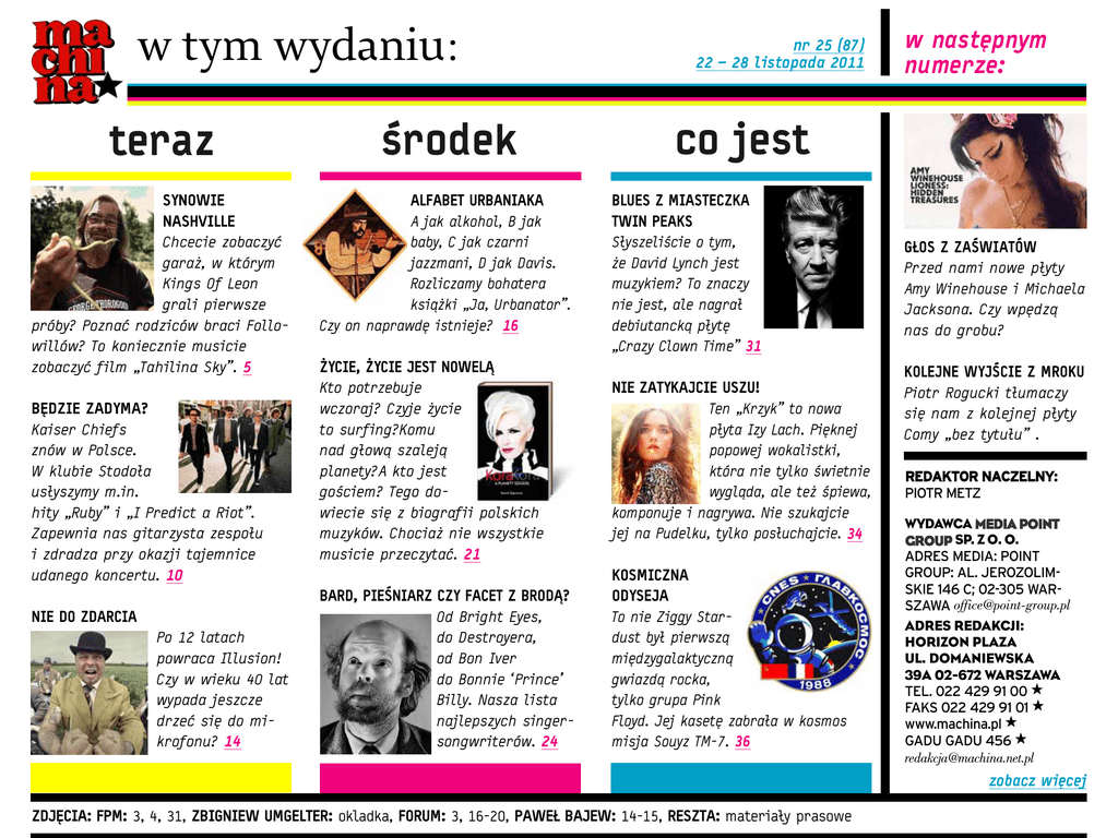 w tym wydaniu: teraz Êrodek SYNOWIE NASHVILLE Chcecie zobaczyç gara˝, w którym Kings Of Leon grali pierwsze próby? Poznaç rodziców braci Followillów? To koniecznie musicie zobaczyç film „Tahilina Sky”. 5 ALFABET URBANIAKA A jak alkohol, B jak baby, C jak czarni jazzmani, D jak Davis. Rozliczamy bohatera ksià˝ki „Ja, Urbanator”. Czy on naprawd´ istnieje? 16 B¢DZIE ZADYMA? Kaiser Chiefs znów w Polsce. W klubie Stodo∏a us∏yszymy m.in. hity „Ruby” i „I Predict a Riot”. Zapewnia nas gitarzysta zespo∏u i zdradza przy okazji tajemnice udanego koncertu. 10 NIE DO ZDARCIA Po 12 latach powraca Illusion! Czy w wieku 40 lat wypada jeszcze drzeç si´ do mikrofonu? 14 ˚YCIE, ˚YCIE JEST NOWELÑ Kto potrzebuje wczoraj? Czyje ˝ycie to surfing?Komu nad g∏owà szalejà planety?A kto jest goÊciem? Tego dowiecie si´ z biografii polskich muzyków. Chocia˝ nie wszystkie musicie przeczytaç. 21 BARD, PIEÂNIARZ CZY FACET Z BRODÑ? Od Bright Eyes, do Destroyera, od Bon Iver do Bonnie ‘Prince’ Billy. Nasza lista najlepszych singersongwriterów. 24 nr 25 (87) 22 – 28 listopada 2011 w nast´pnym numerze: co jest BLUES Z MIASTECZKA TWIN PEAKS S∏yszeliÊcie o tym, ˝e David Lynch jest muzykiem? To znaczy nie jest, ale nagra∏ debiutanckà p∏yt´ „Crazy Clown Time” 31 NIE ZATYKAJCIE USZU! Ten „Krzyk” to nowa p∏yta Izy Lach. Pi´knej popowej wokalistki, która nie tylko Êwietnie wyglàda, ale te˝ Êpiewa, komponuje i nagrywa. Nie szukajcie jej na Pudelku, tylko pos∏uchajcie. 34 KOSMICZNA ODYSEJA To nie Ziggy Stardust by∏ pierwszà mi´dzygalaktycznà gwiazdà rocka, tylko grupa Pink Floyd. Jej kaset´ zabra∏a w kosmos misja Souyz TM-7. 36 G¸OS Z ZAÂWIATÓW Przed nami nowe p∏yty Amy Winehouse i Michaela Jacksona. Czy wp´dzà nas do grobu? KOLEJNE WYJÂCIE Z MROKU Piotr Rogucki t∏umaczy si´ nam z kolejnej p∏yty Comy „bez tytu∏u” . REDAKTOR NACZELNY: PIOTR METZ WYDAWCA MEDIA POINT GROUP SP. Z O. O. ADRES MEDIA: POINT GROUP: AL. JEROZOLIMSKIE 146 C; 02-305 WARSZAWA [email protected] ADRES REDAKCJI: HORIZON PLAZA UL. DOMANIEWSKA 39A 02-672 WARSZAWA TEL. 022 429 91 00 H FAKS 022 429 91 01 H www.machina.pl H GADU GADU 456 H [email protected] zobacz wi´cej ZDJ¢CIA: FPM: 3, 4, 31, ZBIGNIEW UMGELTER: okladka, FORUM: 3, 16-20, PAWE¸ BAJEW: 14-15, RESZTA: materia∏y prasowe
