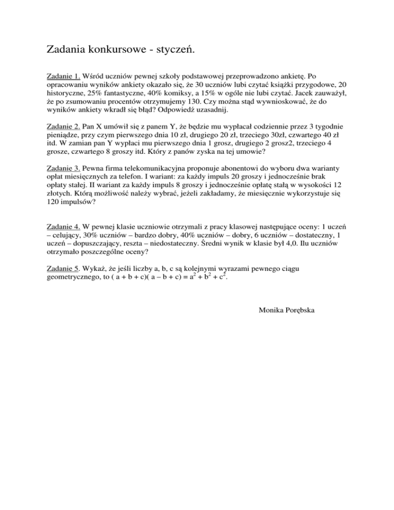 Zadania konkursowe - stycze . Zadanie 1. W ród uczniów pewnej szkoły podstawowej przeprowadzono ankiet . Po opracowaniu wyników ankiety okazało si , e 30 uczniów lubi czyta ksi ki przygodowe, 20 historyczne, 25% fantastyczne, 40% komiksy, a 15% w ogóle nie lubi czyta . Jacek zauwa ył, e po zsumowaniu procentów otrzymujemy 130. Czy mo na st d wywnioskowa , e do wyników ankiety wkradł si bł d? Odpowied uzasadnij. Zadanie 2. Pan X umówił si z panem Y, e b dzie mu wypłacał codziennie przez 3 tygodnie pieni dze, przy czym pierwszego dnia 10 zł, drugiego 20 zł, trzeciego 30zł, czwartego 40 zł itd. W zamian pan Y wypłaci mu pierwszego dnia 1 grosz, drugiego 2 grosz2, trzeciego 4 grosze, czwartego 8 groszy itd. Który z panów zyska na tej umowie? Zadanie 3. Pewna firma telekomunikacyjna proponuje abonentowi do wyboru dwa warianty opłat miesi cznych za telefon. I wariant: za ka dy impuls 20 groszy i jednocze nie brak opłaty stałej. II wariant za ka dy impuls 8 groszy i jednocze nie opłat stał w wysoko ci 12 złotych. Któr mo liwo nale y wybra , je eli zakładamy, e miesi cznie wykorzystuje si 120 impulsów? Zadanie 4. W pewnej klasie uczniowie otrzymali z pracy klasowej nast puj ce oceny: 1 ucze – celuj cy, 30% uczniów – bardzo dobry, 40% uczniów – dobry, 6 uczniów – dostateczny, 1 ucze – dopuszczaj cy, reszta – niedostateczny. redni wynik w klasie był 4,0. Ilu uczniów otrzymało poszczególne oceny? Zadanie 5. Wyka , e je li liczby a, b, c s kolejnymi wyrazami pewnego ci gu geometrycznego, to ( a + b + c)( a – b + c) = a2 + b2 + c2. Monika Por bska