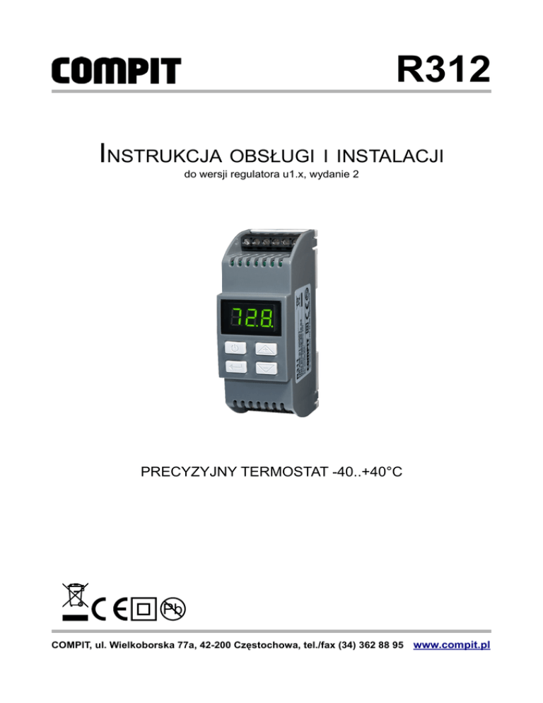 R312 INSTRUKCJA OBSŁUGI I INSTALACJI do wersji regulatora u1.x, wydanie 2 PRECYZYJNY TERMOSTAT -40..+40°C Pb COMPIT, ul. Wielkoborska 77a, 42-200 Częstochowa, tel./fax (34) 362 88 95 www.compit.pl Spis treści 1 Opis regulatora........................................................................................................................3 1.1 Przeznaczenie regulatora................................................................................................3 1.2 Dane techniczne..............................................................................................................3 1.3 Skład zestawu..................................................................................................................4 2 Zasady bezpieczeństwa..........................................................................................................4 3 Pozbywanie się urządzeń elektrycznych i elektronicznych.....................................................4 4 Montaż.....................................................................................................................................5 4.1 Opis konstrukcji................................................................................................................5 4.2 Warunki środowiskowe....................................................................................................6 4.3 Instalowanie regulatora....................................................................................................6 4.4 Podłączenie zasilania......................................................................................................6 4.5 Montaż i podłączenie czujników.......................................................................................7 5 Obsługa regulatora i opis działania.........................................................................................8 5.1 Opis klawiatury i wyświetlacza.........................................................................................8 5.2 Funkcja klawisza ON/OFF...............................................................................................8 5.3 Ustawienie parametrów...................................................................................................8 5.4 Opis działania...................................................................................................................9 5.4.1 Przykładowe schematy...........................................................................................11 5.4.2 Lista parametrów....................................................................................................13 6 Praca w sieci.........................................................................................................................14 6.1 Łączenie regulatorów w sieć..........................................................................................14 6.2 Tryby pracy w sieci.........................................................................................................14 6.3 Tworzenie sieci regulatorów R312.................................................................................16 DEKLARACJA ZGODNOŚCI...................................................................................................17 2 Instrukcja obsługi regulatora R312 wersja 1.x, wydanie 2, listopad 2011 1 Opis regulatora 1.1 Przeznaczenie regulatora Regulator R312 może służyć do załączana pomp ładujących, sterowania przepompowywaniem ciepłej wody pomiędzy zbiornikami, włączania wentylatorów, agregatów chłodniczych, sygnalizowania alarmów, sterowania dołączaniem wymiennika gruntowego itp. Współpracuje z czujnikami rezystancyjnymi o charakterystyce Pt1000. Dzięki wbudowanemu interfejsowi cyfrowemu RS-485 może być stosowany w systemach monitoringu. Regulatory R312 można łączyć w proste sieci, gdzie jeden regulator mierzy temperaturę i przesyła ją do pozostałych. Może to być temperatura zmierzona przez regulator R312, temperatura zewnętrzna zmierzona regulatorem pogodowym wyposażonym w funkcję pracy nadrzędnej (np: R321, R322, R327, R315.T2, R803) lub temperatura kotła CO, jeżeli regulator kotła (np: RAPID5N, RAPID5U) współpracuje z termostatem NANO. 1.2 Dane techniczne Zasilanie: Prąd pobierany przez regulator: Maksymalny prąd przekaźnika: Stopień ochrony regulatora: Temperatura otoczenia: Temperatura składowania: Wilgotność względna: Zakres pomiarowy: Rozdzielczość pomiaru temperatury: Dokładność pomiaru temperatury: Przyłącza: Wyświetlacz: Wymiary regulatora: Masa: 230V, 50Hz I = 0,02A In = 4 (2) A IP201 0..55°C 0..55°C 5 – 80% bez kondensacji pary wodnej T1: -40 .. +40°C 0,1°C Temperatury niższe od -19,9°C są wyświetlane z rozdzielczością 1°C 0,1°C Zaciski śrubowe 1x1,5mm² LED 3 znaki po 7 segmentów 36x105x65mm szerokość 2 segmenty 0,20kg 1 Regulator przeznaczony do zamontowania w szafie elektrotechnicznej Instrukcja obsługi regulatora R312 wersja 1.x, wydanie 2, listopad 2011 3 1.3 Skład zestawu L.p. 1 2 3 Opis Termostat mikroprocesorowy Instrukcja obsługi Karta gwarancyjna Typ R312 - Ilość 1 1 1 2 Zasady bezpieczeństwa Przed zainstalowaniem regulatora należy starannie przeczytać instrukcję obsługi. Regulator nie może być użytkowany niezgodnie z przeznaczeniem. Wszelkie prace przyłączeniowe mogą się odbywać tylko przy odłączonym napięciu zasilania, należy upewnić się, że przewody elektryczne nie są pod napięciem. Prace przyłączeniowe i montaż powinny być wykonane wyłącznie przez osoby z odpowiednimi kwalifikacjami i uprawnieniami, zgodnie z obowiązującymi przepisami i normami. Nie wolno instalować i użytkować regulatora z uszkodzoną obudową. Instalacja elektryczna, w której pracuje regulator, powinna być zabezpieczona bezpiecznikiem dobranym odpowiednio do stosowanych obciążeń. Regulator nie jest elementem bezpieczeństwa, nie może być wykor