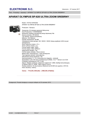 ELEKTRONIK S.C. Utworzono : 07 marzec 2017 Foto - Produkty > Aparaty > APARAT OLYMPUS SP-620 ULTRA ZOOM SREBRNY APARAT OLYMPUS SP-620 ULTRA ZOOM SREBRNY Model : FOTOLYAPA0302 APARAT OLYMPUS SP-620 ULTRA ZOOM SREBRNY Producent : Olympus Gwarancja: 24 miesiące gwarancji fabrycznej Kod Producenta: V103040SE000 Możliwość instalacji zewnętrznej lampy błyskowej: Nie Nazwa produktu: SP-620UZ Typ aparatu: Aparat kompaktowy Matryca: 16,6 Mpiksel Pamięć wbudowana: 59 MB Obsługiwane karty pamięci: SD / SDHC / SDXC (klasa prędkości UHS nie jest obsługiwana) Zoom optyczny (maks.): 21 x Zoom cyfrowy (maks.): 4 x Format zapisu zdjęć: JPEG Format zapisu video: MPEG-4 Nagrywanie dźwięku: Tak Format zapisu dźwięku: Wave (mono) Balans bieli: Automatyczny + tryby tematyczne Tryb regulacji ostrości: Automatyczny Wbudowana lampa błyskowa: Tak Samowyzwalacz: 2 / 12 s Automatyczna migawka - zwierzak Wyświetlacz LCD: Filtr barw podstawowych (RGB), 1/2,3 "" Sensor Live CCD Przekątna wyświetlacza LCD: 3 cale Złącza: Wejście zasilacza, połączone wyjście AV i USB, interfejs komunikacyjny Hi-Speed USB 2.0, HDMI - Mikro złącze (Typ D) Rodzaj zasilania: AA akumulatory Alkaliczne lub Ni-MH (nie zgodne z CR-V3) Kolor obudowy: srebrny Cena : 714,38 zł Brutto ( 585,56 zł Netto) Dostępność: Produkt dostępny w naszym sklepie od 23 czerwiec 2012 kontakt : - [email protected] Strona 1