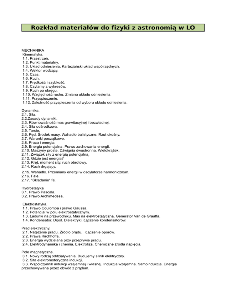 Rozkład materiałów do fizyki z astronomią w LO MECHANIKA Kinematyka. 1.1. Przestrzeń. 1.2. Punkt materialny. 1.3. Układ odniesienia. Kartezjański układ współrzędnych. 1.4. Wektor wodzący. 1.5. Czas. 1.6. Ruch. 1.7. Prędkość i szybkość. 1.8. Czytamy z wykresów. 1.9. Ruch po okręgu. 1.10. Względność ruchu. Zmiana układu odniesienia. 1.11. Przyspieszenie. 1.12. Zależność przyspieszenia od wyboru układu odniesienia. Dynamika. 2.1. Siła. 2.2.Zasady dynamiki. 2.3. Równoważność mas grawitacyjnej i bezwładnej. 2.4. Siła odśrodkowa. 2.5. Tarcie. 2.6. Pęd. Środek masy. Wahadło balistyczne. Rzut ukośny. 2.7. Warunki początkowe. 2.8. Praca i energia. 2.9. Energia potencjalna. Prawo zachowania energii. 2.10. Maszyny proste. Dźwignia dwustronna. Wielokrążek. 2.11. Związek siły z energią potencjalną. 2.12. Gdzie jest energia? 2.13. Kręt, moment sity, ruch obrotowy. 2.14. Ruch drgający. 2.15. Wahadło. Przemiany energii w oscylatorze harmonicznym. 2.16. Fale. 2.17. "Składanie" fal. Hydrostatyka 3.1. Prawo Pascala. 3.2. Prawo Archimedesa. Elektrostatyka. 1.1. Prawo Coulomba i prawo Gaussa. 1.2. Potencjał w polu elektrostatycznym. 1.3. Ładunki na przewodniku. Mas na elektrostatyczna. Generator Van de Graaffa. 1.4. Kondensator. Dipol. Dielektryki. Łączenie kondensatorów. Prąd elektryczny. 2.1. Natężenie prądu. Źródło prądu. Łączenie oporów. 2.2. Prawa Kirchhoffa. 2.3. Energia wydzielana przy przepływie prądu. 2.4. Elektrodynamika i chemia. Elektroliza. Chemiczne źródła napięcia. Pole magnetyczne. 3.1. Nowy rodzaj oddziaływania. Budujemy silnik elektryczny. 3.2. Sita elektromotoryczna indukcji. 3.3. Współczynnik indukcji wzajemnej i własnej. Indukcja wzajemna. Samoindukcja. Energia przechowywana przez obwód z prądem. 3.4. Pole magnetyczne w materii. Pole magnetyczne Ziemi. Prąd zmienny. 4.1. Zasilanie elektryczne w naszych domach. 4.2. Samoindukcja, pojemność i opór umowy w obwodzie prądu zmiennego. 4.3. Fale elektromagnetyczne. 4.4. Układ drgający. 4.5. Transformator. Rzut oka na mikroelektronikę. 5.1. Analogowy i cyfrowy system zapisu informacji. 5.2. Urządzenia półprzewodnikowe. Dioda, czyli złącze p-n. Tranzystor. Optyka geometryczna. 6.1. Falowa natura światła a optyka geometryczna. 6.2. Załamanie światła. 6.3. Pryzmat i rozszczepianie światła. 6.4. Barwy. 6.5. Odbicie światła. Zwierciadło płaskie. Zwierciadło wklęsłe. Tworzenie obrazów w zwierciadle wklęsłym. Tworzenie obrazów w zwierciadle wypukłym. Teleskop zwierciadlany. 6.6. Soczewki. Oczy kręgowców. 6.7. Dlaczego widzimy trójwymiarowo? 6.8. Przyrządy optyczne. Optyka falowa. 7.1. Światło nie jest wiązką promieni. Interferencja z dwóch szczelin. Siatka dyfrakcyjna. Interferencja w cienkich warstwach. Światło spolaryzowane. ELEMENTY MECHANIKI KWANTOWEJ Fale materii. 8.1. Wszystko fest falą. Cząstka swobodna. Cząstka w świecie jednowymiarowym uwięziona na odcinku o skończonej długości. 8.2. Model atomu. 8.3. Efekt fotoelektryczny. 8.4. Laser. TERMODYNAMIKA Podstawy termodynamiki. 9.1. Gaz doskonały. 9.2. Równanie Clapeyrona. 9.3. Energia wewnętrzna gazu doskonałego. 9.4. Przemiany gazowe. 9.5. Ciepło właściwe gazu doskonałego. 9.6. Pierwsza zasada termodynamiki. 9.7. Druga zasada termodynamiki. Struktura materii. 10.1. Wiązania. 10.2. Stany skupienia. Diagramy fazowe. 10.3. Zjawiska powierzchniowe. SZCZEGÓLNA TEORIA WZGLĘDNOŚCI Transformacja Lorentza. 1.1. Odkrycie teorii względności. 1.2. Dylatacja czasu. 1.3. Względność równoczesności i skrócenie Lorentza-Fitzgeralda. 1.4. Składanie prędkości. 1.5. "Paradoks" bliźniąt. Czasoprzestrzeń. O relacji między masą i energią. 2.1. Przestrzeń zdarzeń i linie świata. 2.2. Równoważność masy i energii. ELEMENTY FIZYKI JĄDROWEJ Jądro atomu. 3.1. Doświadczenie Rutherforda. 3.2. Struktura jądra atomu. 3.3. Energia wiązania. 3.4. Reakcje jądrowe. Wymuszone reakcje jądrowe. Spontaniczne przemiany Jądrowe. Czas połowicznego rozpadu. CZĄSTKI ELEMENTARNE Oddziaływania zachodzące między cząstkami elementarnymi. 4.1. Diagramy Feynmana. 4.2. Oddziaływania silne. 4.3. Oddziaływania słabe. ASTRONOMIA Wszechświat. 5.1. Początek istnienia Wszechświata. 5.2. Formowanie galaktyk. Układ Słoneczny. 6.1. Słońce. 6.2. Zjawisko pływów. 6.3. Przegląd planet Układu Słonecznego. Gwiazdy. 7.1. Słońce jest jedną z wielu gwiazd. 7.2. Pomiary odległości kosmicznych. 7.3. Skąd chemiczny gwiazd, ich temperatura i inne własności. 7.4. Ewolucja gwiazdy.
