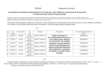 Miedźna dnia, 25.01.2011r. WYKAZ nieruchomości niezabudowanych położonych we Frydku przy ulicy Miodowej przeznaczonych do sprzedaży w drodze przetargu ustnego nieograniczonego. Na podstawie art.30 ust.1 i 2 pkt 3 ustawy z dnia 8 marca 1990r. o samorządzie gminnym (jednolity tekst z 2001r. Dz.U. nr 142 poz.159) oraz art.35 ust.1, ust.2, ustawy z dnia 21 sierpnia 1997r. o gospodarce nieruchomościami (tekst jednolity z 2010r. DZ. U. Nr.102, poz. 65) i Uchwały nr XXV/183/2008 Rady Gminy Miedźna z dnia 05.08.2008r. w sprawie sprzedaży nieruchomości niezabudowanych położonych we Frydku przy ulicy Miodowej w drodze publicznego przetargu ustnego nieograniczonego. Wójt Gminy Miedźna podaje do publicznej wiadomości wykaz nieruchomości niezabudowanych stanowiących własność Gminy Miedźna, położonych we Frydku przy ulicy Miodowej przeznaczonych do sprzedaży w drodze przetargu ustnego nieograniczonego. § 1 Lp Nr działki Powierzchnia Nr KW Położenie Przeznaczenie Cena nieruchomości gruntowej brutto 1. 524/47 0,1485 KA1P /00034114/6 Frydek ul. Miodowa Działki niezabudowane. 90 000,00 zł Frydek ul. Miodowa 2. 525/47 0,1473 KA1P /00034114/6 3. 526/47 0,1451 KA1P /00034114/6 Frydek ul. Miodowa 4. 528/47 0,1442 KA1P /00034114/6 Frydek ul. Miodowa 5. 529/47 0,1442 KA1P /00034114/6 Frydek ul. Miodowa 6. 530/47 0,1434 KA1P /00034114/6 Frydek ul. Miodowa Decyzja Burmistrza Pszczyny na rzecz Wójta Gminy Miedźna UiA7332/213/07 z 23.10.2007r. ustalająca warunki zabudowy dla inwestycji polegającej na budowie jedynastu budynków jednorodzinnych z garażami. Do wglądu w Urzędzie Gminy Miedźna. 89 500,00 zł 88 000,00 zł 87 400,00 zł 87 400,00 zł 87 000,00 zł § 2 Termin do złożenia wniosku przez osoby, którym przysługuje pierwszeństwo w nabyciu nieruchomości na podstawie art. 34 ust.1 pkt 1 i 2 ustawy dnia 21 sierpnia 1997r. o Gospodarce nieruchomościami /tekst jednolity z 2010r. Dz. U. Nr.102, poz. 65/ ustala się na 6 tygodni licząc od dnia wywieszenia wykazu tj. do dnia 07.03.2011r. z § 3 Niniejszy wykaz podlega wywieszeniu na tablicy ogłoszeń w Urzędzie Gminy Miedźna na okres 21 dni. Informacje w przedmiotowej sprawie można uzyskać w Urzędzie Gminy Miedźna w REFERACIE GOSPODARKI KOMUNALNEJ, OCHRONY ŚRODOWISKA, GEODEZJI I MIENIA lub telefonicznie (032) 211-61-96 wew. 20. Wykaz wywieszono dniu: 25.01.2011r. Wykaz zdjęto w dniu:..........................