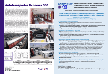 Autotransporter Hcceerrs 330 Wagon Autotransporter produkcji ALSTOM KONSTAL SA (symbol kolejowy Hcceerrs 330) jest czteroczęściową, krótko sprzężoną piętrową jednostką do przewozu samochodów osobowych. Obydwa poziomy ładunkowe są oświetlone. Oświetlenie włącza się automatycznie po włączeniu pompy hydraulicznej. Cała obsługa – otwieranie i zamykanie drzwi, opuszczanie i podnoszenie ramp (klap) przejazdowych, podnoszenie i opuszczanie dachu oraz bocznych zasuw wentylacyjnych – jest zautomatyzowana, ma napęd hydrauliczny i jest sterowana z dowolnej z dwóch skrzynek sterowniczych, znajdujących się na przeciwległych końcach, długiej na prawie 55 m, jednostki. W Hcceerrs 330, dzięki nowatorskim rozwiązaniom i zamkniętej, przegubowej konstrukcji czas rozładunku i załadunku jest znacznie skrócony, znacznie też polepszono bezpieczeństwo przewozu oraz ochronę przed kradzieżami i uszkodzeniami transportowanych pojazdów, w porównaniu do klasycznych wagonów do przewozu samochodów. Ponadto pojazdy nie muszą być już konserwowane na czas przewozu, co znacznie skraca czas załadunku i pozwala zmniejszać koszty oraz sprzyja ochronie środowiska (w wagonach o klasycznej konstrukcji samochody przed załadunkiem muszą być woskowane a następnie czyszczone po dotarciu do miejsca przeznaczenia). Jednostki Hcceerrs 330 Autotransporter mogą być łączone w dłuższe pociągi (do 7 jednostek). Odbiorcą tych wagonów jest niemiecka firma ATG Logistic. Związek Europejskiego Przemysłu Kolejowego – UNIFE Stowarzyszenie Inżynierów i Techników Komunikacji RP Centrum Naukowo-Techniczne Kolejnictwa zapraszają na ogólnopolską konferencją naukowo-techniczną Polski przemysł i zaplecze naprawcze transportu kolejowego w warunkach konkurencji na europejskim rynku kolejowym Zakopane, 18–20 lutego 2004 r. Pod patronatem Prezesa Urzędu Transportu Kolejowego ► Polityka transportowa Unii Europejskiej ● Rola transportu w gospodarce. Polityka zrównoważonego rozwoju transportu. Polski transport kolejowy na tle Unii Europejskiej. ● Instytucje unijne odpowiedzialne za transport kolejowy. Zasady tworzenia regulacji prawnych w Unii Europejskiej. Najważniejsze unijne akty prawne w dziedzinie transportu kolejowego. ● Zagadnienia interoperacyjności kolei w Unii Europejskiej. ► Europejski przemysł transportu szynowego ● Przemysł i zaplecze naprawcze dla transportu szynowego w warunkach wspólnego rynku unijnego. Konsolidacja i kooperacja. ● Zasady udziału przemysłu kolejowego i zaplecza naprawczego w procesie tworzenia i konsultacji prawa unijnego. Aktualne propozycje aktów prawnych. ● Rola i zadania UNIFE. ► Normalizacja, badania i rozwój technologii w Unii Europejskiej ● Normalizacja techniczna w Unii Europejskiej. Zakres prac komitetów technicznych opracowujących normy dla kolei – CEN TC256 i CENELEC TC9X. Zasady współpracy z CEN i CENELEC po uzyskaniu przez PKN statusu pełnoprawnego członka europejskich organizacji normalizacyjnych. ● Europejskie i międzynarodowe organizacje kolejowe – UIC, OSZhD, CER, OTIF, AEIF, ERRI. ● Europejskie i międzynarodowe projekty kolejowe. Projekty badawcze, sieci tematyczne, projekty demonstracyjne i wdrożeniowe. Zasady finansowania badań naukowych w Unii Europejskiej. ● Przykładowe programy badawcze dofinansowywane z środków unijnych: ERRAC, NOEMI, SAMNET, MODULAR TRAIN. Możliwości korzystania z nich przez przemysł krajowy. Długość 54 m Długość ładunkowa – dolny poziom 52,68 m – górny poziom 52,50 m Wysokość 9,20 m Masa własna 65,06 t Masa ładunkowa 48 t ALSTOM KONSTAL S.A ul. Katowicka 104 41-300 Chorzów tel. 0-32 349 10 00, fax 0-32 349 14 30 ► Standaryzacja techniczna i certyfikacja ● Dyrektywy o interoperacyjności kolei oraz uzupełniające je Techniczne Specyfikacje dla Interoperacyjności. Prezentacje specyfikacji TSI dla kolei konwencjonalnych. Minimalne warunki niezbędne do prowadzenia usług w zakresie napraw i utrzymania technicznego taboru. ● System oceny zgodności. ► Przygotowanie polskiego przemysłu i zaplecza naprawczego do udziału we wspólnym rynku ● Możliwości włączania polskiego przemysłu w europejskie prace na rzecz kolei. ● Panel dyskusyjny. Informacje: SITK RP Oddział w Krakowie 31-113 Kraków, ul. Straszewskiego 28 Biuro Oddziału SITK RP w Krakowie, tel. (12) 423 10 82, fax (12) 423 10 82, e-mail: [email protected]