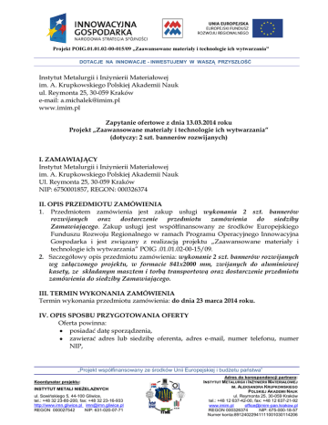 Projekt POIG.01.01.02-00-015/09 „Zaawansowane materiały i technologie ich wytwarzania” DOTACJE NA INNOWACJE - INWESTUJEMY W WASZĄ PRZYSZŁOŚĆ Instytut Metalurgii i Inżynierii Materiałowej im. A. Krupkowskiego Polskiej Akademii Nauk ul. Reymonta 25, 30-059 Kraków e-mail: [email protected] www.imim.pl Zapytanie ofertowe z dnia 13.03.2014 roku Projekt „Zaawansowane materiały i technologie ich wytwarzania” (dotyczy: 2 szt. bannerów rozwijanych) I. ZAMAWIAJĄCY Instytut Metalurgii i Inżynierii Materiałowej im. A. Krupkowskiego Polskiej Akademii Nauk Ul. Reymonta 25, 30-059 Kraków NIP: 6750001857, REGON: 000326374 II. OPIS PRZEDMIOTU ZAMÓWIENIA 1. Przedmiotem zamówienia jest zakup usługi wykonania 2 szt. bannerów rozwijanych oraz dostarczenie przedmiotu zamówienia do siedziby Zamawiającego. Zakup usługi jest współfinansowany ze środków Europejskiego Funduszu Rozwoju Regionalnego w ramach Programu Operacyjnego Innowacyjna Gospodarka i jest związany z realizacją projektu „Zaawansowane materiały i technologie ich wytwarzania” POIG .01.01.02-00-15/09. 2. Szczegółowy opis przedmiotu zamówienia: wykonanie 2 szt. bannerów rozwijanych wg załączonego projektu, w formacie 841x2000 mm, zwijanych do aluminiowej kasety, ze składanym masztem i torbą transportową oraz dostarczenie przedmiotu zamówienia do siedziby Zamawiającego. III. TERMIN WYKONANIA ZAMÓWIENIA Termin wykonania przedmiotu zamówienia: do dnia 23 marca 2014 roku. IV. OPIS SPOSBU PRZYGOTOWANIA OFERTY Oferta powinna: posiadać datę sporządzenia, zawierać adres lub siedzibę oferenta, adres e-mail, numer telefonu, numer NIP, „Projekt współfinansowany ze środków Unii Europejskiej i budżetu państwa” Koordynator projektu: INSTYTUT METALI NIEŻELAZNYCH ul. Sowińskiego 5, 44-100 Gliwice, tel.: +48 32 23-80-200, fax: +48 32 23-16-933 http://www.imn.gliwice.pl [email protected] REGON 000027542 NIP: 631-020-07-71 Adres do korespondencji partnera: INSTYTUT METALURGII I INŻYNIERII MATERIAŁOWEJ IM. ALEKSANDRA KRUPKOWSKIEGO POLSKIEJ AKADEMII NAUK ul. Reymonta 25, 30-059 Kraków tel.: +48 12 637-42-00, fax: +48 12 637-21-92 www.imim.pl [email protected] REGON 000326374 NIP: 675-000-18-57 Numer konta:89124022941111001030114206 Projekt POIG.01.01.02-00-015/09 „Zaawansowane materiały i technologie ich wytwarzania” DOTACJE NA INNOWACJE - INWESTUJEMY W WASZĄ PRZYSZŁOŚĆ określać całkowitą cenę brutto usługi łącznie z kosztami transportu, ewentualnymi kosztami dodatkowymi i innymi kosztami związanymi bezpośrednio z przedmiotem zapytania ofertowego V. MIEJSCE ORAZ TERMIN SKŁADANIA OFERT 1. Oferta powinna zostać przesłana za pośrednictwem: poczty elektronicznej na adres: [email protected] najpóźniej do dnia 19 marca 2014 roku do godziny 12.00. 2. Oferty złożone po terminie nie będą rozpatrywane. 3. Oferent może przed upływem terminu składania ofert zmienić lub wycofać swoją ofertę. 4. W toku badania i oceny ofert Zamawiający może żądać od Oferentów wyjaśnień dotyczących treści złożonych ofert. 5. Ocena ofert zostanie dokonana w dniu 19 marca 2014 roku o godz. 16.00, a do Oferenta, który przedstawił najkorzystniejszą ofertę zostanie wysłane zamówienie, zgodnie z przygotowaną ofertą. VI. OCENA OFERT Zamawiający dokona oceny ważnych ofert na podstawie następujących kryteriów: Cena - 100 % VII. DODATKOWE INFORMACJE Dodatkowych informacji merytorycznych udziela Pan Tomasz Gancarz pod numerem telefonu 12 295 28 24 oraz pod adresem email: [email protected] . „Projekt współfinansowany ze środków Unii Europejskiej i budżetu państwa” Koordynator projektu: INSTYTUT METALI NIEŻELAZNYCH ul. Sowińskiego 5, 44-100 Gliwice, tel.: +48 32 23-80-200, fax: +48 32 23-16-933 http://www.imn.gliwice.pl [email protected] REGON 000027542 NIP: 631-020-07-71 Adres do korespondencji partnera: INSTYTUT METALURGII I INŻYNIERII MATERIAŁOWEJ IM. ALEKSANDRA KRUPKOWSKIEGO POLSKIEJ AKADEMII NAUK ul. Reymonta 25, 30-059 Kraków tel.: +48 12 637-42-00, fax: +48 12 637-21-92 www.imim.pl [email protected] REGON 000326374 NIP: 675-000-18-57 Numer konta:89124022941111001030114206