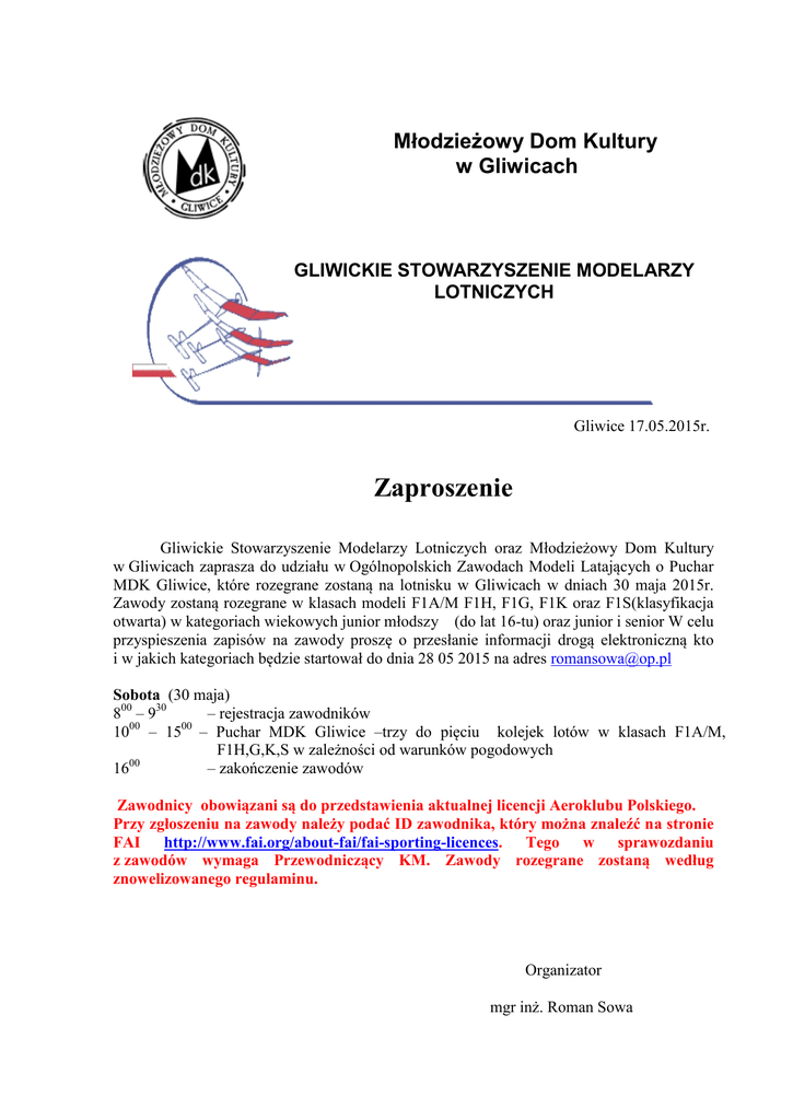 Młodzieżowy Dom Kultury w Gliwicach GLIWICKIE STOWARZYSZENIE MODELARZY LOTNICZYCH Gliwice 17.05.2015r. Zaproszenie Gliwickie Stowarzyszenie Modelarzy Lotniczych oraz Młodzieżowy Dom Kultury w Gliwicach zaprasza do udziału w Ogólnopolskich Zawodach Modeli Latających o Puchar MDK Gliwice, które rozegrane zostaną na lotnisku w Gliwicach w dniach 30 maja 2015r. Zawody zostaną rozegrane w klasach modeli F1A/M F1H, F1G, F1K oraz F1S(klasyfikacja otwarta) w kategoriach wiekowych junior młodszy (do lat 16-tu) oraz junior i senior W celu przyspieszenia zapisów na zawody proszę o przesłanie informacji drogą elektroniczną kto i w jakich kategoriach będzie startował do dnia 28 05 2015 na adres [email protected] Sobota (30 maja) 800 – 930 – rejestracja zawodników 1000 – 1500 – Puchar MDK Gliwice –trzy do pięciu kolejek lotów w klasach F1A/M, F1H,G,K,S w zależności od warunków pogodowych 00 16 – zakończenie zawodów Zawodnicy obowiązani są do przedstawienia aktualnej licencji Aeroklubu Polskiego. Przy zgłoszeniu na zawody należy podać ID zawodnika, który można znaleźć na stronie FAI http://www.fai.org/about-fai/fai-sporting-licences. Tego w sprawozdaniu z zawodów wymaga Przewodniczący KM. Zawody rozegrane zostaną według znowelizowanego regulaminu. Organizator mgr inż. Roman Sowa