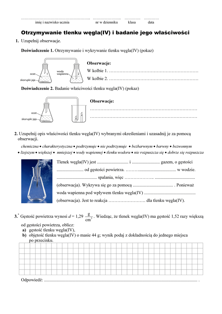 ……………………………………………….. ………………….. imię i nazwisko ucznia nr w dzienniku …………. klasa ………… data Otrzymywanie tlenku węgla(IV) i badanie jego właściwości 1. Uzupełnij obserwacje. Doświadczenie 1. Otrzymywanie i wykrywanie tlenku węgla(IV) (pokaz) Obserwacje: W kolbie 1. …………………………………………………… W kolbie 2. …………………………………………………… Doświadczenie 2. Badanie właściwości tlenku węgla(IV) (pokaz) Obserwacje: ……………………………………………………………… ……………………………………………………………… 2. Uzupełnij opis właściwości tlenku węgla(IV) wybranymi określeniami i uzasadnij je za pomocą obserwacji. chemiczna • charakterystyczna • podtrzymuje • nie podtrzymuje • bezbarwnym • barwny • bezwonnym • lżejszym • większej • mniejszej • wody wapiennej • tlenku wodoru • nie rozpuszcza się • dobrze się rozpuszcza Tlenek węgla(IV) jest ............................ i ......................... gazem, o gęstości ........................ od gęstości powietrza. ………................................. w wodzie. .................................... spalania, więc ……………….. .................................... (obserwacja). Wykrywa się go za pomocą .................................... . Ponieważ woda wapienna pod wpływem tlenku węgla(IV) .............................................. (obserwacja). Jest to reakcja ……………………. dla tlenku węgla(IV). 3.* Gęstość powietrza wynosi d = 1,29 g . Wiedząc, że tlenek węgla(IV) ma gęstość 1,52 razy większą cm3 od gęstości powietrza, oblicz: a) gęstość tlenku węgla(IV), b) objętość tlenku węgla(IV) o masie 44 g; wynik podaj z dokładnością do jednego miejsca po przecinku. Odpowiedź: ......................................................................................................................................... . Otrzymywanie tlenku węgla(IV) i badanie jego właściwości 1. Podkreśl poprawny zapis obserwacji. Doświadczenie 1. Otrzymywanie i wykrywanie tlenku węgla(IV) (pokaz) Obserwacje: a) W kolbie 1. nie zaszły widoczne zmiany. b) W kolbie 1. wydzieliły się pęcherzyki gazu. c) Woda wapienna nie zmieniła zabarwienia. d) Woda wapienna zmętniała. Doświadczenie 2. Badanie właściwości tlenku węgla(IV) (pokaz) Obserwacje: a) Pierwsza zgasła krótsza świeca. b) Pierwsza zgasła dłuższa świeca. 2.Uzupełnij wnioski z doświadczeń właściwymi wyrażeniami. gaśnie • nie podtrzymuje spalania • opada na dno naczynia • mętnieje • zmieniła zabarwienie • wody wapiennej • gazowym a) Tlenek węgla(IV) można wykryć za pomocą ............................................. . b) Świece zgasły, ponieważ tlenek węgla(IV) .................................................. .......................................................................................................................... . c) Tlenek węgla(IV) ma gęstość większą od powietrza, więc ........................... .......................................................................................................................... . d) Woda wapienna pod wpływem tlenku węgla(IV) ....................................... .