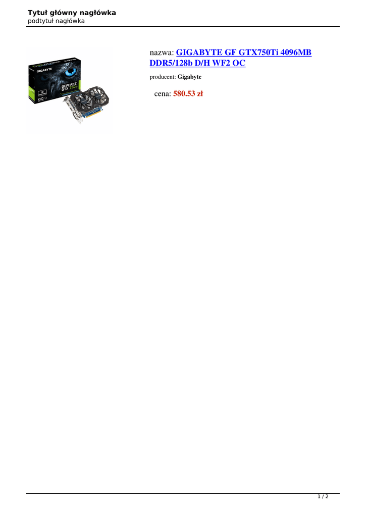 Tytuł główny nagłówka podtytuł nagłówka nazwa: GIGABYTE GF GTX750Ti 4096MB DDR5/128b D/H WF2 OC producent: Gigabyte cena: 580.53 zł 1/2 Tytuł główny nagłówka podtytuł nagłówka Strona o towarze nazwa wartość http://www.gigabyte.com/products/product -page.aspx?pid=5572#kf 2/2