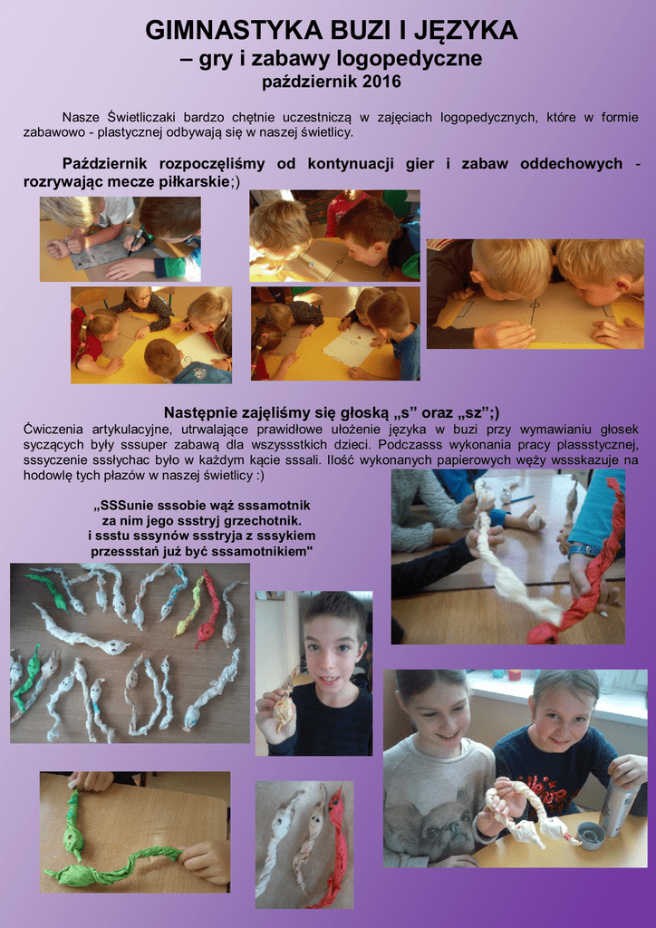GIMNASTYKA BUZI I JĘZYKA – gry i zabawy logopedyczne październik 2016 Nasze Świetliczaki bardzo chętnie uczestniczą w zajęciach logopedycznych, które w formie zabawowo - plastycznej odbywają się w naszej świetlicy. Październik rozpoczęliśmy od kontynuacji gier i zabaw oddechowych rozrywając mecze piłkarskie;) Następnie zajęliśmy się głoską „s” oraz „sz”;) Ćwiczenia artykulacyjne, utrwalające prawidłowe ułożenie języka w buzi przy wymawianiu głosek syczących były sssuper zabawą dla wszyssstkich dzieci. Podczasss wykonania pracy plassstycznej, sssyczenie sssłychac było w każdym kącie sssali. Ilość wykonanych papierowych węży wssskazuje na hodowlę tych płazów w naszej świetlicy :) „SSSunie sssobie wąż sssamotnik za nim jego ssstryj grzechotnik. i ssstu sssynów ssstryja z sssykiem przessstań już być sssamotnikiem" Zabawa usprawniająca artykulatory (język, wargi ) Prowadzący opowiada dzieciom historię o wężu, dzieci naśladują ruchem języka ćwiczenia pokazywane przez prowadzącego. W pewnej jaskini spał wąż samotnik (język leży płasko na dnie jamy ustnej). Kiedy się obudził zaczął chodzić po całej jaskini (poruszamy czubkiem języka za dolnymi zębami). Wąż wspinał się po ścianach jaskini w górę (dotykamy językiem do dziąseł za górnymi zębami). Wąż rozglądał się dookoła (oblizujemy górne i dolne zęby od wewnętrznej strony). Wąż głośno syczał sssss.... (zaciskamy zęby, rozciągamy usta i mówimy sssss....) Wspólne stworzyliśmy grę planszową usprawniającą artykulator z akcentem na wymowę i rozróżnianie głosek; „s” i „sz”: Różnicowanie głosek w tym przypadku z szeregu szumiącego i syczącego cieszyło się na zajęciach powodzeniem. Z prostej przyczyny - grę w całości dzieci przygotowały same. Zbiorowo malowały, naklejały, wyszukiwały w gazetkach ilustracje z głoskami "sz" i "s" w nagłosie, śródgłosie i wygłosie. Samo wyszukiwanie obrazków było już świetną zabawą. Ta gra będzie w świetlicy dostępna dla każdego świetliczaka. Idąc za ciosem - będziemy takich gier "produkować" więcej. Może dzięki nim powrócimy do częstszego spędzania czasu przy grach planszowych - ograniczając czas spędzany przed komputerem. Anna Szczepaniak wychowawcy świetlicy