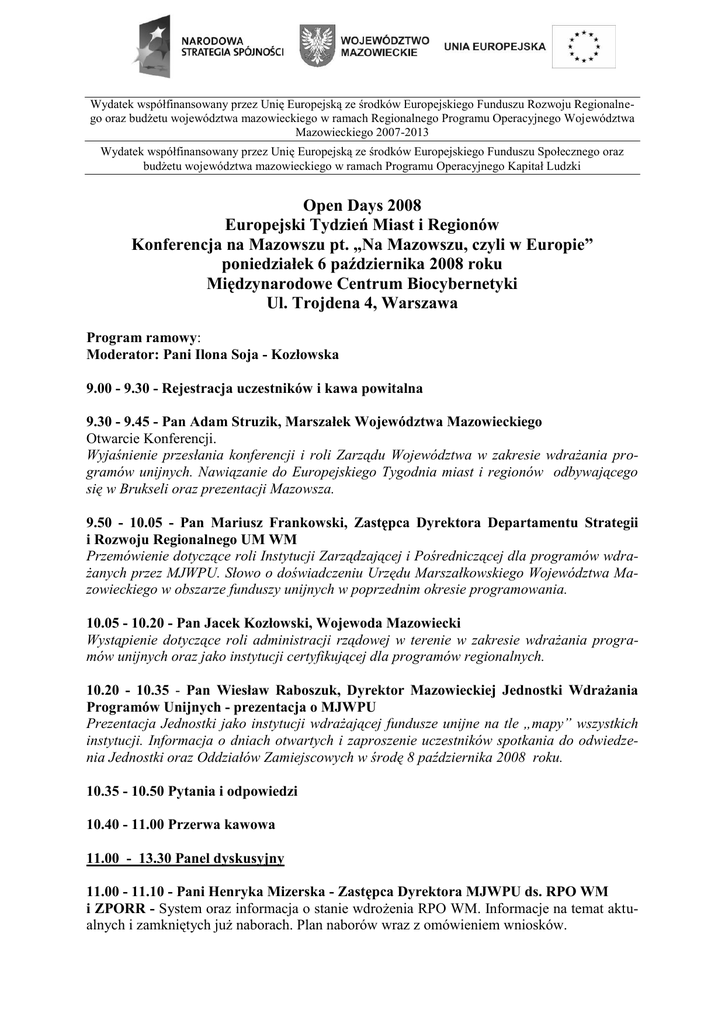 Wydatek współfinansowany przez Unię Europejską ze środków Europejskiego Funduszu Rozwoju Regionalnego oraz budżetu województwa mazowieckiego w ramach Regionalnego Programu Operacyjnego Województwa Mazowieckiego 2007-2013 Wydatek współfinansowany przez Unię Europejską ze środków Europejskiego Funduszu Społecznego oraz budżetu województwa mazowieckiego w ramach Programu Operacyjnego Kapitał Ludzki Open Days 2008 Europejski Tydzień Miast i Regionów Konferencja na Mazowszu pt. „Na Mazowszu, czyli w Europie” poniedziałek 6 października 2008 roku Międzynarodowe Centrum Biocybernetyki Ul. Trojdena 4, Warszawa Program ramowy: Moderator: Pani Ilona Soja - Kozłowska 9.00 - 9.30 - Rejestracja uczestników i kawa powitalna 9.30 - 9.45 - Pan Adam Struzik, Marszałek Województwa Mazowieckiego Otwarcie Konferencji. Wyjaśnienie przesłania konferencji i roli Zarządu Województwa w zakresie wdrażania programów unijnych. Nawiązanie do Europejskiego Tygodnia miast i regionów odbywającego się w Brukseli oraz prezentacji Mazowsza. 9.50 - 10.05 - Pan Mariusz Frankowski, Zastępca Dyrektora Departamentu Strategii i Rozwoju Regionalnego UM WM Przemówienie dotyczące roli Instytucji Zarządzającej i Pośredniczącej dla programów wdrażanych przez MJWPU. Słowo o doświadczeniu Urzędu Marszałkowskiego Województwa Mazowieckiego w obszarze funduszy unijnych w poprzednim okresie programowania. 10.05 - 10.20 - Pan Jacek Kozłowski, Wojewoda Mazowiecki Wystąpienie dotyczące roli administracji rządowej w terenie w zakresie wdrażania programów unijnych oraz jako instytucji certyfikującej dla programów regionalnych. 10.20 - 10.35 - Pan Wiesław Raboszuk, Dyrektor Mazowieckiej Jednostki Wdrażania Programów Unijnych - prezentacja o MJWPU Prezentacja Jednostki jako instytucji wdrażającej fundusze unijne na tle „mapy” wszystkich instytucji. Informacja o dniach otwartych i zaproszenie uczestników spotkania do odwiedzenia Jednostki oraz Oddziałów Zamiejscowych w środę 8 października 2008 roku. 10.35 - 10.50 Pytania i odpowiedzi 10.40 - 11.00 Przerwa kawowa 11.00 - 13.30 Panel dyskusyjny 11.00 - 11.10 - Pani Henryka Mizerska - Zastępca Dyrektora MJWPU ds. RPO WM i ZPORR - System oraz informacja o stanie wdrożenia RPO WM. Informacje na temat aktualnych i zamkniętych już naborach. Plan naborów wraz z omówieniem wniosków. 11.10 - 11.40 Panel dyskusyjny Regionalny Program Operacyjny Województwa Mazowieckiego Moderator: Pani Larysa Banaszewska–Wiśniewska - Wydział Wdrażania Priorytetu I, II RPO WM / MJWPU Uczestnicy dyskusji: 1. Pan Piotr Okienczyc (Prezes Zarządu), Pan Krzysztof Klimaszewski (Szef Biura finansów i księgowości) Mazowiecki Port Lotniczy Warszawa – Modlin Sp. z o.o. –– krótka prezentacja projektu realizowanego przez spółkę 2. Pan Waldemar Wardziński (Prezydent Miasta Ciechanów) „Poprawa regionalnego systemu transportowego przez budowę w Ciechanowie pętli” 3. Pan Wojciech Kudelski (Prezydent Miasta Siedlce), Pani Anna Więckiewicz „Budowa wewnętrznej obwodnicy miasta Siedlce” 4. Pani Izabela Stelmańska (Dyrektor), Pani Ilona Jaroszek (Kierownik) Departament Kultury, Promocji i Turystyki UM WM Mazowsze 5. Pani Aleksandra Kielan (Dyrektor) Mazowieckie Centrum Kultury i Sztuki - przedstawiciele wydziałów wdrażania RPO WM Mazowieckiej Jednostki Wdrażania Programów Unijnych Pani Larysa Banaszewska-Wiśniewska - Wydział Wdrażania Priorytetu I, II RPO WM Pan Andrzej Niedziółka - Wydział Wdrażania Priorytetu III RPO WM Pan Marcin Zalewski - Wydział Wdrażania Priorytetu IV, VII RPO WM Pan Grzegorz Świętorecki - Wydział Wdrażania Priorytetu V, VI RPO WM 11.40 - 11.50 pytania i odpowiedzi 11.50 - 12.00 – Pani Elżbieta Szymanik, Zastępca Dyrektora MJWPU ds. PO KL i ZPORR 12.00 - 12.30 Panel dyskusyjny Program Operacyjny Kapitał Ludzki Moderator: Pan Zbigniew Stanik – Wydział Wdrażania Priorytetu IX PO KL / MJWPU Prezentacja realizowanych projektów z PO KL. Przedstawienie założeń i celów projektu na przykładzie działania 9.5 i 8.1.1. Prezentacja „Dobre praktyki” z już zrealizowanych 9.5 i 8.1.1 The Tower Centrum Językowe – Pani Agnieszka Marjankowska – Dyrektor – szkolenia w ramach 8.1.1 POKL „Profesjonalny pracownik biurowy – kompleksowy program szkoleń dla osób po 45 roku życia”, „Wyrównywanie szans II edycja” 7.2.1 Ośrodek Szkoleniowy Informatyki Stosowanej PROFFES – Pani Katarzyna Kowalska - autor i koordynator projektu „Komputer – to takie proste” 9.5 PO KL Uczestnicy dyskusji: 1. Pani Ilona Gosk (Prezes Zarządu) Fundacja Inicjatyw Społeczno-Ekonomicznych 2. Pan Radosław Konieczny, Pani Bożena Żelazowska Stowarzyszenie Kultury Mazowsza 3. Pan Michał Wroniszewski (Prezes Zarządu) Fundacja Synapsis 4. Pani Anna Karaś (Kierownik) Powiatowe Centrum Pomocy Rodzinie w Ciechanowie 5. Pani Jolanta Damasiewicz – Burmistrz miasta Halinów 6. Pan Paweł Sęktas (Kierownik zespołu ds. projektów konkursowych) Wojewódzki Urząd Pracy 12.30 - 12.40 pytania i odpowiedzi 12.40 - 13.10 Panel dyskusyjny – ZPORR 2004-2006 Dobre praktyki na Mazowszu - wybrane przykłady zrealizowanych projektów 1. Prof. dr hab. Antoni Jówko – Rektor Akademii Podlaskiej 2. Pan Grzegorz Benedykciński - Burmistrz Grodziska Mazowieckiego Centrum Kultury – Grodzisk Mazowiecki 3. Pani Maria Domańska - Cafe Weranda Podkowa Leśna 4. Pan Józef Grzegorz Kurek - Burmistrz Mszczonowa - prezentacja nt. zrealizowanych projektów przez gminę Mszczonów 13.10 - 13.20 - pytania i odpowiedzi 13.20 - 13.30 - EUROBUS 2008 - mobilne centrum informacji na Mazowszu – prezentacja zrealizowanego projektu – Dorota Obzejta–Żbikowska – Wydział Promocji i Wydawnictw, Mazowiecka Jednostka Wdrażania Programów Unijnych 13.30 - 13.40 - Podsumowanie i zamknięcie konferencji. Zaproszenie na Dni Otwarte MJWPU Głos zabierze Pan Wiesław Raboszuk Dyrektor MJWPU 13.40 - 15.00 - Lunch