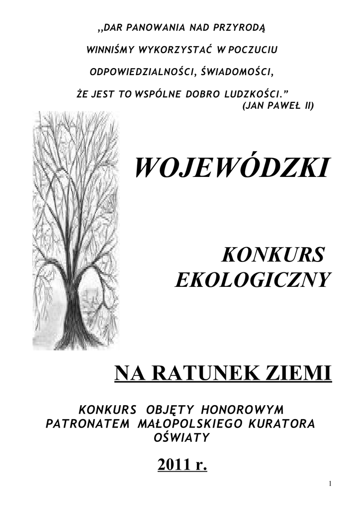 ,,DAR PANOWANIA NAD PRZYRODĄ WINNIŚMY WYKORZYSTAĆ W POCZUCIU ODPOWIEDZIALNOŚCI, ŚWIADOMOŚCI, ŻE JEST TO WSPÓLNE DOBRO LUDZKOŚCI.” (JAN PAWEŁ II) WOJEWÓDZKI KONKURS EKOLOGICZNY NA RATUNEK ZIEMI KONKURS OBJĘTY HONOROWYM PATRONATEM MAŁOPOLSKIEGO KURATORA OŚWIATY 2011 r. 1 CELE: 1. Dostrzeganie realnego zagrożenia życia na Ziemi. 2. Uświadomienie udziału człowieka w zaśmiecaniu naszej Planety. 3. Uwrażliwienie na piękno otaczającego świata. 4. Zrozumienie konieczności ochrony środowiska. 5. Wytworzenie trwałego nawyku segregacji śmieci. ORGANIZATORZY: Starostwo Powiatowe w Wieliczce Urząd Gminy w Gdowie Urząd Gminy w Biskupicach Publiczna Szkoła Podstawowa w Trąbkach Stowarzyszenie na Rzecz EKO-Rozwoju Wsi Trąbki Gimnazjum w Niegowici FORMY KONKURSU: Turniej wiedzy ekologicznej Prace plastyczne (rysunek, plakat) Prace fotograficzne (album) Prace pisemne (wiersz, opowiadanie, artykuł, referat list.) UCZESTNICTWO: W konkursie biorą udział: Uczniowie Szkół Podstawowych Uczniowie Gimnazjum Fundacje Osób Niepełnosprawnych i Ośrodki Wsparcia Dziennego ZGŁOSZENIE UDZIAŁU W KONKURSIE należy kierować do dnia 25 lutego 2011 r. Szkoły Podstawowe: tel. 12/250 – 50 – 55 Szkoła Podstawowa w Trąbkach lub 692 201 391 Dominika Nowak; e-mail: [email protected] Gimnazja: tel. 12/251 – 95 – 15 Gimnazjum w Niegowici lub 12/251 – 40 – 54 Janina Świeży; e-mail: [email protected] TURNIEJ WIEDZY EKOLOGICZNEJ odbędzie się 02 marca 2011 r. (środa) o godz. 11.30 Dla uczniów ze Szkół Podstawowych w Szkole Podstawowej w Trąbkach Dla uczniów z Gimnazjum w Gimnazjum w Niegowici Organizatorzy Konkursu uprzejmie proszą chętnych do przesyłania propozycji pytań z Turnieju Wiedzy Ekologicznej z każdej kategorii wiekowej na podane wyżej adresy e-mail . PRACE PLASTYCZNE, FOTOGRAFICZNE, LITERACKIE proszę składać do dnia 04 marca 2011r. Szkoły Podstawowe do Szkoły Podstawowej w Trąbkach Szkoły Gimnazjalne składają prace w Gimnazjum w Niegowici FINAŁ, czyli wybór najlepszych prac, odbędzie się 09 marca 2011r (środa) o godz. 13.00 w Urzędzie Gminy w Biskupicach – siedziba Tomaszkowice 455 Koordynatorami konkursu są : Dyrektor Szkoły Podstawowej w Trąbkach – mgr Grażyna Pogorzelczyk - Kluska Dyrektor Gimnazjum w Niegowici – mgr inż. Leszek Rajtarski GALA KONKURSU-wręczenie nagród i wystawa pokonkursowa odbędzie się 23 marca 2011 r (środa) w Gimnazjum w Niegowici NA UCZESTNIKÓW KONKURSU CZEKAJĄ ATRAKCYJNE NAGRODY !!! 2 Tematem konkursów: plastycznego, literackiego i fotograficznego jest EKOLOGIA w ogólnym tego słowa znaczeniu. Każda szkoła może maksymalnie oddać do konkursu: Szkoła Podstawowa: tylko 1 pracę –jednego ucznia w poszczególnych kategoriach Gimnazjum: 2 prace konkursowe w poszczególnych kategoriach WSZYSTKIE PRACE KONKURSOWE: plastyczne, literackie i fotograficzne, z opisem, zawierającym imię i nazwisko ucznia, klasę, dokładny adres placówki, telefon kontaktowy należy złożyć do 04 marca 2011 roku Szkoły Podstawowe do Szkoły Podstawowej w Trąbkach. Szkoły Gimnazjalne składają prace w Gimnazjum w Niegowici. Autorem 1 pracy konkursowej. może być tylko jeden uczeń. Uprzejmie prosimy o przestrzeganie regulaminu. FINAŁ, czyli wybór najlepszych prac, odbędzie się 09 marca 2011 r. o godz. 13.00 KOMISJA KONKURSOWA składa się z nauczycieli - opiekunów ze wszystkich szkół, biorących udział w konkursie, których zapraszamy w dniu finału o godz. 13.00 do Urzędu Gminy w Biskupicach z siedzibą Tomaszkowice 455 Prace po zakończeniu konkursu tj. 23 marca 2011r należy odebrać u organizatora w terminie 14 dni od zakończenia. Kategorie konkursu plastycznego: Szkoły Podstawowe I kategoria: kl.0-I II kategoria: kl. II-III III kategoria: kl. IV-VI Gimnazja IV kategoria: kl. I-III Fundacje Osób Niepełnosprawnych i Ośrodki Wsparcia Dziennego V kategoria: TECHNIKA PRAC – dowolna FORMAT – dowolny Kategorie konkursu fotograficznego: Szkoły Podstawowe I kategoria: kl. 0-VI Gimnazja II kategoria: kl. I-III FORMAT – dowolny Kategorie konkursu literackiego: Szkoły Podstawowe I kategoria: 0-III II kategoria: kl. IV-VI Gimnazja III kategoria: kl. I-III FORMA – do wyboru: list, esej, rozprawka, opowiadanie, wiersz, artykuł, itp. 3 SZKOŁA PODSTAWOWA KATEGORIA: kl. 0-III KATEGORIA: kl. IV - VI Każdą Szkołę Podstawową może reprezentować tylko jeden uczeń kategorii. (czyli jeden uczeń z klas 0 – III). Turniej przeprowadzony jest w formie testu wyboru. Czas rozwiązania 45 minut. Każdą Szkołę Podstawową może reprezentować tylko jeden uczeń. Szkoły reprezentowane przez uczniów klas (0-I) wezmą udział w turnieju wiedzy - w formie ustnej. Natomiast uczniów klas II-III będzie obowiązywał pisemny test wyboru Tematyka konkursu: Formy ochrony przyrody w Polsce. Czas rozwiązania: 45 minut. OGÓLNE ZAGADNIENIA Planeta Ziemia: − ekologia, czyli wzajemne zależności organizmów i ich środowisk; − współczesne zagrożenia dla świata przyrody; − mój organizm, jego potrzeby i rozwój. Świat roślin: − zasadnicze części roślin i ich funkcje; − znaczenie roślin dla ludzi, zwierząt, środowiska; − zasady ochrony przyrody (rośliny chronione); − zawody związane z hodowlą, uprawą, pielęgnacją roślin. Świat zwierząt: − rozpoznawanie i nazywanie spotykanych w najbliższej okolicy ssaków dziko żyjących i hodowanych przez człowieka; − zwierzęta chronione, wymarłe; − nazwy zawodów związanych ze światem zwierząt i ich hodowlą. Literatura: 1. Realizowany program nauczania edukacji wczesnoszkolnej i kształcenia zintegrowanego w Szkole Podstawowej. 2. Dziecięce czasopisma o tematyce ekologicznej OGÓLNE ZAGADNIENIA 1 Parki narodowe w szczególności: • Babiogórski Park Narodowy • Bieszczadzki Park Narodowy • Gorczański Park Narodowy • Karkonoski Park Narodowy • Magurski Park Narodowy • Park Narodowy Gór Stołowych • Pieniń