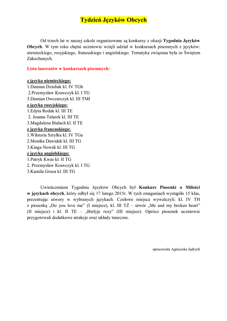 Tydzień Języków Obcych Od trzech lat w naszej szkole organizowane są konkursy z okazji Tygodnia Języków Obcych. W tym roku chętni uczniowie wzięli udział w konkursach pisemnych z języków: niemieckiego, rosyjskiego, francuskiego i angielskiego. Tematyka związana była ze Świętem Zakochanych. Lista laureatów w konkursach pisemnych: z języka niemieckiego: 1.Damian Dziubak kl. IV TGb 2.Przemysław Krawczyk kl. I TG 3.Damian Owczarczyk kl. III TMI z języka rosyjskiego: 1.Edyta Rodak kl. III TE 2. Joanna Talarek kl. III TE 3.Magdalena Białach kl. II TE z języka francuskiego: 1.Wiktoria Sztylka kl. IV TGa 2.Monika Dawidek kl. III TG 3.Kinga Nowek kl. III TG z języka angielskiego: 1.Patryk Kwas kl. II TG 2. Przemysław Krawczyk kl. I TG 3.Kamila Gruza kl. III TG Uwieńczeniem Tygodnia Języków Obcych był Konkurs Piosenki o Miłości w językach obcych, który odbył się 17 lutego 2015r. W tych zmaganiach wystąpiło 15 klas, prezentując utwory w wybranych językach. Czołowe miejsca wywalczyli: kl. IV TH z piosenką „Do you love me” (I miejsce), kl. III TŻ – utwór „Me and my broken heart” (II miejsce) i kl. II TE – „Biełyje rozy” (III miejsce). Oprócz piosenek uczniowie przygotowali dodatkowe atrakcje oraz układy taneczne. opracowała Agnieszka Jędrych