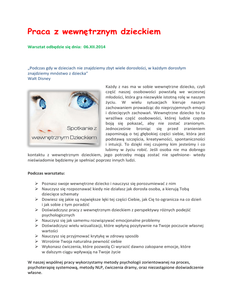 Praca z wewnętrznym dzieckiem Warsztat odbędzie się dnia: 06.XII.2014 „Podczas gdy w dzieciach nie znajdziemy zbyt wiele dorosłości, w każdym dorosłym znajdziemy mnóstwo z dziecka” Walt Disney Każdy z nas ma w sobie wewnętrzne dziecko, czyli częśd naszej osobowości powstałą we wczesnej młodości, która gra niezwykle istotną rolę w naszym życiu. W wielu sytuacjach kieruje naszym zachowaniem prowadząc do nieprzyjemnych emocji i dziecięcych zachowao. Wewnętrzne dziecko to ta wrażliwa częśd osobowości, której ludzie często boją się pokazad, aby nie zostad zranionym. Jednocześnie broniąc się przed zranieniem zapominają o tej głębokiej części siebie, która jest podstawą szczęścia, kreatywności, spontaniczności i intuicji. To dzięki niej czujemy kim jesteśmy i co lubimy w życiu robid. Jeśli osoba nie ma dobrego kontaktu z wewnętrznym dzieckiem, jego potrzeby mogą zostad nie spełnione- wtedy nieświadomie będziemy je spełniad poprzez innych ludzi. Podczas warsztatu: Poznasz swoje wewnętrzne dziecko i nauczysz się porozumiewad z nim Nauczysz się rozpoznawad kiedy nie działasz jak dorosła osoba, a kierują Tobą dziecięce schematy Dowiesz się jakie są największe lęki tej części Ciebie, jak Cię to ogranicza na co dzieo i jak sobie z tym poradzid Doświadczysz pracy z wewnętrznym dzieckiem z perspektywy różnych podejśd psychologicznych Nauczysz się jak samemu rozwiązywad emocjonalne problemy Doświadczysz wielu wizualizacji, które wpłyną pozytywnie na Twoje poczucie własnej wartości Nauczysz się przyjmowad krytykę w zdrowy sposób Wzrośnie Twoja naturalna pewnośd siebie Wykonasz dwiczenia, które pozwolą Ci wyrazid dawno zakopane emocje, które w dalszym ciągu wpływają na Twoje życie W naszej wspólnej pracy wykorzystamy metody psychologii zorientowanej na proces, psychoterapię systemową, metody NLP, dwiczenia dramy, oraz niezastąpione doświadczenie własne.