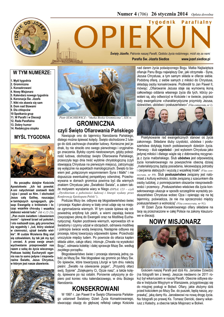 Numer 4 (706) 26 stycznia 2014 nad darem życia poświęconego Bogu. Matka Najświętsza ofiaruje Panu Bogu największy Dar, jaki otrzymała - Syna, Jezusa Chrystusa, a tym samym składa w ofierze siebie. Podobną ofiarę, z siebie samych z miłości do Chrystusa, składają osoby konsekrowane. Podkreślił to Jan Paweł II, mówiąc: „Ofiarowanie Jezusa staje się wymowną ikoną całkowitego oddania własnego życia dla tych, którzy powołani są, aby odtworzyć w Kościele i w świecie, poprzez rady ewangeliczne «charakterystyczne przymioty Jezusa, dziewictwo, ubóstwo i posłuszeństwo»” (Vita consecrata, nr 1). W TYM NUMERZE: 1. Myśl tygodnia 2. Gromniczna 3. Konsekrowani 4. Nowy Misjonarz 5. Kalendarz nowego tygodnia 6. Koronacja Św. Józefa 7. Nikt nie zbawia się sam 8. Dom nad Stawami 9. Dla chłopców 10 Spotkania grup 11. W Parafii i w Diecezji 12. Rada Parafialna 13. Dobry humor 14. Redakcyjna stopka Piotr STACHIEWICZ - "Matka Boska Gromniczna”, XIX w. GROMNICZNA czyli Święto Ofiarowania Pańskiego Nawiązuje ono do tajemnicy Narodzenia Pańskiego, dlatego można śpiewać kolędy. Święto obchodzone 2 lutego do dziś zachowuje charakter ludowy. Konieczne jest jednak, by nie straciło ono swego pierwotnego i oryginalnego znaczenia. Byłoby czymś niestosownym, gdyby pobożność ludowa, obchodząc święto Ofiarowania Pańskiego, przeoczyła tego dnia treść wybitnie chrystologiczną (czyli stawiającą Chrystusa na pierwszym miejscu), zatrzymując się wyłącznie na aspektach mariologicznych. Święto to bowiem jest „połączonym wspomnieniem Syna i Matki” i nie dopuszcza ewentualnej perspektywy odwrotnej. Przechowywana w domach gromnica powinna być dla wiernych Na początku dziejów Kościoła znakiem Chrystusa jako „Światłości Świata”, a zatem takApostołowie: „Ich też powołał. A oni natychmiast zostawili łódź że motywem wyrażania wiary w Niego (DPLiL 123 – czyli MYŚL TYGODNIA i ojca i poszli za Nim. I obchodził Jezus całą Galileę, nauczając w tamtejszych synagogach, głosząc Ewangelię o królestwie i lecząc wszelkie choroby i wszelkie słabości wśród ludu” (Mt 4,12-23). „Pan moim światłem i zbawieniem moim” - śpiewał Izrael od pokoleń. I oto nadszedł czas, gdy proroctwa się wypełniły i „lud, który siedział w ciemności, ujrzał światło wielkie”. W cudzie Wcielenia Bóg stał się człowiekiem, by tak jak my żyć i umrzeć. A przez swoje zmartwychwstanie przeprowadził nas razem z sobą do życia wiecznego. Podczas każdej Eucharystii ogarnia nas to samo jedyne i niepowtarzalne Światło, Jezus Chrystus, w którym jest nasze zbawienie. Opłata dowolna „Dyrektorium o pobożności ludowej i liturgii wydany przez Konferencję Episkopatu Polski”). Praktykowanie rad ewangelicznych stanowi oś życia zakonnego. Składane śluby czystości, ubóstwa i posłuszeństwa dotykają trzech podstawowych dziedzin życia. Pierwszy - ślub czystości - jest wyborem Chrystusa jako jedynej miłości i dlatego wiąże się z dobrowolną rezygnacją z życia małżeńskiego. Ślub ubóstwa jest odpowiedzią życia konsekrowanego na powszechnie obecną dzisiaj „materialistyczną żądzę posiadania, lekceważącą potrzeby i cierpienia słabszych i wyzutą z wszelkiej troski” (Vita consecrata, nr 89). Ślub posłuszeństwa związany jest natomiast z kulturą wolności, ściśle związaną z szacunkiem dla osoby ludzkiej, z pomniejszaniem obszarów niesprawiedliwości i przemocy. „Posłuszeństwo właściwe dla życia konsekrowanego ukazuje w sposób szczególnie wyrazisty posłuszeństwo Chrystusa wobec Ojca i opierając się na tej tajemnicy, poświadcza, że nie ma sprzeczności między posłuszeństwem a wolnością” (Vita consecrata, nr 91). W Dzień Życia Konsekrowanego ofiary składane na tacę są przeznaczone w całej Polsce na zakony klauzurowe w diecezji. Podczas Mszy św. odbywa się błogosławieństwo świec i procesja: Kapłan ubrany w biały ornat udaje się na miejsce zgromadzenia wiernych. W tym czasie śpiewa się odpowiednią antyfonę lub pieśń, a wierni zapalają świece (zwyczajowo płoną do Ewangelii oraz na Modlitwę Eucharystyczną). Kapłan pozdrawia wiernych, wprowadza ich w świadomy i czynny udział w obrzędach, odmawia modlitwę i pokrapia świece wodą święconą. Następnie odbywa się procesja, której towarzyszy odpowiedni śpiew. Przechodzi uroczyście między ludem. Po powrocie do ołtarza kapłan składa ukłon, całuje ołtarz, intonuje „Chwała na wysokości Bogu”, odmawia kolektę i dalej sprawuje Mszę Św. według zwykłego porządku. Błogosławieństwo świec i procesja stanowią jedną całość ze Mszą Św. Nie błogosławi się gromnic po Mszy Św. Do śpiewów, które towarzyszą Liturgii w tym dniu należą pieśni: „Światło na oświecenie pogan”, „Przystrój ołtarz Gościem naszej Parafii jest dziś Ks. Jarosław Dziedzic swój, Syjonie” „Dziękujemy Ci, Ojcze nasz”, a także kolędy, śpiewane po raz ostatni. Ponownie usłyszymy je do- (na fotografii ten z lewej). Jeszcze niedawno (w 2011 ropiero pod koniec roku kalendarzowego, w dniu Bożego ku) był wikariuszem w naszej Parafii. Obecnie odbywa studia w Instytucie Misyjnym w Warszawie, przygotowując się Narodzenia. do misyjnej posługi w Boliwii. Ofiary, jakie złożymy dziś przed kościołem po Mszy Św. do puszek, będą naszą „wyW 1997 r. Jan Paweł II w Święto Ofiarowania Pańskie- prawką”, jaką damy Ks. Jarosławowi na nową drogę życia. go ustanowił Światowy Dzień Życia Konsekrowanego, Na fotografii po prawej Ks. Tomasz Denicki, dawny wikarstwarzając okazję do głębszej refleksji całego Kościoła iusz z Katedry, a obecnie także Misjonarz w Boliwii. NOWY MISJONARZ KONSEKROWANI STRONA 2 OPIEKUN Nr 4 26 stycznia 2014 r. KALENDARZ PARAFIALNY W przypadku zauważenia błędów, które mogły powstać podczas przepisywania intencji Mszy św., serdecznie pros
