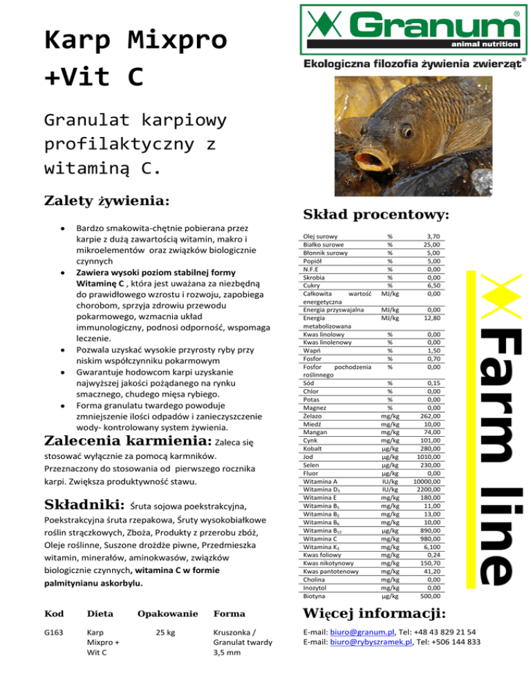 Karp Mixpro +Vit C Granulat karpiowy profilaktyczny z witaminą C. Zalety żywienia: Skład procentowy: Bardzo smakowita-chętnie pobierana przez karpie z dużą zawartością witamin, makro i mikroelementów oraz związków biologicznie czynnych Zawiera wysoki poziom stabilnej formy Witaminę C , która jest uważana za niezbędną do prawidłowego wzrostu i rozwoju, zapobiega chorobom, sprzyja zdrowiu przewodu pokarmowego, wzmacnia układ immunologiczny, podnosi odpornośd, wspomaga leczenie. Pozwala uzyskad wysokie przyrosty ryby przy niskim współczynniku pokarmowym Gwarantuje hodowcom karpi uzyskanie najwyższej jakości pożądanego na rynku smacznego, chudego mięsa rybiego. Forma granulatu twardego powoduje zmniejszenie ilości odpadów i zanieczyszczenie wody- kontrolowany system żywienia. Zalecenia karmienia: Zaleca się stosowad wyłącznie za pomocą karmników. Przeznaczony do stosowania od pierwszego rocznika karpi. Zwiększa produktywnośd stawu. Składniki: Śruta sojowa poekstrakcyjna, Poekstrakcyjna śruta rzepakowa, Śruty wysokobiałkowe roślin strączkowych, Zboża, Produkty z przerobu zbóż, Oleje roślinne, Suszone drożdże piwne, Przedmieszka witamin, minerałów, aminokwasów, związków biologicznie czynnych, witamina C w formie palmitynianu askorbylu. Kod Dieta G163 Karp Mixpro + Wit C Opakowanie 25 kg Olej surowy Białko surowe Błonnik surowy Popiół N.F.E Skrobia Cukry Całkowita wartośd energetyczna Energia przyswajalna Energia metabolizowana Kwas linolowy Kwas linolenowy Wapo Fosfor Fosfor pochodzenia roślinnego Sód Chlor Potas Magnez Żelazo Miedź Mangan Cynk Kobalt Jod Selen Fluor Witamina A Witamina D3 Witamina E Witamina B1 Witamina B2 Witamina B6 Witamina B12 Witamina C Witamina K3 Kwas foliowy Kwas nikotynowy Kwas pantotenowy Cholina Inozytol Biotyna % % % % % % % MJ/kg 3,70 25,00 5,00 5,00 0,00 0,00 6,50 0,00 MJ/kg MJ/kg 0,00 12,80 % % % % % 0,00 0,00 1,50 0,70 0,00 % % % % mg/kg mg/kg mg/kg mg/kg µg/kg µg/kg µg/kg µg/kg IU/kg IU/kg mg/kg mg/kg mg/kg mg/kg µg/kg mg/kg mg/kg mg/kg mg/kg mg/kg mg/kg mg/kg µg/kg 0,15 0,00 0,00 0,00 262,00 10,00 74,00 101,00 280,00 1010,00 230,00 0,00 10000,00 2200,00 180,00 11,00 13,00 10,00 890,00 980,00 6,100 0,24 150,70 41,20 0,00 0,00 500,00 Forma Więcej informacji: Kruszonka / Granulat twardy 3,5 mm E-mail: [email protected], Tel: +48 43 829 21 54 E-mail: [email protected], Tel: +506 144 833