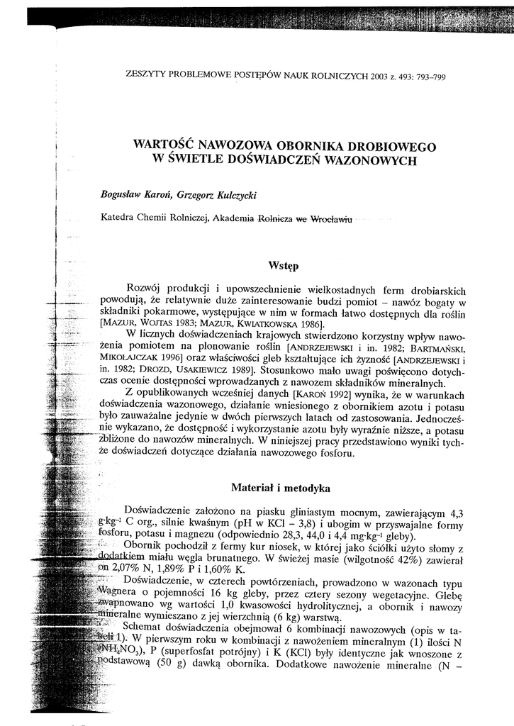 KAROŃ B., KULCZYKI G. 2003. Wartość nawozowa obornika