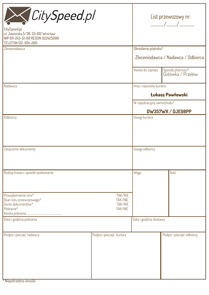 List przewozowy nr: …………../………../……………. CitySpeed.pl ul. Jaworska 5/38, 53-612 Wrocław NIP 611-243-51-08 REGON 022425099 TELEFON 512-924-260 Zleceniodawca Określenie płatnika* Zleceniodawca / Nadawca / Odbiorca Kwota do zapłaty Nadawca Sposób płatności* Gotówka / Przelew Imię i nazwisko kuriera Łukasz Pawłowski Nr rejestracyjny samochodu* DW357WX / DJE08PP Odbiorca Uwagi kuriera Załączone dokumenty Uwagi odbiorcy Rodzaj towaru, sposób opakowanie Waga Powiadomienie sms* Skan listu przewozowego* Zwrot dokumentów* Pobranie* Kwota pobrania……………………………………………… TAK/NIE TAK/NIE TAK/NIE TAK/NIE Data i godzina pobrania Podpis i pieczęć nadawcy * Niepotrzebne skreślić Ilość Data i godzina dostawy Podpis i pieczęć kuriera Podpis i pieczęć odbiorcy