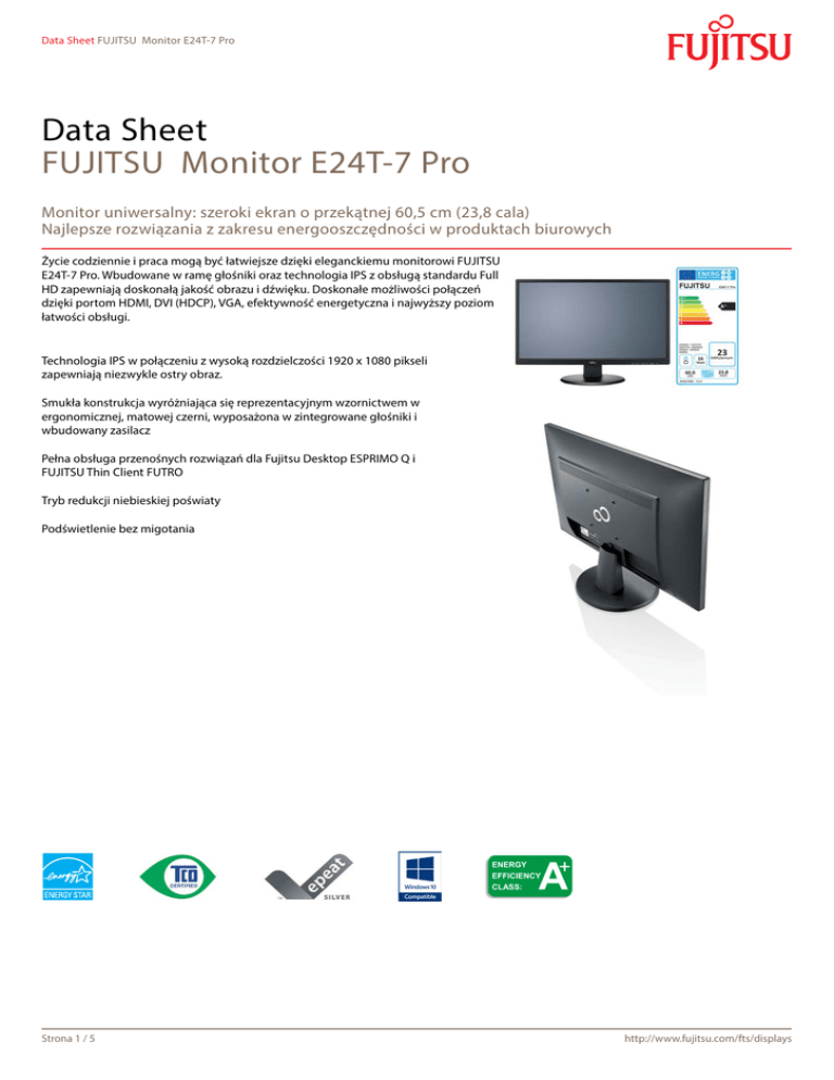 Data Sheet FUJITSU Monitor E24T-7 Pro Data Sheet FUJITSU Monitor E24T-7 Pro Monitor uniwersalny: szeroki ekran o przekątnej 60,5 cm (23,8 cala) Najlepsze rozwiązania z zakresu energooszczędności w produktach biurowych Życie codziennie i praca mogą być łatwiejsze dzięki eleganckiemu monitorowi FUJITSU E24T-7 Pro. Wbudowane w ramę głośniki oraz technologia IPS z obsługą standardu Full HD zapewniają doskonałą jakość obrazu i dźwięku. Doskonałe możliwości połączeń dzięki portom HDMI, DVI (HDCP), VGA, efektywność energetyczna i najwyższy poziom łatwości obsługi. Technologia IPS w połączeniu z wysoką rozdzielczości 1920 x 1080 pikseli zapewniają niezwykle ostry obraz. Smukła konstrukcja wyróżniająca się reprezentacyjnym wzornictwem w ergonomicznej, matowej czerni, wyposażona w zintegrowane głośniki i wbudowany zasilacz Pełna obsługa przenośnych rozwiązań dla Fujitsu Desktop ESPRIMO Q i FUJITSU Thin Client FUTRO Tryb redukcji niebieskiej poświaty Podświetlenie bez migotania Strona 1 / 5 http://www.fujitsu.com/fts/displays Data Sheet FUJITSU Monitor E24T-7 Pro Szczegóły techniczne Cechy specjalne Technologia przełącznika na pokładzie samolotu (IPS), Podświetlany panel LED, Opcja zachowania proporcji, złącze słuchawek, Przycisk sterowania Eco Ergonomiczny stojak Podstawa Wysokość obrazu nad biurkiem (min.) Kąt przechylenia Wydajność obrazu Wyświetlacz i podświetlenie Konserwacja powierzchni ekranu Kontrast - typowy Kontrast - zaawansowany Typowy czas reakcji szary do szarego Kąt widzenia (poz./pion.) - typowy Wierność kolorów Jasność - typowa Wielkości i rozdzielczość Proporcje Przekątna Rozdzielczość (natywna) Rozdzielczość (interpolacja) Obsługa ekranu HD Wielkość obrazu Rozstaw pikseli Częstotliwości Poziomo Poziomy analogowy Poziomy cyfrowy Pionowo Łączność HDMI DVI VGA/D-SUB Wyjście sygnału audio Wejście sygnału audio Wyjście audio HDMI audio Menu łatwość obsługi Języki wymienny 96 mm -3.5° / +21.5° In-Plane Switching (IPS) technology/LED Przeciwodblaskowa, Twarda powłoka 3H 1000:1 20,000,000:1 5 ms (in video mode) 178°/178° 16,7 miliona kolorów (Hi-FRC) 250 cd/m2 16:9 60,5 cm (23,8 cala) 1920 x 1080 pikseli 1680 x 1050 pikseli, 1440 x 900 pikseli, 1360 x 768 pikseli, 1280 x 1024 pikseli, 1280 x 768 pikseli, 1152 x 870 pikseli, 1024 x 768 pikseli, 832 x 624 piksele, 800 x 600 pikseli, 720 x 400 pikseli, 640 x 480 pikseli 1080i/p, 720i/p, 576i/p, 480i/p 527 x 296,4 mm 0.2745 mm 30 - 83 kHz 180 Mhz 165 Mhz 55 - 76 Hz 1 x HDMI 1 x DVI-D (HDCP) 1 x D-SUB Stereofoniczne gniazdo jack 3,5 mm Stereofoniczne gniazdo jack 3,5 mm 2 x 2.0 W Tak Jasność / kontrast Tryb Kolor Regulacja obrazu Audio Informacje Instalacja Arabski, Chiński uproszczony, Czeski, Duński, Holenderski, Angielski, Fiński, Francuski, Niemiecki, Hebrajski, Włoski, Japoński, Norweski, Polski, Portugalski, Rosyjski, Hiszpański, Szwedzki, Turecki Jasność, Kontrast Standardowo, Gra, Wideo, Obraz, Tekst 5000K, 6500K, 7500K, Natywny, Kolor niestandardowy (R,G,B) Pozycja w poziomie, Pozycja w pionie, Zegar, Faza, Ostrość Wyciszenie, Głośność Nazwa modelu, Numer seryjny, Rozdzielczość/tryb, Wejście sygnału, Status ACR Wybór trybu wprowadzania, Język, Czas wyświetlania OSD, Wstępne ustawienie fabryczne Zużycie energii (typowe, bez dźwięku) Programowy wyłącznik Tryb oszczędzania energii 0.2 W 0.2 W Strona 2 / 5 http://www.fujitsu.com/fts/displays Data Sheet FUJITSU Monitor E24T-7 Pro Działanie z ustawieniami EPA Zasilacz Uwagi dotyczące zasilania Wartości elektryczne Zakres napięcia znamionowego Zakres częstotliwości znamionowej Klasa ochrony Dział zgodności z przepisami Produkt Europa Model Niemcy Rosja Stany Zjednoczone/Kanada Arabia Saudyjska Globalne Łącze do zgodności Jakość i niezawodność MTBF (demonstrowany) Wymiary / waga / informacje środowiskowe Wymiary bez podstawy (szer. x gł. x wys.) Wymiary z podstawą (szer. x gł. x wys.) Waga (zapakowane) Waga (nierozpakowane) Waga (tylko monitor) Temperatura otoczenia podczas pracy Różne Różne Kolor Zawartość paczki Akcesoria dostarczone z wyświetlaczem 15.6 W zintegrowana Głośniki wył. 100 V - 240 V 50 Hz - 60 Hz 1 E24T-7 Pro Klasa wydajności energetycznej: A+, Certyfikacja CE według dyrektywy EC 2004/108/EEC, EN 60950, RoHS, WEEE, Deklaracja ekologiczna IT W2414 TÜV GS EAC FCC, klasa B, cUL, CSA SASO ENERGY STAR® 7.0, Certyfikowane wyświetlacze TCO 6.0, EPEAT® Silver (wyznaczone regiony), ISO9241307 (Wadliwe piksele, klasa II) http://globalsp.ts.fujitsu.com/sites/certificates 50.000 h 552,4 x 56,5 x 334,2 mm 21,75 x 2.22 x 13,16 ‘’ 552.4 x 202.94 x 405.3 mm 21.75 inch x 7.99 x 15.96 ‘’ 4.84 kg 10.67 lbs 3.84 kg 8.47 lbs 3.47 kg 7,65 lbs 5 - 40 °C VESA DDC/ CI, Płaski interfejs montażowy monitora VESA MIS-D 100 C, Gotowość do współpracy z zabezpieczeniem Kensington Czarny Uwagi dotyczące akcesoriów dostarczonych z wyświetlaczem Przewód danych DVI-D 1,8 m Przewód audio 1,8 m Kabel zasilający do gniazdka sieciowego (typ Euro-Schuko CEE7) 1,8 m Ulotka skróconego wprowadzenia Podręcznik wprowadzający Książeczka gwarancyjna Przewody danych i przewód audio z możliwością odłączenia przy ekranie Uwaga: dopuszczalna różnica długości kabla +/- 5 cm. Dane zamówienia Order code Kod EAN S26361-K1573-V160 4054681905099 Strona 3 / 5 http://www.fujitsu.com/fts/displays Data Sheet FUJITSU Monitor E24T-7 Pro Dane zamówienia Indywidualny kod zamówienia dla kraju Informacje o akcesoriach Gwarancja Okres gwarancji Typ gwarancji Warunki gwarancji Dostępność części zapasowych Łącze internetowe do serwisu Strona 4 / 5 BDL:K1573V160-UK – z przewodem zasilania w wersji angielskiej, obowiązkowe dla krajów arabskich Pomocne opcje: Dostępne filtry prywatności: http://globalsp. ts.fujitsu.com/dmsp/Publications/public/ds-PrivacyFilter.pdf Dostępne adaptery: http://globalsp.ts.fujitsu.com/ dmsp/Public