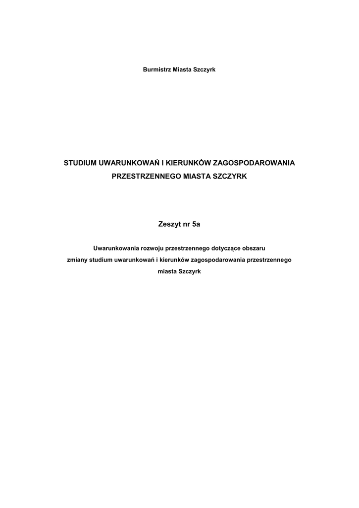Burmistrz Miasta Szczyrk STUDIUM UWARUNKOWAŃ I KIERUNKÓW ZAGOSPODAROWANIA PRZESTRZENNEGO MIASTA SZCZYRK Zeszyt nr 5a Uwarunkowania rozwoju przestrzennego dotyczące obszaru zmiany studium uwarunkowań i kierunków zagospodarowania przestrzennego miasta Szczyrk 1. Dotychczasowe zagospodarowanie terenu. Obszar zmiany studium obejmuje tereny położone w południowo – wschodniej części miasta Szczyrk, w rejonie Pośredniego, Soliska, Czyrnej, Hali Skrzyczeńskiej, Małego Skrzycznego oraz części zachodniej stoku Skrzycznego. Obszar w większości stanowi tereny niezabudowane, leśne oraz rolne. Zabudowa jest zlokalizowana głównie w dolnych partiach, tj. w dolinie, wzdłuż pasa drogi wojewódzkiej (rejon Czyrnej, tzw. parkingów u Kowalskiego, rejon stacji narciarskiej na Solisku) oraz na Pośrednim. Ponadto w obszarze zmiany znajdują się tereny i obiekty Szczyrkowskiego Ośrodka Narciarskiego, tj. stacje narciarskie na Pośrednim, Solisku, w Czyrnej oraz Suche i Hala Skrzyczeńska wraz z wyciągami orczykowymi i trasami narciarskimi. Obszar obejmuje również przysiółek Zwalisko oraz rozproszoną zabudowę zagrodową zlokalizowaną na terenach rolniczych i śródleśnych polanach. Dominującą formą zainwestowania są obiekty i urządzenia Szczyrkowskiego Ośrodka Narciarskiego, tj. stacje narciarskie, trasy i wyciągi orczykowe oraz usługi i infrastruktura towarzysząca. Ośrodek wyposażony jest w przestarzałą, nie spełniającą obecnych norm infrastrukturę, między innymi w stare wyciągi. Przy ośrodku funkcjonują budynki w bardzo złym stanie technicznym, nie spełniające dzisiejszych standardów lub stanowiące pustostany, np. tzw. „Akwarium” na Hali Skrzyczeńskiej. Zabudowa i urządzenia narciarskie wzniesiono w latach 70 –tych i 80 – tych. Od momentu powstania nie były gruntownie remontowane. Tak działająca infrastruktura może stanowić zagrożenie dla bezpieczeństwa ludzi oraz dla środowiska, z uwagi na przestarzałe technologie. Obsługa komunikacyjna obszaru odbywa się z drogi wojewódzkiej nr 942 poprzez drogi lokalne i dojazdowe, w tym, między innymi drogę na Malinów i na Zwalisko. W obszarze opracowania znajdują się ujęcia wody, między innymi na Malinowie. Stan własności gruntów obejmuje w zdecydowanej większości grunty prywatne. Grunty państwowe to głównie lasy państwowe. Ponadto istnieją pojedyncze działki należące do gminy. Część dróg, w tym drogi publiczne, należą do gminy. 2. Cel opracowania i wnioski złożone do zmiany studium. Celem opracowania zmiany studium jest konieczność modernizacji oraz planów rozbudowy Szczyrkowskiego Ośrodka Narciarskiego, mających na celu przywrócenie tradycji narciarskich w Szczyrku. Planuje się stworzenie nowoczesnego i atrakcyjnego ośrodka na europejskim poziomie. W związku z niniejszymi planami właściciel ośrodka złożył wniosek o wykonanie ww planu miejscowego, co musi zostać poprzedzone zmianą studium. Po podjęciu uchwały o przystąpieniu do zmiany studium uwarunkowań i kierunków zagospodarowania przestrzennego miasta Szczyrk zostały zawiadomione instytucje i organy właściwe do uzgadniania i opiniowania projektu studium. Swoje wnioski i wytyczne przesłały następujące instytucje: Zarząd Województwa Śląskiego, Starostwo Powiatowe w Bielsku Białej, Wojewódzki Urząd Ochrony Zabytków, Zarząd Dróg Wojewódzkich, Burmistrz Miasta Wisła, Operator Gazociągów Przesyłowych Gaz System, AQUA SA. Zostały również złożone wnioski przez właścicieli działek w obszarze opracowania, często adresowane jako wnioski o zmianę ustaleń planu miejscowego wymagające jednak uprzedniej zmiany studium. Wnioski te głównie dotyczyły zmiany ich przeznaczenia z terenów rolnych lub leśnych na tereny zabudowy mieszkaniowej, agroturystycznej i usług związanych z obsługą turystyki. Wnioski dotyczyły głównie działek położonych na zboczach gór, w znacznym oddaleniu od istniejącego układu osadniczego oraz bez dostępu do infrastruktury lub nawet bez prawnego dojazdu. Uruchomienie niektórych terenów może kolidować z głównym celem zmiany studium, tj. z modernizacją Szczyrkowskiego Ośrodka Narciarskiego (np.: dojazdy krzyżują się z trasami narciarskimi). Może również powodować rozpraszanie zabudowy. Wszystkie wnioski zostały przeanalizowane i będą zgodnie z procedurą rozpatrywane w trakcie opracowania zmiany studium. 3. Środowisko przyrodnicze oraz obszary chronione. W obszarze zmiany studium szata roślinna oraz fauna są stosunkowo ubogie. W obszarze tym występującymi zbiorowiskami roślinnymi są: łąki, lasy i zadrzewienia. Lasy Nadleśnictwa Bielsko mają w przewadze funkcję ochronną. Funkcja gospodarcza stanowi ułamek procenta. Obszar zdominowany jest przez sztuczne nasadzenia lasów świerkowych, w wyższych położeniach kosodrzewiny. W niższych położeniach występują lasy świerkowe zazwyczaj w dobrej kondycji zdrowotnej. Zbiorowiska z domieszką buka, sporadycznie jarząb pospolity. Na mniejszych powierzchniach przylegających do polan lub przecinek (drogi polne, wyciągi itp.) zwiększa się udział procentowy buka. Lasy i zadrzewienia zawierają między innymi następujące, przeważające gatunki drzew i krzewów: klon jawor, buk zwyczajny, świerk pospolity, jodła pospolita, brzoza zwisła, leszczyna pospolita, kosodrzewina. Dominującym gatunkiem lasotwórczym jest świerk. Subdominantem jest buk. W dominujących monokulturach świerkowych i w drzewostanie mieszanym z udziałem buka występuje jedynie kilka gatunków w runie. Warstwa podszytu właściwie nie występuje. Łąki natomiast są utworzone przede wszystkim przez pospolite trawy. Ogólnie analizowany teren charakteryzuje się niską bioróżnorodnością. W obszarze zmiany studium najliczniej występuje sarna, lis oraz zając. Notuje się ślady dzika. Spośród ptaków stwierdzono następujące gatunki: myszołów gat, drozd obroźny, kobuz,