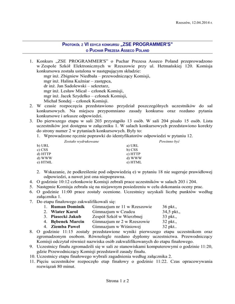 Rzeszów, 12.04.2014 r. PROTOKÓŁ Z VI EDYCJI KONKURSU „ZSE PROGRAMMER'S” O PUCHAR PREZESA ASSECO POLAND 1. Konkurs „ZSE PROGRAMMER'S” o Puchar Prezesa Asseco Poland przeprowadzono w Zespole Szkół Elektronicznych w Rzeszowie przy ul. Hetmańskiej 120. Komisja konkursowa została ustalona w następującym składzie: mgr inż. Zbigniew Niedbała – przewodniczący Komisji, mgr inż. Halina Kuźniar – zastępca, dr inż. Jan Sadolewski – sekretarz, mgr inż. Lesław Micał – członek Komisji, mgr inż. Jacek Szydełko – członek Komisji, Michał Sondej – członek Komisji. 2. W czasie rozpoczęcia przedstawiono przydział poszczególnych uczestników do sal konkursowych. Na miejscu przypomniano zasady konkursu oraz rozdano pytania konkursowe i arkusze odpowiedzi. 3. Do pierwszego etapu w sali 203 przystąpiło 13 osób. W sali 204 pisało 15 osób. Lista uczestników jest dostępna w załączniku 1. W salach konkursowych przedstawiono korekty do strony numer 2 w pytaniach konkursowych. Były to: 1. Wprowadzone ręcznie poprawki do identyfikatorów odpowiedzi w pytaniu 12. Zostało wydrukowane b) URL c) CSS d) HTTP d) WWW e) HTML Powinno być a) URL b) CSS c) HTTP d) WWW e) HTML 2. Wskazanie, że podkreślenie pod odpowiedzią e) w pytaniu 18 nie sugeruje prawidłowej odpowiedzi, a nawet jest ona niepoprawna. 4. O godzinie 10:12 członkowie Komisji zebrali prace uczestników w salach 203 i 204. 5. Następnie Komisja zebrała się na niejawnym posiedzeniu w celu dokonania oceny prac. 6. O godzinie 11:00 prace zostały ocenione. Uczestnicy uzyskali liczbę punktów według załącznika 1. 7. Do etapu finałowego zakwalifikowali się: 1. Ruman Dominik Gimnazjum nr 11 w Rzeszowie 36 pkt., 2. Wiater Karol Gimnazjum w Czudcu 34,5 pkt., 3. Piasecki Jakub Zespół Szkół w Wierzbnej 33 pkt., 4. Bębenek Marcin Gimnazjum nr 2 w Rzeszowie 32 pkt., 4. Ziemba Paweł Gimnazjum w Wiśniowej 32 pkt.. 8. O godzinie 11:15 zostały przedstawione wyniki pierwszego etapu uczestnikom oraz zgromadzonym osobom. Równolegle rozdano dyplomy uczestnictwa. Przewodniczący Komisji odczytał również nazwiska osób zakwalifikowanych do etapu finałowego. 9. Uczestnicy finału zgromadzili się w sali ze stanowiskami komputerowymi o godzinie 11:20, gdzie Przewodniczący Komisji przedstawił zasady finału. 10. Uczestnicy etapu finałowego wybrali zagadnienia według załącznika 2. 11. Pięciu uczestników rozpoczęło etap finałowy o godzinie 11:22. Czas opracowywania rozwiązań 80 minut. Strona 1 z 2 Protokół z VI edycji konkursu „ZSE PROGRAMMER'S” Rzeszów, 12.04.2014 r. 12. O 12:42 uczestnicy zakończyli rozwiązywanie zadań. Komisja udała się na niejawną naradę w trakcie której oceniała prace uczestników. 13. Komisja ustaliła ostateczną ocenę punktową dla opracowanych rozwiązań zadań. 14. Na etapie finałowym uczestnicy otrzymali następującą sumaryczną liczbę punktów, dostępną również w załączniku nr 3: 1. Bębenek Marcin 70,5 pkt., 2. Ziemba Paweł 63 pkt., 3. Wiater Karol 58 pkt., 4. Ruman Dominik 56 pkt., 5. Piasecki Jakub 54 pkt., 15. Laureatem pierwszej nagrody został Marcin Bębenek, który otrzymał laptop ufundowany przez firmę Asseco Poland. Druga nagroda – drukarka laserowa ufundowana przez Quatro Computers, trafiła do Pawła Ziemby. Trzecią nagrodę – klawiaturę i mysz bezprzewodową ufundowaną przez Quatro Computers, zdobył Karol Wiater. Finaliści (4 i 5 miejsce) otrzymali bilety do kina Helios. 16. Laureaci odebrali nagrody oraz pamiątkowe dyplomy uczestnictwa w finale. 17. Komisja postanowiła przyznać dodatkowe wyróżnienie dla dwóch pierwszych gimnazjalistek uczestniczących w konkursie – bilety do kina Helios. 18. Zebrani nie zgłaszali zastrzeżeń do protokołu. 19. Protokół sporządzono w czterech jednogłośnie brzmiących egzemplarzach. 20. Wzory podpisów członków komisji. Zbigniew Niedbała Halina Kuźniar Lesław Micał Jacek Szydełko Michał Sondej Jan Sadolewski 21. Protokół sporządził Jan SADOLEWSKI. Sekretarz: Jan Sadolewski Załączniki: 1. Ilość punktów uzyskana przez uczestników pierwszego etapu. 2. Ilość punktów uzyskana przez uczestników finałowego etapu. 3. Zestawienie pierwszego i finałowego etapu. Otrzymują: 1. Zespół Szkół Elektronicznych, Rzeszów, ul. Hetmańska 120. 2. Politechnika Rzeszowska, Rzeszów, al. Powstańców Warszawy 12. 3. Kuratorium oświaty w Rzeszowie, ul. Grunwaldzka 15. 4. Asseco Poland, Rzeszów, ul. Olchowa 14. Strona 2 z 2