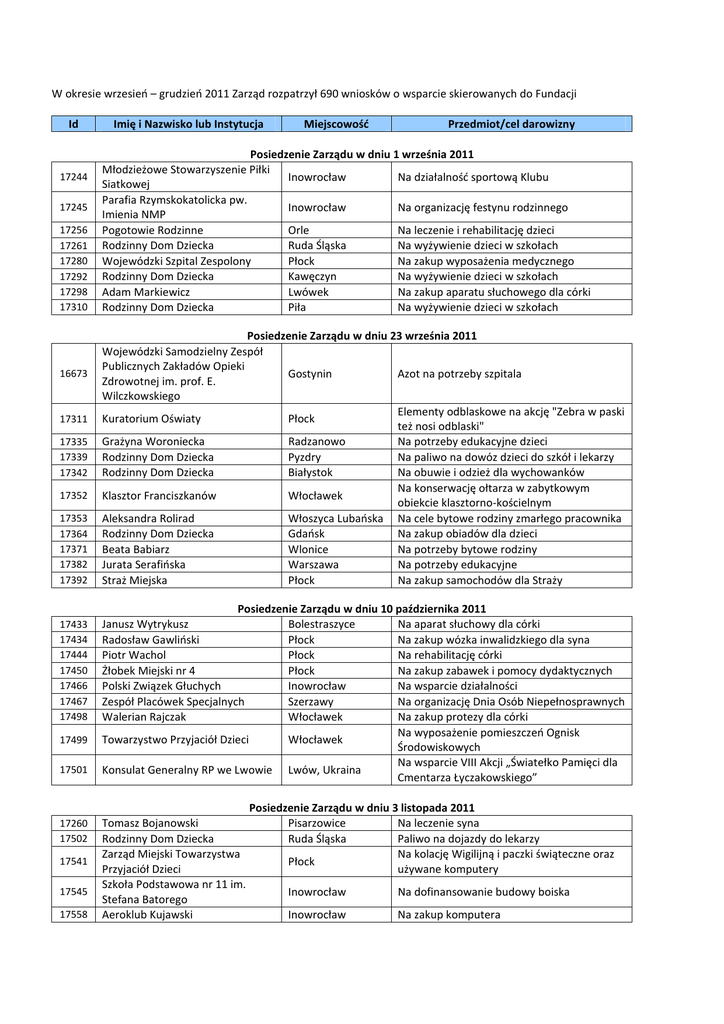 W okresie wrzesień – grudzień 2011 Zarząd rozpatrzył 690 wniosków o wsparcie skierowanych do Fundacji Id 17244 17245 17256 17261 17280 17292 17298 17310 16673 17311 17335 17339 17342 17352 17353 17364 17371 17382 17392 17433 17434 17444 17450 17466 17467 17498 17499 17501 17260 17502 17541 17545 17558 Imię i Nazwisko lub Instytucja Miejscowość Przedmiot/cel darowizny Posiedzenie Zarządu w dniu 1 września 2011 Młodzieżowe Stowarzyszenie Piłki Inowrocław Na działalność sportową Klubu Siatkowej Parafia Rzymskokatolicka pw. Inowrocław Na organizację festynu rodzinnego Imienia NMP Pogotowie Rodzinne Orle Na leczenie i rehabilitację dzieci Rodzinny Dom Dziecka Ruda Śląska Na wyżywienie dzieci w szkołach Wojewódzki Szpital Zespolony Płock Na zakup wyposażenia medycznego Rodzinny Dom Dziecka Kawęczyn Na wyżywienie dzieci w szkołach Adam Markiewicz Lwówek Na zakup aparatu słuchowego dla córki Rodzinny Dom Dziecka Piła Na wyżywienie dzieci w szkołach Posiedzenie Zarządu w dniu 23 września 2011 Wojewódzki Samodzielny Zespół Publicznych Zakładów Opieki Gostynin Azot na potrzeby szpitala Zdrowotnej im. prof. E. Wilczkowskiego Elementy odblaskowe na akcję "Zebra w paski Kuratorium Oświaty Płock też nosi odblaski" Grażyna Woroniecka Radzanowo Na potrzeby edukacyjne dzieci Rodzinny Dom Dziecka Pyzdry Na paliwo na dowóz dzieci do szkół i lekarzy Rodzinny Dom Dziecka Białystok Na obuwie i odzież dla wychowanków Na konserwację ołtarza w zabytkowym Klasztor Franciszkanów Włocławek obiekcie klasztorno-kościelnym Aleksandra Rolirad Włoszyca Lubańska Na cele bytowe rodziny zmarłego pracownika Rodzinny Dom Dziecka Gdańsk Na zakup obiadów dla dzieci Beata Babiarz Wlonice Na potrzeby bytowe rodziny Jurata Serafińska Warszawa Na potrzeby edukacyjne Straż Miejska Płock Na zakup samochodów dla Straży Posiedzenie Zarządu w dniu 10 października 2011 Janusz Wytrykusz Bolestraszyce Na aparat słuchowy dla córki Radosław Gawliński Płock Na zakup wózka inwalidzkiego dla syna Piotr Wachol Płock Na rehabilitację córki Żłobek Miejski nr 4 Płock Na zakup zabawek i pomocy dydaktycznych Polski Związek Głuchych Inowrocław Na wsparcie działalności Zespół Placówek Specjalnych Szerzawy Na organizację Dnia Osób Niepełnosprawnych Walerian Rajczak Włocławek Na zakup protezy dla córki Na wyposażenie pomieszczeń Ognisk Towarzystwo Przyjaciół Dzieci Włocławek Środowiskowych Na wsparcie VIII Akcji „Światełko Pamięci dla Konsulat Generalny RP we Lwowie Lwów, Ukraina Cmentarza Łyczakowskiego” Posiedzenie Zarządu w dniu 3 listopada 2011 Tomasz Bojanowski Pisarzowice Na leczenie syna Rodzinny Dom Dziecka Ruda Śląska Paliwo na dojazdy do lekarzy Zarząd Miejski Towarzystwa Na kolację Wigilijną i paczki świąteczne oraz Płock Przyjaciół Dzieci używane komputery Szkoła Podstawowa nr 11 im. Inowrocław Na dofinansowanie budowy boiska Stefana Batorego Aeroklub Kujawski Inowrocław Na zakup komputera 17559 17589 17620 17628 Szkoła Podstawowa im. Adama Mickiewicza Rodzinny Dom Dziecka Stowarzyszenie Klub Motocyklowy Fenix FG Wszedzień Na organizację turnieju tenisa stołowego Poznań Na artykuły żywnościowe Bydgoszcz Na organizację akcji zbiórki krwi Kamil Kucharski Łęgowo Na potrzeby bytowe dzieci zmarłego pracownika Gryfice Na zakup bielizny termoaktywnej Płock Na organizację Sympozjum Naukowego 17639 Komenda Powiatowa Państwowej Straży Pożarnej Akcja Katolicka Diecezji Płockiej 17175 17644 17649 17652 17654 17655 17670 17681 17686 17693 Rodzinny Dom Dziecka Placówka Rodzinna nr 2 Bogusława Zabielska Komenda Powiatowa Policji Rodzinny Dom Dziecka Placówka Rodzinna Alicja Włodarczyk-Tudek Rodzinny Dom Dziecka Rodzinny Dom Sylwia Eluszkiewicz 17694 Zespół Szkół Nr 3 17630 17695 17696 17722 17750 17754 17766 17773 17774 17791 17795 17798 17799 17800 17424 17801 17866 17867 17882 17885 17886 Posiedzenie Zarządu w dniu 29 listopada 2011 Przedmoście Na wyposażenie Domu Głoska Paliwo na dowóz dzieci do szkół Płock Na rehabilitację syna Ropczyce Materiały edukacyjne Miękinia Paliwo na dowóz dzieci do lekarzy Radom Paliwo na dowóz dzieci do lekarzy Gdańsk Na potrzeby bytowe rodziny Zakrzewo Paliwo na dowóz dzieci do lekarzy Stare Juchy Na sprzęt multimedialny Bogucin Na leczenie syna Aleksandrów Na wyjazd dzieci w góry Kujawski Osiedlowa Sekcja pomocy Społecznej Nr 3 "WSCHÓD" Towarzystwo Koszykówki Młodzieżowej Maria Suchodolska Jerzy Starostka Jolanta Figat Rodzinny Dom Dziecka Klub Honorowych Dawców Krwi przy IKS Klub "Kopernik" Kujawskiej Spółdzielni Mieszkaniowej Rodzinny Dom Dziecka Rodzinny Dom Dziecka Justyna Lewandowska Mariusz Lewandowski Terenowy Komitet Ochrony Praw Dziecka Włocławek Na zorganizowanie spotkania wigilijnego Włocławek Na zakup sprzętu sportowego Płock Czarny Dunajec Płock Ostrowiec Na rehabilitację syna Na zakup protezy dla córki Na potrzeby bytowe rodziny Na podręczniki i przybory szkolne Solino Na organizację Dnia Honorowego Krwiodawcy Inowrocław Na "Wigilię dla osób samotnych" Biskupice Gdańsk Gozdowo Gozdowo Na odzież, obuwie i prezenty dla dzieci Na zakup paliwa Na potrzeby edukacyjne Na potrzeby edukacyjne Na paczki świąteczne dla dzieci z Domu Dziecka Inowrocław Posiedzenie Zarządu w dniu 9 grudnia 2011 Paweł Panasiewicz Poznań Na leczenie córki Rodzinny Dom Dziecka Zamarski Paliwo na wyjazd ma ferie zimowe Dorota Romanowska Płock Na potrzeby bytowe i leczenie Przedszkole nr 20 Inowrocław Na pomoce dydaktyczne Rodzinny Dom Dziecka Gąsawa Na potrzeby wychowanków Stowarzyszenie na Rzecz Dialogu, Na budowę pomnika 100 synów Ziemi Racławice Współpracy i Rozwoju - Racławice Miechowskiej, ofiar sowieckiego ludobójstwa Małopolska Fundacja Stypendialna Kraków Na programy stypendialne Fundacji Sapere Auso Kraków Na organizację imprezy mikołajkowej 17888 17889 17890 Towarzystwo Wspierania Inicjatyw Społecznych na Rzecz 