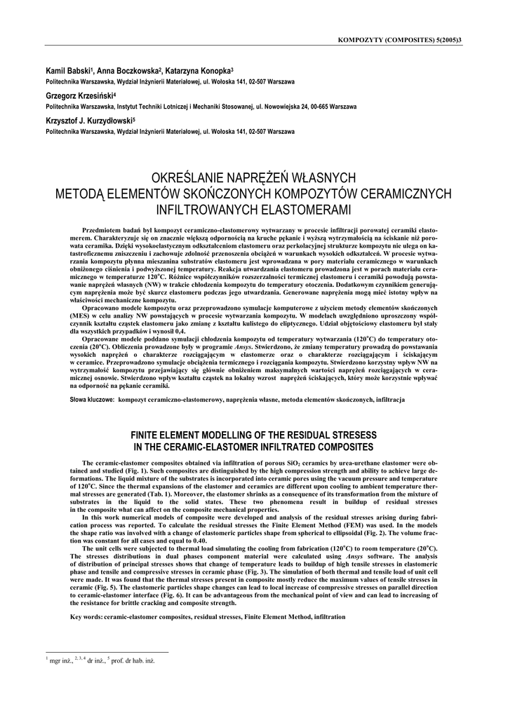 KOMPOZYTY (COMPOSITES) 5(2005)3 Kamil Babski1, Anna Boczkowska2, Katarzyna Konopka3 Politechnika Warszawska, Wydział Inżynierii Materiałowej, ul. Wołoska 141, 02-507 Warszawa Grzegorz Krzesiński4 Politechnika Warszawska, Instytut Techniki Lotniczej i Mechaniki Stosowanej, ul. Nowowiejska 24, 00-665 Warszawa Krzysztof J. Kurzydłowski5 Politechnika Warszawska, Wydział Inżynierii Materiałowej, ul. Wołoska 141, 02-507 Warszawa OKREŚLANIE NAPRĘŻEŃ WŁASNYCH METODĄ ELEMENTÓW SKOŃCZONYCH KOMPOZYTÓW CERAMICZNYCH INFILTROWANYCH ELASTOMERAMI Przedmiotem badań był kompozyt ceramiczno-elastomerowy wytwarzany w procesie infiltracji porowatej ceramiki elastomerem. Charakteryzuje się on znacznie większą odpornością na kruche pękanie i wyższą wytrzymałością na ściskanie niż porowata ceramika. Dzięki wysokoelastycznym odkształceniom elastomeru oraz perkolacyjnej strukturze kompozytu nie ulega on katastroficznemu zniszczeniu i zachowuje zdolność przenoszenia obciążeń w warunkach wysokich odkształceń. W procesie wytwarzania kompozytu płynna mieszanina substratów elastomeru jest wprowadzana w pory materiału ceramicznego w warunkach obniżonego ciśnienia i podwyższonej temperatury. Reakcja utwardzania elastomeru prowadzona jest w porach materiału ceramicznego w temperaturze 120oC. Różnice współczynników rozszerzalności termicznej elastomeru i ceramiki powodują powstawanie naprężeń własnych (NW) w trakcie chłodzenia kompozytu do temperatury otoczenia. Dodatkowym czynnikiem generującym naprężenia może być skurcz elastomeru podczas jego utwardzania. Generowane naprężenia mogą mieć istotny wpływ na właściwości mechaniczne kompozytu. Opracowano modele kompozytu oraz przeprowadzono symulacje komputerowe z użyciem metody elementów skończonych (MES) w celu analizy NW powstających w procesie wytwarzania kompozytu. W modelach uwzględniono uproszczony współczynnik kształtu cząstek elastomeru jako zmianę z kształtu kulistego do eliptycznego. Udział objętościowy elastomeru był stały dla wszystkich przypadków i wynosił 0,4. Opracowane modele poddano symulacji chłodzenia kompozytu od temperatury wytwarzania (120oC) do temperatury otoczenia (20oC). Obliczenia prowadzone były w programie Ansys. Stwierdzono, że zmiany temperatury prowadzą do powstawania wysokich naprężeń o charakterze rozciągającym w elastomerze oraz o charakterze rozciągającym i ściskającym w ceramice. Przeprowadzono symulacje obciążenia termicznego i rozciągania kompozytu. Stwierdzono korzystny wpływ NW na wytrzymałość kompozytu przejawiający się głównie obniżeniem maksymalnych wartości naprężeń rozciągających w ceramicznej osnowie. Stwierdzono wpływ kształtu cząstek na lokalny wzrost naprężeń ściskających, który może korzystnie wpływać na odporność na pękanie ceramiki. Słowa kluczowe: kompozyt ceramiczno-elastomerowy, naprężenia własne, metoda elementów skończonych, infiltracja FINITE ELEMENT MODELLING OF THE RESIDUAL STRESESS IN THE CERAMIC-ELASTOMER INFILTRATED COMPOSITES The ceramic-elastomer composites obtained via infiltration of porous SiO2 ceramics by urea-urethane elastomer were obtained and studied (Fig. 1). Such composites are distinguished by the high compression strength and ability to achieve large deformations. The liquid mixture of the substrates is incorporated into ceramic pores using the vacuum pressure and temperature of 120oC. Since the thermal expansions of the elastomer and ceramics are different upon cooling to ambient temperature thermal stresses are generated (Tab. 1). Moreover, the elastomer shrinks as a consequence of its transformation from the mixture of substrates in the liquid to the solid states. These two phenomena result in buildup of residual stresses in the composite what can affect on the composite mechanical properties. In this work numerical models of composite were developed and analysis of the residual stresses arising during fabrication process was reported. To calculate the residual stresses the Finite Element Method (FEM) was used. In the models the shape ratio was involved with a change of elastomeric particles shape from spherical to ellipsoidal (Fig. 2). The volume fraction was constant for all cases and equal to 0.40. The unit cells were subjected to thermal load simulating the cooling from fabrication (120oC) to room temperature (20oC). The stresses distributions in dual phases component material were calculated using Ansys software. The analysis of distribution of principal stresses shows that change of temperature leads to buildup of high tensile stresses in elastomeric phase and tensile and compressive stresses in ceramic phase (Fig. 3). The simulation of both thermal and tensile load of unit cell were made. It was found that the thermal stresses present in composite mostly reduce the maximum values of tensile stresses in ceramic (Fig. 5). The elastomeric particles shape changes can lead to local increase of compressive stresses on parallel direction to ceramic-elastomer interface (Fig. 6). It can be advantageous from the mechanical point of view and can lead to increasing of the resistance for brittle cracking and composite strength. Key words: ceramic-elastomer composites, residual stresses, Finite Element Method, infiltration 1 mgr inż., 2, 3, 4 dr inż., 5 prof. dr hab. inż. 41 Określanie naprężeń własnych metodą elementów skończonych kompozytów ceramicznych infiltrowanych elastomerami WSTĘP Kompozyty ceramika-elastomer otrzymywane są w procesie infiltracji, w wyniku której powstaje struktura tzw. perkolacji faz. Kompozyt wykazuje znaczny wzrost wytrzymałości na ściskanie w porównaniu do porowatej ceramiki [1]. Charakteryzuje się dużą sztywnością w zakresie nieprzekraczającym krytycznych naprężeń niszczących ceramiczną osnowę. Po zniszczeniu ceramicznego szkieletu rolę osnowy przejmuje elastomer, dzięki czemu kompozyt ulega duży