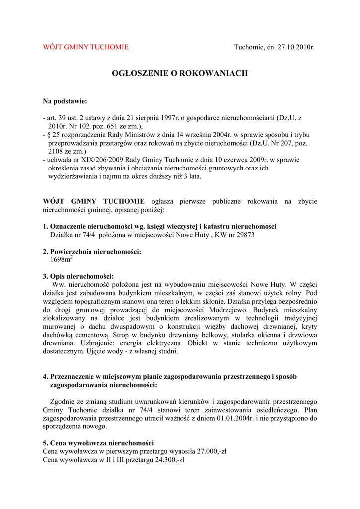 WÓJT GMINY TUCHOMIE Tuchomie, dn. 27.10.2010r. OGŁOSZENIE O ROKOWANIACH Na podstawie: - art. 39 ust. 2 ustawy z dnia 21 sierpnia 1997r. o gospodarce nieruchomościami (Dz.U. z 2010r. Nr 102, poz. 651 ze zm.), - § 25 rozporządzenia Rady Ministrów z dnia 14 września 2004r. w sprawie sposobu i trybu przeprowadzania przetargów oraz rokowań na zbycie nieruchomości (Dz.U. Nr 207, poz. 2108 ze zm.) - uchwała nr XIX/206/2009 Rady Gminy Tuchomie z dnia 10 czerwca 2009r. w sprawie określenia zasad zbywania i obciążania nieruchomości gruntowych oraz ich wydzierżawiania i najmu na okres dłuższy niż 3 lata. WÓJT GMINY TUCHOMIE ogłasza pierwsze publiczne rokowania na zbycie nieruchomości gminnej, opisanej poniżej: 1. Oznaczenie nieruchomości wg. księgi wieczystej i katastru nieruchomości Działka nr 74/4 położona w miejscowości Nowe Huty , KW nr 29873 2. Powierzchnia nieruchomości: 1698m2 3. Opis nieruchomości: Ww. nieruchomość położona jest na wybudowaniu miejscowości Nowe Huty. W części działka jest zabudowana budynkiem mieszkalnym, w części zaś stanowi użytek rolny. Pod względem topograficznym stanowi ona teren o lekkim skłonie. Działka przylega bezpośrednio do drogi gruntowej prowadzącej do miejscowości Modrzejewo. Budynek mieszkalny zlokalizowany na działce jest budynkiem zrealizowanym w technologii tradycyjnej murowanej o dachu dwuspadowym o konstrukcji więźby dachowej drewnianej, kryty dachówką cementową. Strop w budynku drewniany belkowy, stolarka okienna i drzwiowa drewniana. Uzbrojenie: energia elektryczna. Obiekt w stanie techniczno użytkowym dostatecznym. Ujęcie wody - z własnej studni. 4. Przeznaczenie w miejscowym planie zagospodarowania przestrzennego i sposób zagospodarowania nieruchomości: Zgodnie ze zmianą studium uwarunkowań kierunków i zagospodarowania przestrzennego Gminy Tuchomie działka nr 74/4 stanowi teren zainwestowania osiedleńczego. Plan zagospodarowania przestrzennego utracił ważność z dniem 01.01.2004r. i nie przystąpiono do sporządzenia nowego. 5. Cena wywoławcza nieruchomości Cena wywoławcza w pierwszym przetargu wynosiła 27.000,-zł Cena wywoławcza w II i III przetargu 24.300,-zł Cena wywoławcza do rokowań złotych 00/100). 24.300,-zł (słownie: dwadzieścia cztery tysiące trzysta 6. Forma zbycia Sprzedaż prawa własności. 7. Termin do złożenia wniosku przez osoby, którym przysługuje pierwszeństwo w nabyciu nieruchomości na podst. art. 34 ust. 1 pkt 1 i 2 W wykazie o przeznaczeniu do sprzedaży z dnia 24.08.2009r. określono termin składania wniosku o nabycie przez osoby spełniające warunki określone w art. 34 ust. 1 pkt 1 i 2 ustawy o gospodarce nieruchomościami do dnia 07 października 2009r. Po upływie tego terminu nie zgłosiły się żadne osoby uprawnione. 8. Obciążenia: Księga wieczysta nr 29873 jest wolna od wszelkich obciążeń. W budynku mieszkalnym położonym na działce, opisanej w pkt 3 niniejszego ogłoszenia zameldowana jest osoba, obecnie przebywająca w areszcie. Budynek mieszkalny jest obciążony umowa najmu do dnia 08.12.2010r. 9. Terminy przeprowadzonych przetargów: Wyznaczone dotychczas nieskuteczne przetargi odbyły się w dniach: - 09.11.2009r., 13.04.2010r. i 14.07.2010r. 10. Możliwości, termin i miejsce składania pisemnych zgłoszeń udziału w rokowaniach. Osoby zainteresowane rokowaniami powinny zgłosić swój udziału w zamkniętej kopercie w sekretariacie pok. nr 5 Urzędu Gminy Tuchomie ul. Jana III Sobieskiego 16 w Tuchomiu w terminie do dnia 06 grudnia 2010r. do godziny 1300 z opisem „ Nowe Huty działka nr 74/4 – rokowania”. Zgłoszenie powinno zawierać: - imię, nazwisko i adres albo nazwę lub firmę oraz siedzibę jeżeli zgłaszającym jest osoba prawna lub inny podmiot, - datę sporządzenia zgłoszenia, - oświadczenie, że zgłaszający zapoznał się z warunkami rokowań i przejmuje te warunki bez zastrzeżeń, - proponowaną cenę i sposób jej zapłaty, - proponowany sposób realizacji dodatkowych warunków rokowań. Do zgłoszenia należy dołączyć kopię dowodu wpłaty zaliczki, określonej w pkt 13 niniejszego ogłoszenia lub dowody stanowiące podstawę do zwolnienia z tego obowiązku. 11. Termin i miejsce, w którym można zapoznać się z dodatkowymi warunkami rokowań. Dokumentacja dotycząca przedmiotu rokowań znajduje się w Referacie Gospodarczym (pok. nr 3) UG i jest do wglądu w godz. pracy urzędu tj.: 730 – 1530, nr tel. 059 821 50 42. 12. Termin przeprowadzenia rokowań: Rokowania na zbycie ww. nieruchomości odbędą się w dniu 10 grudnia 2010r.o godzinie 10 w lokalu nr 1 Urzędu Gminy Tuchomie w Tuchomiu przy ul. Jana III Sobieskiego 16. 00 13. Warunek uczestnictwa w rokowaniach oraz termin, miejsce wpłaty oraz wysokość zaliczki. Warunkiem uczestnictwa w rokowaniach oprócz zgłoszenia, o którym mowa w pkt 10 jest wpłata zaliczki tytułem zabezpieczenia kosztów w przypadku uchylenia się od zawarcia umowy w wysokości: 2.430zł (słownie: dwa tysiące czterysta trzydzieści złotych 00/100). Zaliczkę w wysokości j.w. można wpłacać w kasie UG do godziny 1300 codziennie, jednak nie później niż do dnia 06 grudnia 2010r. lub na konto UG Nr 05 9321 0001 0000 1821 2000 0020 Bank Spółdzielczy w Bytowie. W razie wpłat na konto zaliczka powinna być wnoszona w wyprzedzeniem, aby środki pieniężne znalazły się na rachunku bankowym w dniu 06 grudnia 2010r. pod rygorem uznania przez komisję przetargową, że warunek wpłaty zaliczki nie został spełniony. 14. Skutki uchylenia się od zawarcia umowy sprzedaży nieruchomości. Jeżeli osoba ustalona jako nabywca nieruchomości nie przystąpi bez usprawiedliwienia do umowy sprzedaży w podanym w zawiadomieniu terminie i miejscu, organizator rokowań może odstąpić od zawarcia umowy a rokowania uznać za niebyłe. 15. Ważność rokowań. Rokowania można przeprowadzić, chociażby wpłynęło tylko jedno zgłoszenie spełniające waru