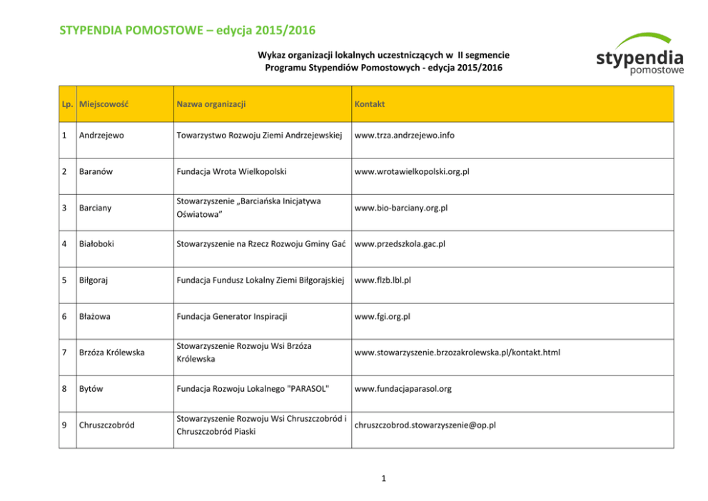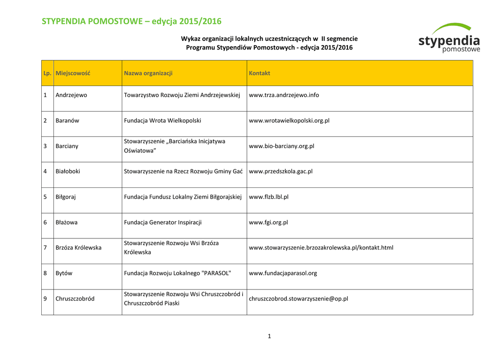 STYPENDIA POMOSTOWE – edycja 2015/2016 Wykaz organizacji lokalnych uczestniczących w II segmencie Programu Stypendiów Pomostowych - edycja 2015/2016 Lp. Miejscowość Nazwa organizacji Kontakt 1 Andrzejewo Towarzystwo Rozwoju Ziemi Andrzejewskiej www.trza.andrzejewo.info 2 Baranów Fundacja Wrota Wielkopolski www.wrotawielkopolski.org.pl 3 Barciany Stowarzyszenie „Barciańska Inicjatywa Oświatowa” www.bio-barciany.org.pl 4 Białoboki Stowarzyszenie na Rzecz Rozwoju Gminy Gać www.przedszkola.gac.pl 5 Biłgoraj Fundacja Fundusz Lokalny Ziemi Biłgorajskiej www.flzb.lbl.pl 6 Błażowa Fundacja Generator Inspiracji www.fgi.org.pl 7 Brzóza Królewska Stowarzyszenie Rozwoju Wsi Brzóza Królewska www.stowarzyszenie.brzozakrolewska.pl/kontakt.html 8 Bytów Fundacja Rozwoju Lokalnego "PARASOL" www.fundacjaparasol.org 9 Chruszczobród Stowarzyszenie Rozwoju Wsi Chruszczobród i [email protected] Chruszczobród Piaski 1 STYPENDIA POMOSTOWE – edycja 2015/2016 Wykaz organizacji lokalnych uczestniczących w II segmencie Programu Stypendiów Pomostowych - edycja 2015/2016 Lp. Miejscowość Nazwa organizacji Kontakt 10 Ciechrz Stowarzyszenie Kwiecista Wieś www.strzelno.pl/?a=4723 11 Cieszyn Macierz Ziemi Cieszyńskiej Towarzystwo Miłośników Regionu www.macierz.cieszyn.pl 12 Człuchów Stowarzyszenie Wspierania Rozwoju Powiatu www.stowarzyszenie.czluchow.org.pl Człuchowskiego 13 Ćmińsk Fundacja Świętokrzyska Społeczność 14 Dąbrowice Stowarzyszenie Przyjaciół Dąbrowic 15 Dębica Stowarzyszenie Dębicki Klub Biznesu www.dkb.info.pl 16 Dębno Stowarzyszenie Rozwoju Wsi Dębno www.stowdebno.pl 17 Dubiecko Towarzystwo Przyjaciół Ziemi Dubieckiej www.tpzd.dubiecko.com.pl 18 Dziemiany Stowarzyszenie na Rzecz Rozwoju Gminy Dziemiany www.fundacjass.org 2 STYPENDIA POMOSTOWE – edycja 2015/2016 Wykaz organizacji lokalnych uczestniczących w II segmencie Programu Stypendiów Pomostowych - edycja 2015/2016 Lp. Miejscowość Nazwa organizacji Kontakt 19 Dzierzgowo Stowarzyszenie Wspierania Inicjatyw Społecznych Gminy Dzierzgowo „ARKA” www.stowarzyszeniearka.pl 20 Głubczyce Stowarzyszenie Pożytku Publicznego im. B. Adamskiej Absolwentów I LO im. A. Mickiewicza www.absolwencilo.glubczyce.pl 21 Gołąb k/Puław Stowarzyszenie Mieszkańców Doliny Wisły 22 Górowo Iławeckie Grupa Nieformalna - Ochotnicza Straż Pożarna www.gorowoilaweckie.osp.org.pl 23 Gronów Fundacja Alicji www.gronow.pl 24 Grzybów k/Słubic Fundacja Fundusz Lokalny Ziemi Płockiej "Młodzi Razem" www.mlodzirazem.pl 25 Hajnówka Stowarzyszenie Samorządów Euroregionu Puszcza Białowieska www.euroregion-pb.pl 26 Ilkowice Stowarzyszenie Rozwoju Wsi Ilkowice 3 STYPENDIA POMOSTOWE – edycja 2015/2016 Wykaz organizacji lokalnych uczestniczących w II segmencie Programu Stypendiów Pomostowych - edycja 2015/2016 Lp. Miejscowość Nazwa organizacji Kontakt 27 Iława Stowarzyszenie PRZYSTAŃ www.przystan.ilawa.pl 28 Iwkowa Stowarzyszenie Rozwoju i Promocji Gminy Iwkowa www.iwkowa.pl/stowarzyszenie 29 Jamy Fundacja na Rzecz Spacyfikowanej przez Hitlerowców Wsi Jamy www.fundacjamy.dbv.pl/news.php 30 Janiszewko (Pelplin) Fundacja Pokolenia www.fundacjapokolenia.pl 31 Jasionna Katolickie Stowarzyszenie Serca dla Serc w Jasionnie www.sercadlaserc.republika.pl 32 Jastków Towarzystwo Przyjaciół Ziemi Jastkowskiej www.tpzj.pl 33 Kamionka Nidzicki Fundusz Lokalny www.funduszlokalny.nidzica.pl 34 Kielce Stowarzyszenie Świętokrzyski Fundusz Lokalny www.funduszlokalny.kielce.pl 35 Kolbuszowa Regionalna Fundacja Rozwoju "Serce" www.fundacjaserce.org 4 STYPENDIA POMOSTOWE – edycja 2015/2016 Wykaz organizacji lokalnych uczestniczących w II segmencie Programu Stypendiów Pomostowych - edycja 2015/2016 Lp. Miejscowość Nazwa organizacji Kontakt 36 Konin Towarzystwo Samorządowe www.stypendia.ts.konin.pl 37 Koszoły Stowarzyszenie Społeczno-Kulturalne „Tłoka” [email protected] 38 Kościan Stowarzyszenie Oświatowe im. Dezyderego Chłapowskiego www.so.koscian.net 39 Kozarze k/Ciechanowca Stowarzyszenie "TUTOR" www.stowarzyszenie-tutor.pl 40 Kwiatonowice Kwiatonowickie Stowarzyszenie HOMINI www.kwiatonowice.pl 41 Lipnica Murowana Podgórskie Stowarzyszenie KulturalnoSpołeczne www.psks.eu 42 Lipusz Stowarzyszenie Lokalna Grupa Działania STOLEM www.lgdstolem.pl 43 Lipusz Stowarzyszenie na Rzecz Rozwoju Gminy Lipusz www.lipusz.org 44 Łącko Fundacja Stypendialna "Dzieło św. Kingi" www.kinga.org.pl/info.html 5 STYPENDIA POMOSTOWE – edycja 2015/2016 Wykaz organizacji lokalnych uczestniczących w II segmencie Programu Stypendiów Pomostowych - edycja 2015/2016 Lp. Miejscowość Nazwa organizacji Kontakt 45 Łężyce Fundacja dla Was www.dlawas.org 46 Łukta Fundacja Rozwoju Regionu Łukta www.frrl.org.pl 47 Mądrzechowo Stowarzyszenie na Rzecz Sołectw Gminy Bytów [email protected] 48 Międzychód Stowarzyszenie Nowy Międzychód www.nowymiedzychod.pl 49 Młynary Stowarzyszenie na Rzecz Dzieci i Młodzieży Gminy Młynary www.mlynary.org.pl/ 50 Muszyna Stowarzyszenie Przyjaciół Almanachu Muszyny www.almanachmuszyny.pl 51 Myszyniec Związek Stowarzyszeń "Kurpsie Razem" www.kurpsierazem.eu 52 Nakło Śląskie Fundacja "Dzieci Śląska im. Kai Mireckiej Ploss" www.dziecislaska.org 53 Nisko Lokalna Grupa Działania Stowarzyszenie „Partnerstwo dla Ziemi Niżańskiej” www.lgdnisko.pl 6 STYPENDIA POMOSTOWE – edycja 2015/2016 Wykaz organizacji lokalnych uczestniczących w II segmencie Programu Stypendiów Pomostowych - edycja 2015/2016 Lp. Miejscowość Nazwa organizacji Kontakt 54 Niskowa Fundacja Sądecka www.sadeczanin.pl 55 Olkusz Stowarzyszenie Dobroczynne "Res Sacra Miser" w Olkuszu www.rsm.olkusz.pl 56 Pawłosiów Lokalna Grupa Działania Stowarzyszenie "Z Tradycją w Nowoczesność" www.ztradycjawnowoczesnosc.pl 57 Pierzchnica Fundacja Rozwoju Regionu Pierzchnica www.frrp.pl 58 Raba Wyżna Stowarzyszenie Oświatowe "Echo" www.soecho.rabawyzna.pl 59 Rdzawka Stowarzyszenie na Rzecz Rozwoju Kulturalnego Wsi Rd