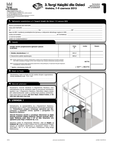 3.Targi Książki dla Dzieci Kraków, 7-9 czerwca 2013 Formularz zgłoszeniowy dla przedszkoli Targi w Krakowie Sp. z o.o. 31-586 Kraków, ul. Centralna 41 A tel. (+4812) 6445932, 6519035, fax (+4812) 6446141 e-mail: [email protected] KRS 0000192313 Sàd Rejonowy dla Krakowa ÂródmieÊcia w Krakowie XI Wydzia∏ Gospodarczy Krajowego Rejestru Sàdowego NIP 676-10-50-090 1. 1 Zg∏oszenie uczestnictwa w 3. Targach Ksià˝ki dla Dzieci, 7-9 czerwca 2013 Nazwa przedszkola (DO FAKTURY):______________________________________________________________________________________________ Adres (DO FAKTURY): _________________________________________________________________________________________________________ tel.: ___________________________________ fax: _______________________________________NIP: _____________________________________ Wpis do KRS / ewidencji przedsi´biorców (prosimy o za∏àczenie aktualnego wypisu) nr KRS:_______________________________________________ osoba do kontaktu: _______________________________________________tel. kontaktowy: ______________________________________________ e-mail do kontaktu: __________________________________________________________________________________________________________ ADRES DO KORESPONDENCJI: __________________________________________________________________________________________________ 2. Cennik Uwaga: Termin przyjmowania zg∏oszeƒ up∏ywa 13.05.2013 Cena zł 1. Stoisko standardowe 3 m2 300 z∏ 2. Bezzwrotna op∏ata rejestracyjna 300 z∏ Ad. 1 Stoisko zabudowane w systemie oktagonalnym, pokryte szarà wyk∏adzinà dywanowà; fryz (pkt 4), gniazdo 230 V/2kW, oświetlenie (1 halogen na 3m2), stó∏, 2 krzes∏a, kosz, wieszak, standardowe sprzątanie stoiska. Liczba Razem NE T T O Ad. 2 W ramach bezzwrotnej op∏aty rejestracyjnej zapewniamy: kart´ parkingowà, 10 zaproszeƒ dla goÊci targowych, 2 identyfikatory, reklamę internetową + VA T * * = B R UT T O ** Zgodnie z obowiàzujàcà stawkà VAT 3. Napis na fryzie Standardowy napis na fryzie do 20 znaków (krojem organizatora). Każdy dodatkowy znak - 9 z≥ + VAT ..................................................................................................................... .................................................................................................................... 4. Warunki p∏atnoÊci Akceptujemy warunki okreÊlone w Regulaminie Wystawcy oraz zobowiàzujemy si´ do wniesienia op∏at za poczynione zamówienia zgodnie z par. 3 Regulaminu Wystawcy. Warunkiem obj´cia stoiska jest udokumentowanie wp∏at w postaci kopii przelewu potwierdzonego przez bank na konto: ING Bank Âlàski, Oddzia∏ Kraków, nr 82 1050 1445 1000 0022 9166 0138. 5. UWAGA ! OÊwiadczamy, ˝e zaznajomiliÊmy si´ z Regulaminem Wystawcy, akceptujemy go w ca∏oÊci i zobowiπzujemy si´ do jego przestrzegania. Potwierdzenie przyjÍcia niniejszego zg≥oszenia jest równoznaczne z zawarciem umowy zgodnie z paragrafem 2.2 Regulaminu Wystawcy. Warunki finansowe zawarte w powy˝szym dokumencie sà obj´te klauzulà poufnoÊci wià˝àcà Wystawc´. Klauzula poufnoÊci obowiàzuje Wystawc´ przez okres 3 lat od daty otrzymania w/w zgłoszenia przez Targi w Krakowie Sp. z o.o. Wyra˝amy zgod´ na otrzymywanie informacji i ofert od Targów w Krakowie Sp. z o.o. na adres mailowy oraz na przetwarzanie naszych danych na zasadach okreÊlonych w przepisach Ustawy z dnia 18.07.2002 r. (Dz. U. nr 144, poz.1204) o Âwiadczeniu Us∏ug Drogà Elektronicznà. data piecz´ç przedszkola podpis dyrektora Regulamin Wystawcy 1. Postanowienia ogólne 1.1. Niniejszy regulamin jest integralnà cz´Êcià umowy. 2. Warunki udzia∏u w Targach 2.1. Wystawcà mo˝e byç osoba prawna lub fizyczna, prezentujàca ofert´ zgodnie z zakresem tematycznym Targów, zaakceptowanà przez Targi w Krakowie Sp. z o.o. (nazywane w dalszej cz´Êci TwK). 2.2. Do zawarcia umowy uczestnictwa w Targach mi´dzy TwK a Wystawcà dochodzi po uiszczeniu opłaty rejestracyjnej, podpisaniu i przes∏aniu pocztà, pocztà elektronicznà lub faxem przez Wystawc´ formularzy/a zg∏oszeniowych, przygotowanych przez TwK i potwierdzeniu zg∏oszenia uczestnictwa przez TwK drogà pocztowà, faxem lub pocztà elektronicznà. Potwierdzenie zg∏oszenia, o którym mowa, nast´puje w terminie 30 dni od daty dor´czenia zg∏oszenia podpisanego i opiecz´towanego przez Wystawc´. Wystawca jest zobowiàzany, w zale˝noÊci od formy prowadzonej dzia∏alnoÊci, przedstawiç aktualny wypis z KRS lub odpowiedni dokument z ewidencji dzia∏alnoÊci gospodarczej. 2.3. Taka sama procedura dotyczy zawierania umów na inne usługi Êwiadczone przez TwK. 2.4. Wystawca mo˝e utraciç prawo do udzia∏u w Targach z chwilà: a) niezap∏acenia nale˝noÊci za uczestnictwo w terminie okreÊlonym na druku zg∏oszeniowym; b) nieprzestrzegania przepisów regulaminu. Je˝eli TwK korzysta z powy˝szego uprawnienia, sk∏ada Wystawcy oÊwiadczenie o rozwiàzaniu umowy bez zachowania okresu wypowiedzenia i ma prawo domagaç si´ od Wystawcy uiszczenia wszelkich nale˝noÊci z tytu∏u udzia∏u w Targach lub odszkodowania. 2.5. TwK mo˝e odmówiç potwierdzenia zg∏oszenia bez podania przyczyn. W takim wypadku pisemnie powiadamia zg∏aszajàcegoo odmowie w terminie 30 dni od daty dor´czenia zg∏oszenia. 2.6. W razie odmowy potwierdzenia zg∏oszenia przez TwK, Wystawcy przys∏uguje zwrot wszystkich wp∏aconych przez niego kwot. Nie przys∏ugujà natomiast inne roszczenia z tego tytu∏u. 2.7. W przypadku kiedy Wystawca nie ureguluje wszystkich p∏atnoÊci za udzia∏ w Targach zorganizowanych przez TwK przed zakoƒczeniem imprezy, TwK zastrzega sobie prawo zatrzymania eksponatów oraz innych ruchomoÊci znajdujàcych si´ na stoisku wystawcy oraz ustanowienia na nich zastawu do chwili uregulowania wszystkich nale˝noÊci przez Wystawc´. Wystawca zrzeka si´ ewentualnych roszczeƒ z tytu∏u dokonania wymienionych czynnoÊci przez TwK. 3. Warunk
