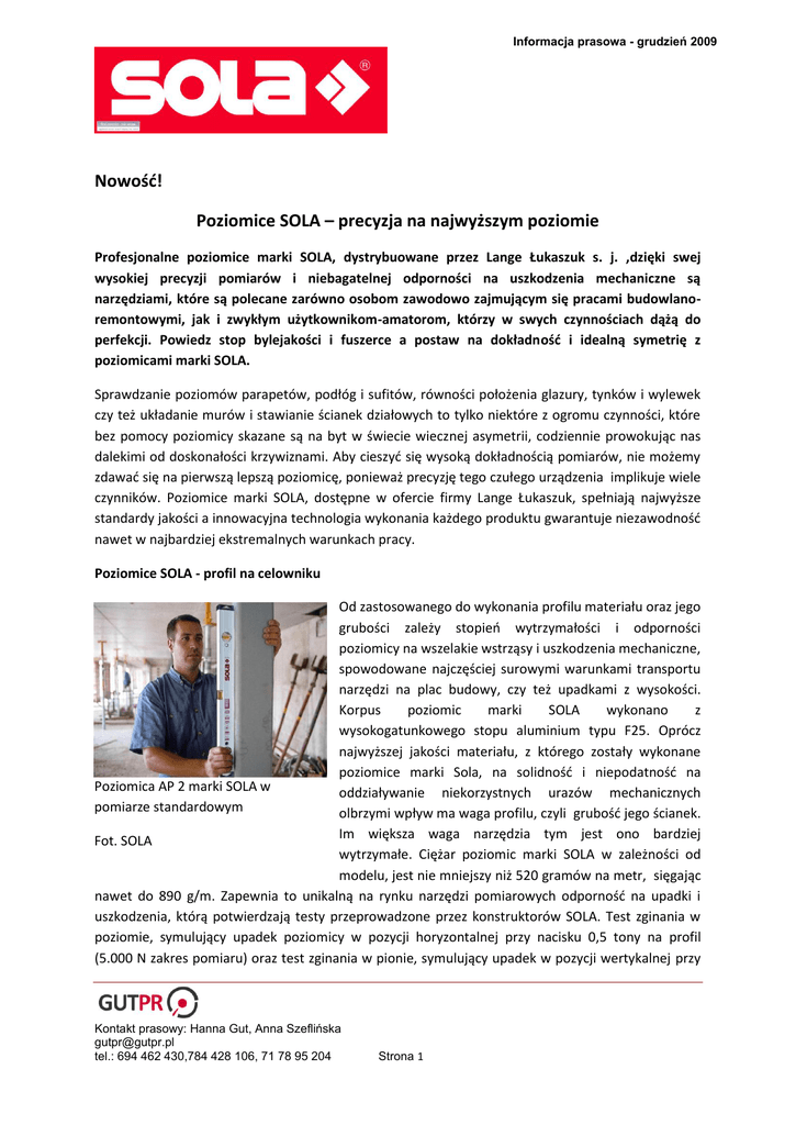 Informacja prasowa - grudzień 2009 Nowośd! Poziomice SOLA – precyzja na najwyższym poziomie Profesjonalne poziomice marki SOLA, dystrybuowane przez Lange Łukaszuk s. j. ,dzięki swej wysokiej precyzji pomiarów i niebagatelnej odporności na uszkodzenia mechaniczne są narzędziami, które są polecane zarówno osobom zawodowo zajmującym się pracami budowlanoremontowymi, jak i zwykłym użytkownikom-amatorom, którzy w swych czynnościach dążą do perfekcji. Powiedz stop bylejakości i fuszerce a postaw na dokładnośd i idealną symetrię z poziomicami marki SOLA. Sprawdzanie poziomów parapetów, podłóg i sufitów, równości położenia glazury, tynków i wylewek czy też układanie murów i stawianie ścianek działowych to tylko niektóre z ogromu czynności, które bez pomocy poziomicy skazane są na byt w świecie wiecznej asymetrii, codziennie prowokując nas dalekimi od doskonałości krzywiznami. Aby cieszyd się wysoką dokładnością pomiarów, nie możemy zdawad się na pierwszą lepszą poziomicę, ponieważ precyzję tego czułego urządzenia implikuje wiele czynników. Poziomice marki SOLA, dostępne w ofercie firmy Lange Łukaszuk, spełniają najwyższe standardy jakości a innowacyjna technologia wykonania każdego produktu gwarantuje niezawodnośd nawet w najbardziej ekstremalnych warunkach pracy. Poziomice SOLA - profil na celowniku Od zastosowanego do wykonania profilu materiału oraz jego grubości zależy stopieo wytrzymałości i odporności poziomicy na wszelakie wstrząsy i uszkodzenia mechaniczne, spowodowane najczęściej surowymi warunkami transportu narzędzi na plac budowy, czy też upadkami z wysokości. Korpus poziomic marki SOLA wykonano z wysokogatunkowego stopu aluminium typu F25. Oprócz najwyższej jakości materiału, z którego zostały wykonane poziomice marki Sola, na solidnośd i niepodatnośd na Poziomica AP 2 marki SOLA w oddziaływanie niekorzystnych urazów mechanicznych pomiarze standardowym olbrzymi wpływ ma waga profilu, czyli grubośd jego ścianek. Im większa waga narzędzia tym jest ono bardziej Fot. SOLA wytrzymałe. Ciężar poziomic marki SOLA w zależności od modelu, jest nie mniejszy niż 520 gramów na metr, sięgając nawet do 890 g/m. Zapewnia to unikalną na rynku narzędzi pomiarowych odpornośd na upadki i uszkodzenia, którą potwierdzają testy przeprowadzone przez konstruktorów SOLA. Test zginania w poziomie, symulujący upadek poziomicy w pozycji horyzontalnej przy nacisku 0,5 tony na profil (5.000 N zakres pomiaru) oraz test zginania w pionie, symulujący upadek w pozycji wertykalnej przy Kontakt prasowy: Hanna Gut, Anna Szeflińska [email protected] tel.: 694 462 430,784 428 106, 71 78 95 204 Strona 1 Informacja prasowa - grudzień 2009 nacisku na profil 5 ton (50.000 N zakres pomiaru), jednoznacznie wykazały, że poziomice marki SOLA będą nam bezawaryjne służyły przez wiele długich lat. Ponadto w niektórych modelach wykorzystanie magnesów umieszczonych od spodu profilu pozwala na nieruchome przytwierdzenie poziomicy do konstrukcji stalowej, znacznie ułatwiając prace pomiarowe. Libelka – serce poziomicy Libelka to nic innego, jak zamknięta kapsułka z cieczą i pęcherzykiem gazu pełniącym funkcję wskazówki, która wykorzystując siłę grawitacji, informuje czy dana płaszczyzna jest pionowa lub pozioma. Libelki użyte w poziomicach marki SOLA, dystrybuowanych przez firmę Lange Łukaszuk, dzięki idealnej symetrii w osi poziomej i pionowej umożliwiają również odwrócony pomiar. Bezkonkurencyjnośd na rynku gwarantuje poziomicom SOLA wiele czynników, spośród których należy wymienid przede wszystkim wysoka jakośd użytych materiałów i Poziomica BigX 3 marki SOLA w standard wykonania. Każda z libelek wykonana jest z pomiarze odwróconym niezwykle odpornego na zarysowania i deformacje akrylu, a fluorescencyjna ciecz koloru zielonego wypełniająca Fot. SOLA kapsułkę ma właściwości antystatyczne oraz nie jest podatna na szkodliwe oddziaływanie promieni UV i wahania temperatur sięgających nawet do -20°C. Dzięki temu nie musimy się martwid o to, że pozostawione na budowie narzędzie, będąc narażone na wpływ niekorzystnych warunków atmosferycznych i temperaturowych, dokona pomiarów obarczonych błędem. Ciecz w libelkach marki SOLA cechuje się przede wszystkim wysoką klarownością, a wspominana już odpornośd na światło i temperaturę sprawia, że nie płowieje ona na słoocu oraz nie pieni się w temperaturze poniżej 0°C, umożliwiając niczym nie utrudniony odczyt w każdych warunkach. Nawet w sytuacji, kiedy dysponujemy niewielkim natężeniem światła, odczyt jest znacznie ułatwiony, dzięki wyposażeniu libelek SOLI w płytkę odblaskową oraz soczewkę, która optycznie powiększając pęcherzyk czyni go o 30% bardziej widocznym. Pierścienie, zwane również znacznikami, nie są fragmentarycznie namalowane na powierzchni kapsułki, lecz są równomiernie nadrukowane 360° wzdłuż jej szerokości, przez co odczyt nie jest w żaden sposób utrudniony. Spawając ultradźwiękowo libelki, praktycznie wyeliminowano możliwośd jakichkolwiek wycieków, na co firma SOLA udziela aż 30-letniej gwarancji. Kontakt prasowy: Hanna Gut, Anna Szeflińska [email protected] tel.: 694 462 430,784 428 106, 71 78 95 204 Strona 2 Informacja prasowa - grudzień 2009 Poziomice SOLA - precyzja pomiaru SOLA już od 15 lat posiada certyfikat ISO 9001, co oznacza między innymi, że każdy produkt tej firmy jest rygorystycznie i szczegółowo badany pod względem jakości. Tym samym użytkownicy mogą mied 100% pewnośd tego, iż wszystkie informacje umiejscowione na powierzchni poziomic a dotyczące parametrów są jak najbardziej zgodne z wynikami skrupulatnie przeprowadzanych testów jakości. W zależności od modelu, tolerancja błędu w pomiarze w pozycji standardowej wynosi od 0,3 do 0,5mm/m. Natomiast w Poziomica AZ 1 marki SOLA w przypadku pomiaru w pozycji 