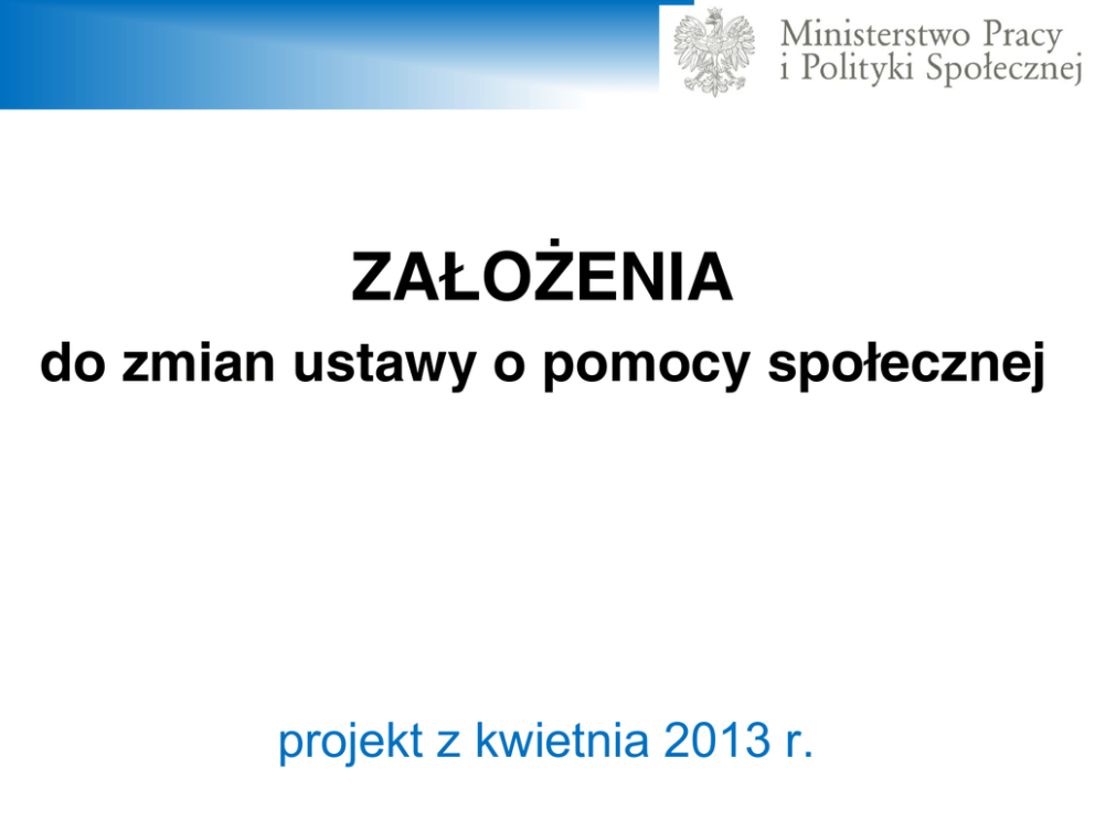 ZAŁOŻENIA do zmian ustawy o pomocy społecznej projekt z kwietnia 2013 r. CEL PROPONOWANYCH ZMIAN: 1. Poprawa efektywności działań wszystkich instytucji i podmiotów realizujących zadania w obszarze pomocy społecznej dla uzyskania skutecznego wsparcia, umożliwiającego przezwyciężanie trudnych sytuacji życiowych osób i rodzin tego wymagających. 2. Wzmocnienie solidarnościowej misji pracy socjalnej, czyli umożliwienie wszystkim ludziom rozwoju ich pełnego potencjału, wzbogacanie ich życia i zapobieganie dysfunkcjom a także ingerowanie dokładnie tam gdzie dochodzi do wzajemnego oddziaływania ludzi i środowiska z zachowaniem zasady pomocniczości państwa. ZAŁOŻENIA DO ZMIAN DO USTAWY O POMOCY SPOŁECZNEJ ZAŁOŻENIE nr 1: Wzmocnienie bezpieczeństwa socjalnego obywateli i rodzin przy jednoczesnym wzroście ich aktywności w rozwiązywaniu własnych problemów i trudności życiowych we współdziałaniu z instytucjami pomocy społecznej ZAŁOŻENIE nr 4: Zmiany w obszarze instytucjonalnych form pomocy oraz wzmocnienie odpowiedzialności rodziny za swoich członków korzystających z tej formy wsparcia ZAŁOŻENIE nr 2: Podniesienie efektywności systemu organizacyjnego pomocy społecznej wraz z zapewnieniem jego kompatybilności z innymi systemami wsparcia ZAŁOŻENIE nr 3: Wzmocnienie na poziomie gminy i powiatu skuteczności podstawowych narzędzi i instrumentów pracy socjalnej dla wyprowadzania osób i rodzin ze sfery zagrożenia wykluczeniem społecznym ZAŁOŻENIA DO ZMIAN DO USTAWY O POMOCY SPOŁECZNEJ ZAŁOŻENIE nr 1: Wzmocnienie bezpieczeństwa socjalnego obywateli i rodzin przy jednoczesnym wzroście ich aktywności w rozwiązywaniu własnych problemów i trudności życiowych we współdziałaniu z instytucjami pomocy społecznej ZAŁOŻENIE nr 4: Zmiany w obszarze instytucjonalnych form pomocy oraz wzmocnienie odpowiedzialności rodziny za swoich członków korzystających z tej formy wsparcia ZAŁOŻENIE nr 2: Podniesienie efektywności systemu organizacyjnego pomocy społecznej wraz z zapewnieniem jego kompatybilności z innymi systemami wsparcia ZAŁOŻENIE nr 3: Wzmocnienie na poziomie gminy i powiatu skuteczności podstawowych narzędzi i instrumentów pracy socjalnej dla wyprowadzania osób i rodzin ze sfery zagrożenia wykluczeniem społecznym Obszary zmian w założeniu nr 1: • Przeformułowanie celów pomocy społecznej dla nadania priorytetu działaniom profilaktycznym i aktywizującym oraz usługom socjalnym, • Wprowadzenie nowego pojęcia „minimalny dochód socjalny” oraz metody jego weryfikacji, • Modyfikacja katalogu świadczeń pieniężnych i niepieniężnych pomocy społecznej wraz z uproszczeniem listy tych świadczeń. Obszary zmian w założeniu nr 1: • Przeformułowanie celów pomocy społecznej dla nadania priorytetu działaniom profilaktycznym i aktywizującym oraz usługom socjalnym, • Wprowadzenie nowego pojęcia „minimalny dochód socjalny” oraz metody jego weryfikacji, • Modyfikacja katalogu świadczeń pieniężnych i niepieniężnych pomocy społecznej wraz z uproszczeniem listy tych świadczeń. ZAŁOŻENI E1 PRZEFORMUŁOWANIE CELÓW POMOCY SPOŁECZNEJ DLA NADANIA PRIORYTETU DZIAŁANIOM PROFILAKTYCZNYM I AKTYWIZUJĄCYM ORAZ USŁUGOM SOCJALNYM Profilaktyka, podniesienie aktywności, usługi Praca socjalna Wypłata świadczeń Obszary zmian w założeniu nr 1: • Przeformułowanie celów pomocy społecznej dla nadania priorytetu działaniom profilaktycznym i aktywizującym oraz usługom socjalnym, • Wprowadzenie nowego pojęcia „minimalny dochód socjalny” oraz metody jego weryfikacji, • Modyfikacja katalogu świadczeń pieniężnych i niepieniężnych pomocy społecznej wraz z uproszczeniem listy tych świadczeń. ZAŁOŻENIE 1 KRYTERIUM DOCHODOWE MINIMALNY DOCHÓD SOCJALNY Obszary zmian w założeniu nr 1: • Przeformułowanie celów pomocy społecznej dla nadania priorytetu działaniom profilaktycznym i aktywizującym oraz usługom socjalnym, • Wprowadzenie nowego pojęcia „minimalny dochód socjalny” oraz metody jego weryfikacji, • Modyfikacja katalogu świadczeń pieniężnych i niepieniężnych pomocy społecznej wraz z uproszczeniem listy tych świadczeń. ZAŁOŻENIE 1 Świadczenia likwidowane Zasiłek celowy w formie biletu kredytowanego Katalog świadczeń Zasiłek okresowy, pod warunkiem zwrotu części lub całości kwoty zasiłku, Zasiłek socjalny, który zastąpi dotychczasowy zasiłek stały i okresowy, Socjalny dodatek motywacyjny, Socjalna dopłata do usług interwencyjnych ZAŁOŻENIA DO ZMIAN DO USTAWY O POMOCY SPOŁECZNEJ ZAŁOŻENIE nr 1: Wzmocnienie bezpieczeństwa socjalnego obywateli i rodzin przy jednoczesnym wzroście ich aktywności w rozwiązywaniu własnych problemów i trudności życiowych we współdziałaniu z instytucjami pomocy społecznej ZAŁOŻENIE nr 4: Zmiany w obszarze instytucjonalnych form pomocy oraz wzmocnienie odpowiedzialności rodziny za swoich członków korzystających z tej formy wsparcia ZAŁOŻENIE nr 2: Podniesienie efektywności systemu organizacyjnego pomocy społecznej wraz z zapewnieniem jego kompatybilności z innymi systemami wsparcia ZAŁOŻENIE nr 3: Wzmocnienie na poziomie gminy i powiatu skuteczności podstawowych narzędzi i instrumentów pracy socjalnej dla wyprowadzania osób i rodzin ze sfery zagrożenia wykluczeniem społecznym Obszary zmian w założeniu nr 2: • Wprowadzenie nowej struktury organizacyjnej systemu pomocy społecznej na szczeblu gmin i powiatów, • Wprowadzenie do systemu pomocy społecznej niepublicznych podmiotów, wykonujących na zlecenie usługi socjalne na obszarze gminy, • Wprowadzenie do systemu pomocy społecznej standardów usług socjalnych przy określeniu ich minimalnego oraz optymalnego poziomu, • Wprowadzenie usług elektronicznych w systemach informatycznych pomocy społecznej. Obszary zmian w założeniu nr 2: • Wprowadzenie nowej struktury organizacyjnej systemu pomocy społec