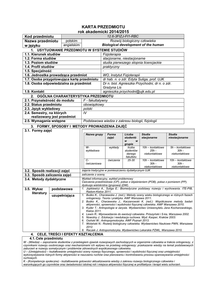 KARTA PRZEDMIOTU rok akademicki 2014/2015 12.6-3FIZJ-FI1-RBC Rozwój biologiczny człowieka polskim Biological development of the human angielskim 1. USYTUOWANIE PRZEDMIOTU W SYSTEMIE STUDIÓW 1.1. Kierunek studiów Fizjoterapia 1.2. Forma studiów stacjonarne, niestacjonarne 1.3. Poziom studiów studia pierwszego stopnia licencjackie 1.4. Profil studiów praktyczny 1.5. Specjalność 1.6. Jednostka prowadząca przedmiot WO, Instytut Fizjoterapii 1.7. Osoba przygotowująca kartę przedmiotu dr hab. n. o zdr. Edyta Suliga, prof. UJK 1.8. Osoba odpowiedzialna za przedmiot Dr n. biol. Agnieszka Przychodni, dr n. o zdr. Grażyna Lis 1.9. Kontakt [email protected] 2. OGÓLNA CHARAKTERYSTYKA PRZEDMIOTU 2.1. Przynależność do modułu F - fakultatywny 2.2. Status przedmiotu obowiązkowy 2.3. Język wykładowy polski 2.4. Semestry, na których IV realizowany jest przedmiot 2.5. Wymagania wstępne Podstawowa wiedza z zakresu biologii, fizjologii Kod przedmiotu Nazwa przedmiotu w języku 3. FORMY, SPOSOBY I METODY PROWADZENIA ZAJĘĆ 3.1. Formy zajęć Nazwa grupy Wwykładowa Cćwiczeniowa 3.2. Sposób realizacji zajęć 3.3. Sposób zaliczenia zajęć 3.4. Metody dydaktyczne 3.5. Wykaz literatury podstawowa uzupełniająca Forma zajęć wykłady ćwiczenia Liczba studentó w w grupie liczba studentów danego fakultetu 25-30 Studia stacjonarne 10h – kontaktowe 25h niekontaktowe Studia niestacjonarne 5h – kontaktowe 30h niekontaktowe 10h – kontaktowe 10h – kontaktowe 30h 30h niekontaktowe niekontaktowe zajęcia tradycyjne w pomieszczeniu dydaktycznym UJK zaliczenie z oceną Wykład informacyjny, wykład problemowy Ćwiczenia przedmiotowe (CP), pokaz z objaśnieniem (POB), pokaz z pomiarem (PP), dyskusja wielokrotna (grupowa) (DW). 1. Jopkiewicz A., Suliga E.: Biomedyczne podstawy rozwoju i wychowania. ITE-PIB, Radom-Kielce 2011. 1. Buśko K., Charzewska J. (red.): Metody oceny wieku biologicznego w różnych fazach ontogenezy. Teoria i praktyka. AWF Warszawa 2011. 2. Buśko K., Charzewska J., Kaczanowski K. (red.): Współczesne metody badań aktywności, sprawności i wydolności fizycznej człowieka. AWF Warszawa 2010. 3. Kuder T.: Antropologia w zarysie. Wydawnictwo Uniwersytetu Jana Kochanowskiego, Kielce 2011. 4. Lewin R.: Wprowadzenie do ewolucji człowieka. Prószyński i S-ka, Warszawa 2002. 5. Nowotny J.: Edukacja i reedukacja ruchowa. Wyd. Kasper, Kraków 2003. 6. Osiński W.: Antropopmotoryka. AWF Poznań 2013. 7. Wolański N.: Rozwój biologiczny człowieka. Wydawnictwo Naukowe PWN, Warszawa 2012. 8. Raczek J. Antropomotoryka. Wydawnictwo Lekarskie PZWL, Warszawa 2010. 4. CELE, TREŚCI I EFEKTY KSZTAŁCENIA 4.1. Cele przedmiotu W - (Wiedza) – zapoznanie studentów z przebiegiem zjawisk rozwojowych zachodzących w organizmie człowieka w trakcie ontogenezy, z czynnikami rozwoju osobniczego oraz mechanizmami ich wpływu na przebieg ontogenezy; przekazanie wiedzy na temat podstawowych zaburzeń w rozwoju somatycznym i problemów zdrowotnych współczesnego człowieka. U – (Umiejętności) – kształtowanie umiejętności oceny rozwoju fizycznego, sprawności i wydolności fizycznej oraz umiejętności wykorzystywania różnych formy aktywności w nauczaniu ruchów oraz planowaniu i kontrolowaniu procesu opanowywania umiejętności ruchowych. K - (Kompetencje społeczne) - kształtowanie gotowości aktualizowania wiedzy z zakresu rozwoju biologicznego człowieka i warunkujących go czynników oraz świadomości istotnej roli i miejsca aktywności fizycznej w profilaktyce i terapii wielu schorzeń. 4.2. Treści programowe Lp. W1 W2 W3 W4 W5 W6 Lp. C1 C2 C3 C4 C5 C6 C7 C8 Tematy wykładów Liczba godzin Podziału ontogenezy na okresy. Charakterystyka wybranych etapów rozwoju. Czynniki rozwoju osobniczego (cz. paragenetyczne, biogeograficzne, społecznoekonomiczne). Rola racjonalnego żywienia w poszczególnych etapach rozwoju ontogenetycznego. Problem otyłości. Tendencja przemian międzypokoleniowych. Miejsce człowieka w świecie istot żywych. Etapy antropogenezy. Anatomiczne przystosowania człowieka do dwunożności. Razem Tematy ćwiczeń Aspekty rozwoju. Czynniki rozwoju osobniczego (cz. genetyczne, tryb i styl życia). Rozwój struktury i funkcji w poszczególnych etapach ontogenezy. Kryteria podziału ontogenezy na okresy. Charakterystyka okresów rozwojowych. Rozwój motoryczny człowieka w kolejnych etapach ontogenezy. Etapy opanowywania czynności ruchowych. Rodzaje aktywności ruchowej. Wykorzystywanie różnych form aktywności w nauczaniu ruchów oraz planowaniu i kontrolowaniu procesu opanowywania umiejętności ruchowych. Wiek kalendarzowy a wiek rozwojowy. Kryteria oceny wieku rozwojowego. Metody oceny rozwoju fizycznego i funkcjonalnego na różnych etapach rozwoju człowieka. Zaburzenia w rozwoju somatycznym i problemy zdrowotne w poszczególnych etapach ontogenezy. Razem kod 4.3. Przedmiotowe efekty kształcenia (liczba efektów: 4 - mała) Student, który zaliczył przedmiot Stopień kod nasycenia efektu przedmiotowego [+] [++] [+++] 2 1 1 1 2 10 1 1 5 Liczba godzin stacjonarne 2 1 1 1 niestacjonarne 2 1 1 1 1 1 1 2 1 2 1 1 10 10 Odniesienie do efektów kształcenia dla obszaru umie opisać proces rozwoju osobniczego od dzieciństwa poprzez dojrzałość do starości, posiada wiedzę na temat rozwoju narządów i całego organizmu posiada ogólną wiedzę dotyczącą funkcjonowania poszczególnych układów człowieka: krążenia, oddychania, wydalniczego, endokrynologicznego, narządów zmysłu oraz narządu ruchu człowieka OM1_W01 FIZJ1P_U12 potrafi wskazać podłoże i wyjaśnić kształtowanie się kontroli postawy ciała, wzorców ruchowych, nawyków ruchowych OM1_U04 FIZJ1P_K21 potrafi propagować i aktywnie kreować zdrowy styl życia i promocję zdrowia OM1_K09 W01 Potrafi scharakteryzować zmiany rozwojowe zachodzące w kolejnych etapach ontogenezy człowieka. ++ FIZJ1P_W01 W02 Zna podstawy rozwoju i funkcjonowania aparatu ruchu, układów krą